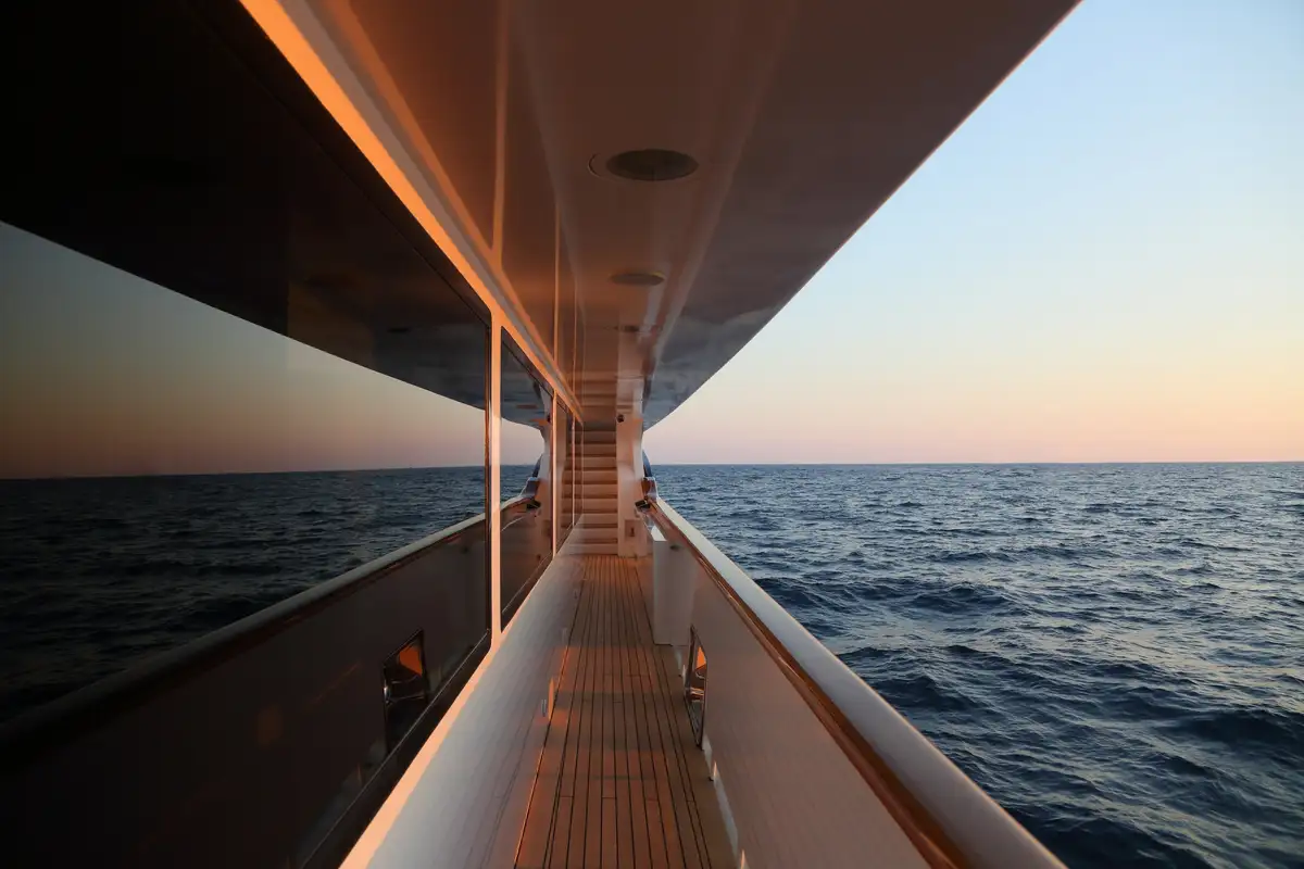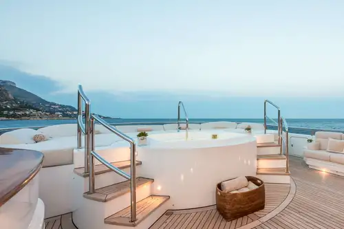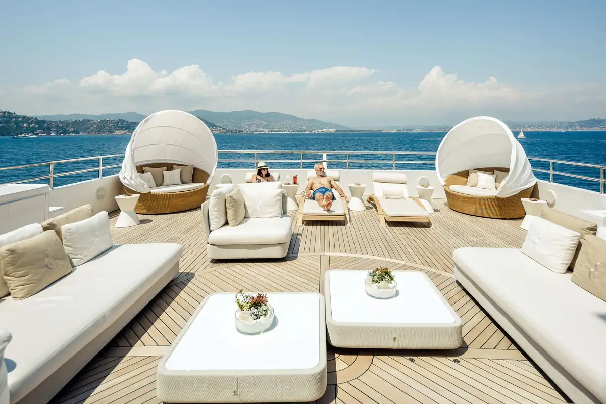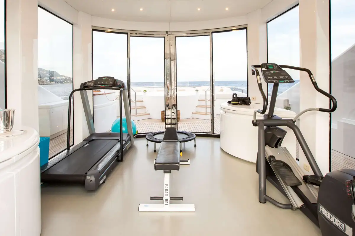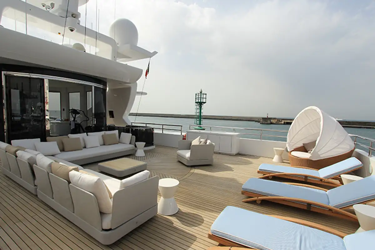 The huge sun deck features a bar and jacuzzi forward, with large sun pads for lounging in peace and isolation. A climate controlled, glasswalled gym with panoramic views is positioned amidships, while vast modular sofas, sun beds and two loveseats with retractable canopies allow all guests to relax in one place. The sun deck is a spectacular spot for entertaining, but as night draws in guests may choose to retire to the more formal setting of the main saloon, or the relaxed, comfortable sky lounge on the bridge deck.