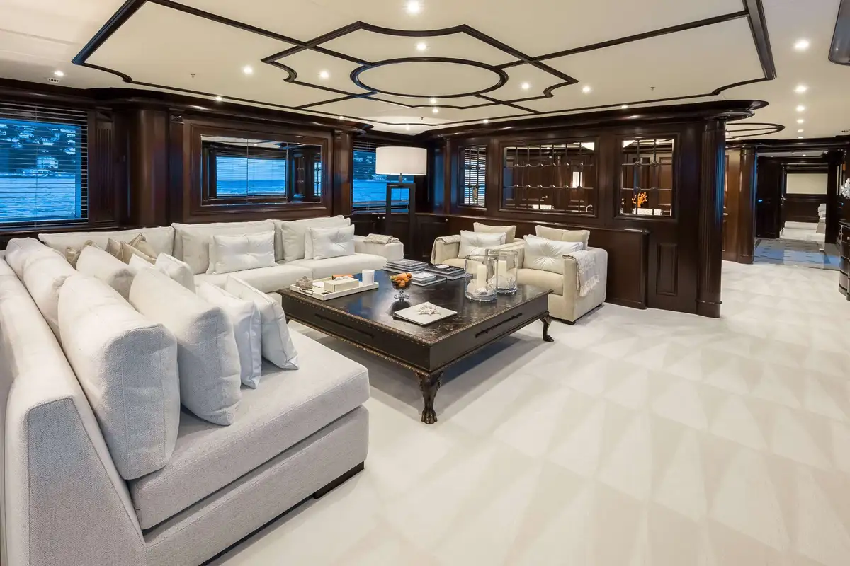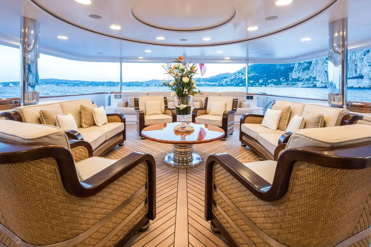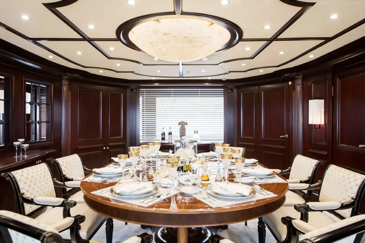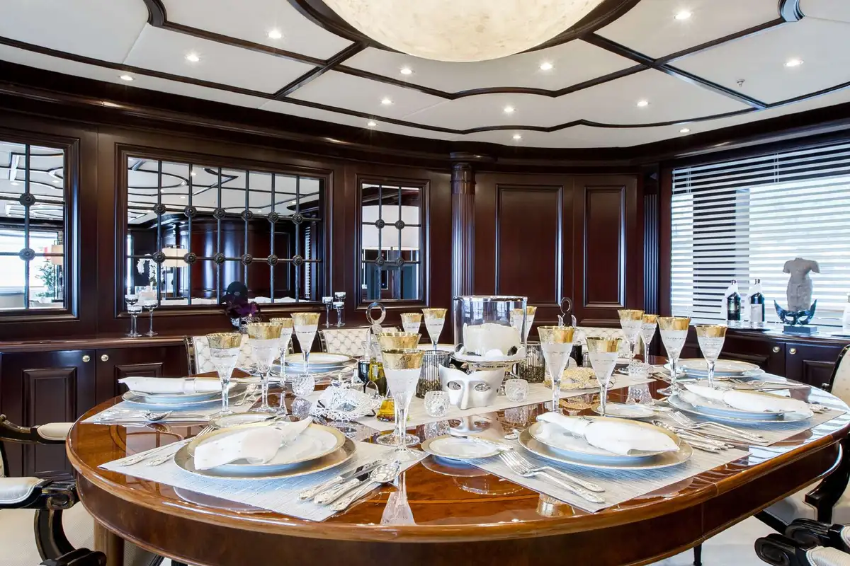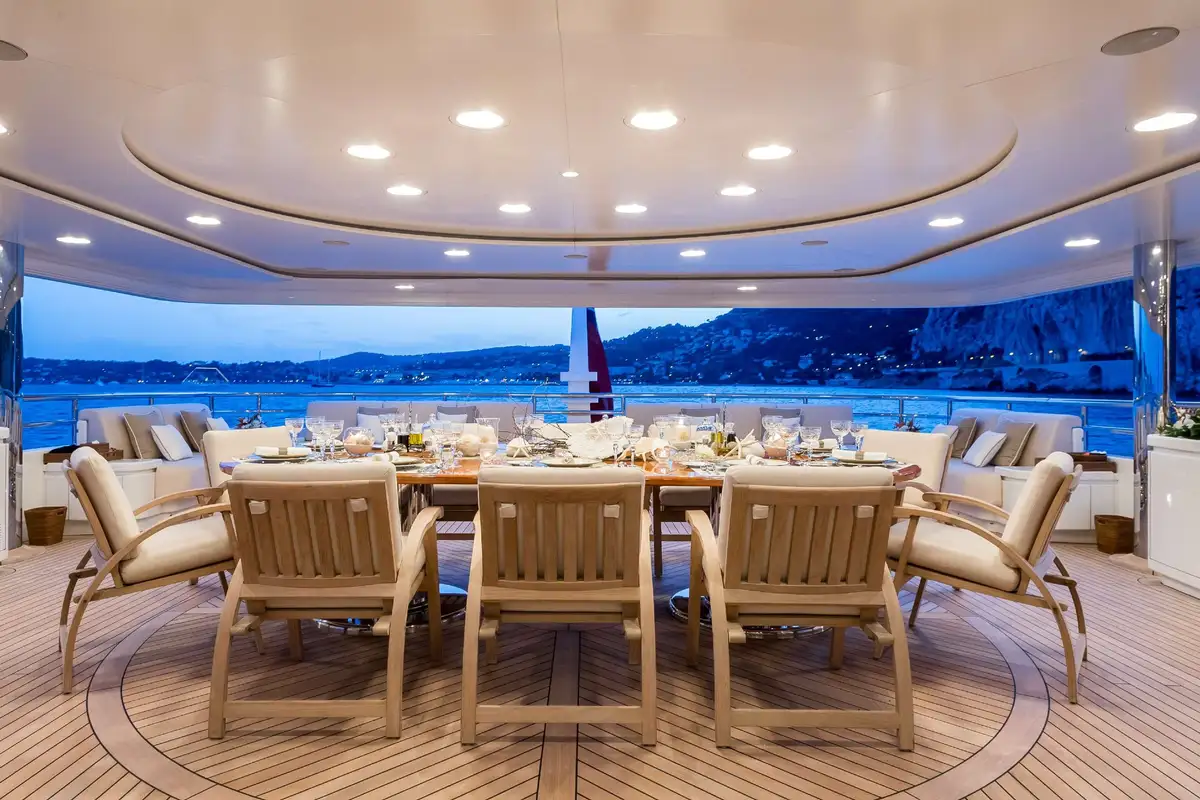The sophisticated, traditionally furnished main saloon with its plush, luxurious sofas and beautifully carved coffee tables leads into the dining area. Sectioned off by a curving screen wall, the dining table becomes an intimate space for family and friends to sample the chef's bespoke menu. The sky lounge becomes an informal space where guests can lounge on the deep sofas or take a seat at the bar for a predinner drink, before moving out to the aft deck for an al fresco meal laid out by the crew.