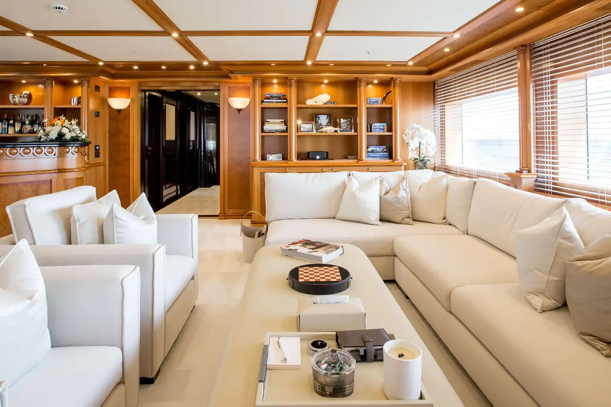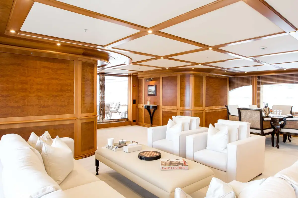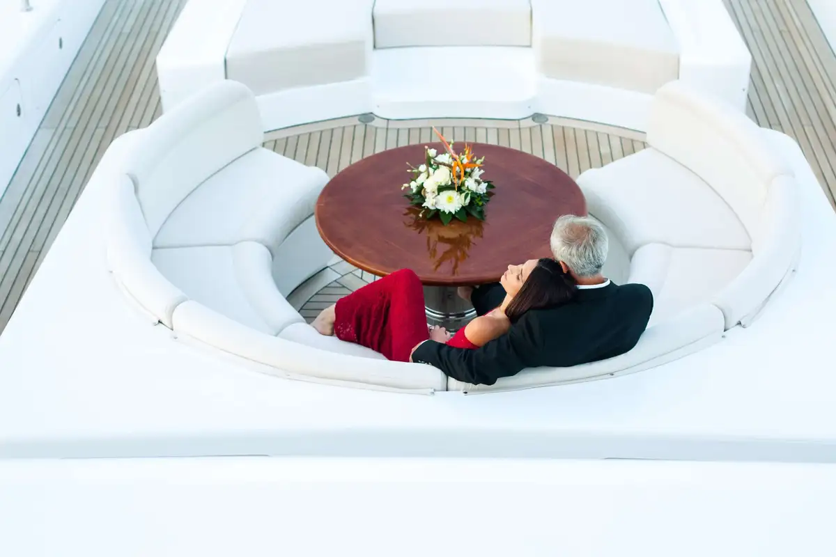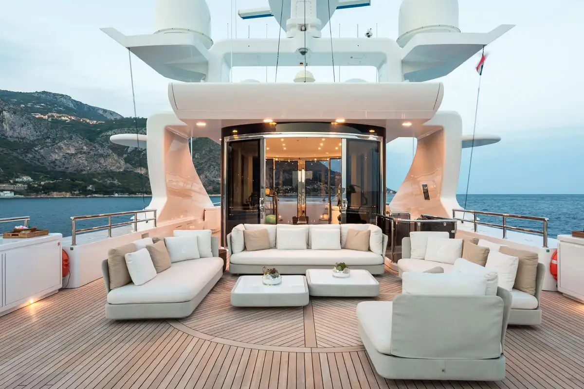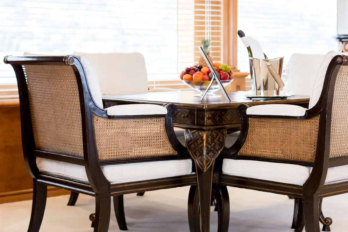 The sophisticated, traditionally furnished main saloon with its plush, luxurious sofas and beautifully carved coffee tables leads into the dining area. Sectioned off by a curving screen wall, the dining table becomes an intimate space for family and friends to sample the chef's bespoke menu. The sky lounge becomes an informal space where guests can lounge on the deep sofas or take a seat at the bar for a predinner drink, before moving out to the aft deck for an al fresco meal laid out by the crew.