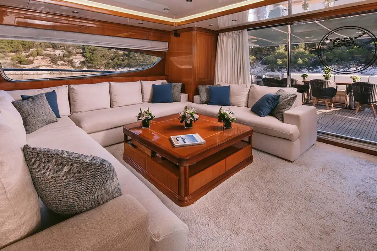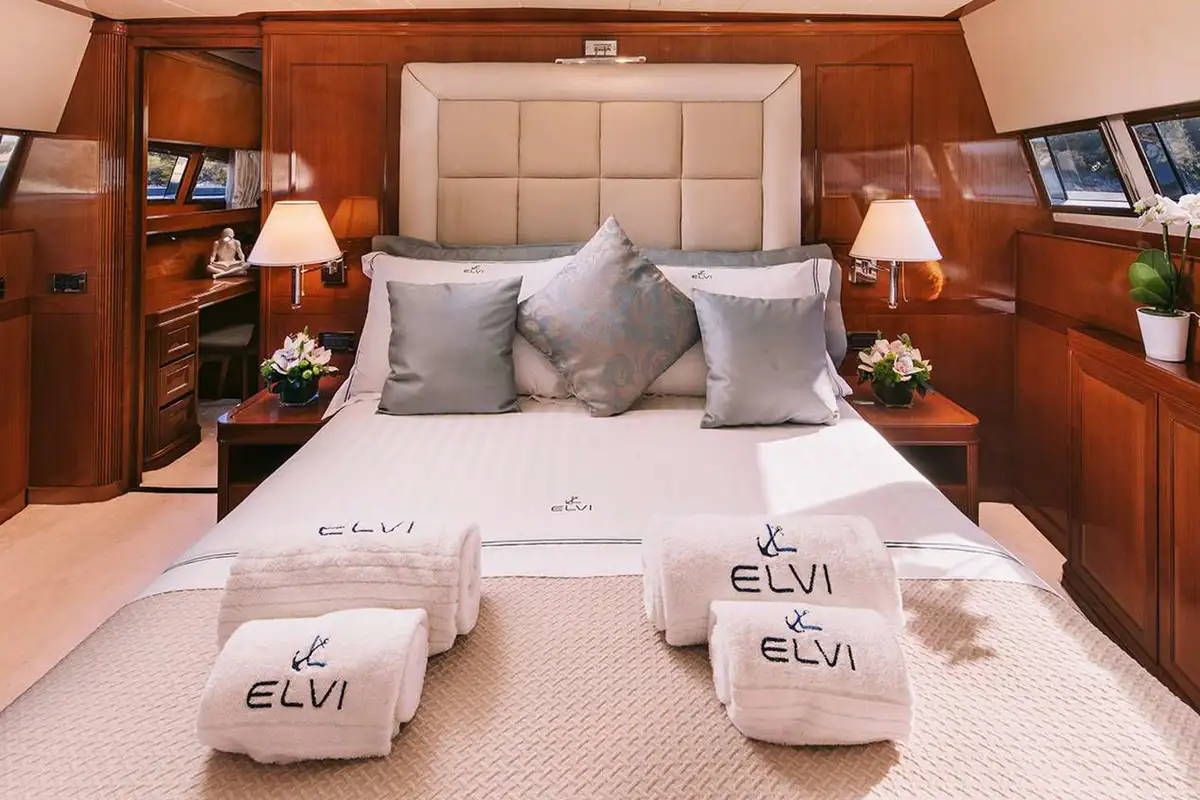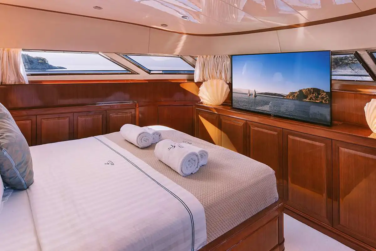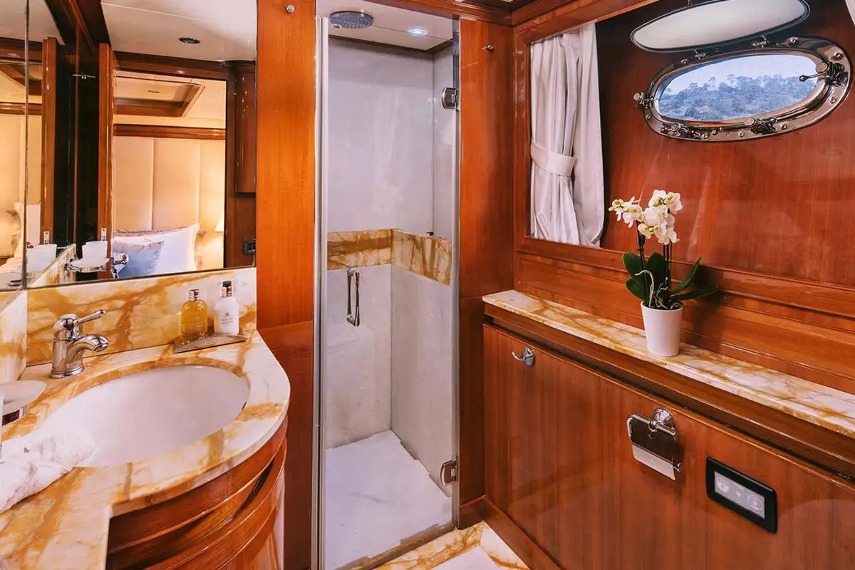 Her interior is smart and modern, finished in a soft, neutral palette with accents of polished wood and marble. The full-beam master cabin, located forward on the main deck, features a king-size bed, generous storage, a marble bathtub, and panoramic windows. Below deck, four guest suites provide versatile accommodation for up to 11 guests – two convertible VIP doubles can be opened into a large suite, while two twin cabins (one with a pullman berth) make her especially well-suited to families or mixed charter groups. Each cabin offers the same high-standard spec.