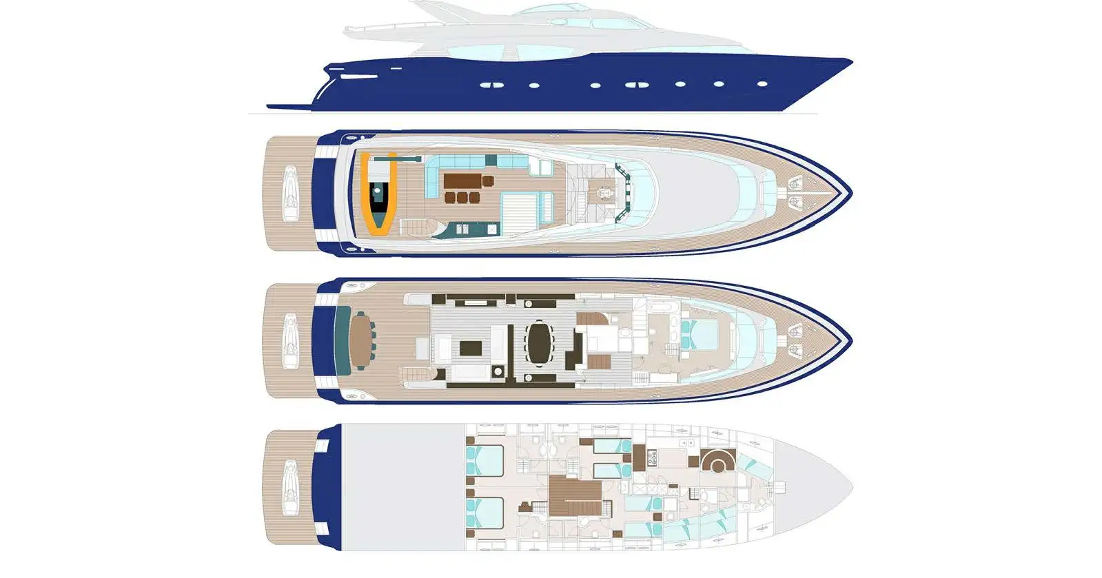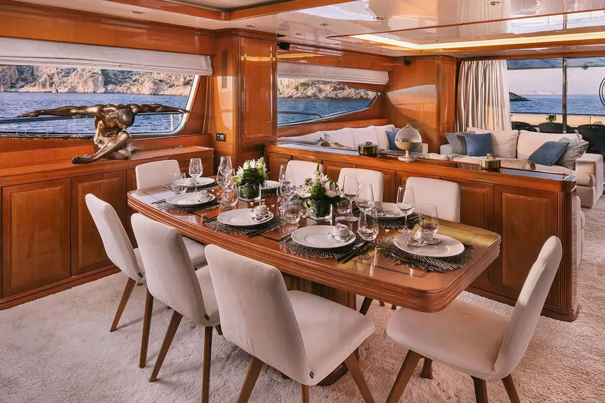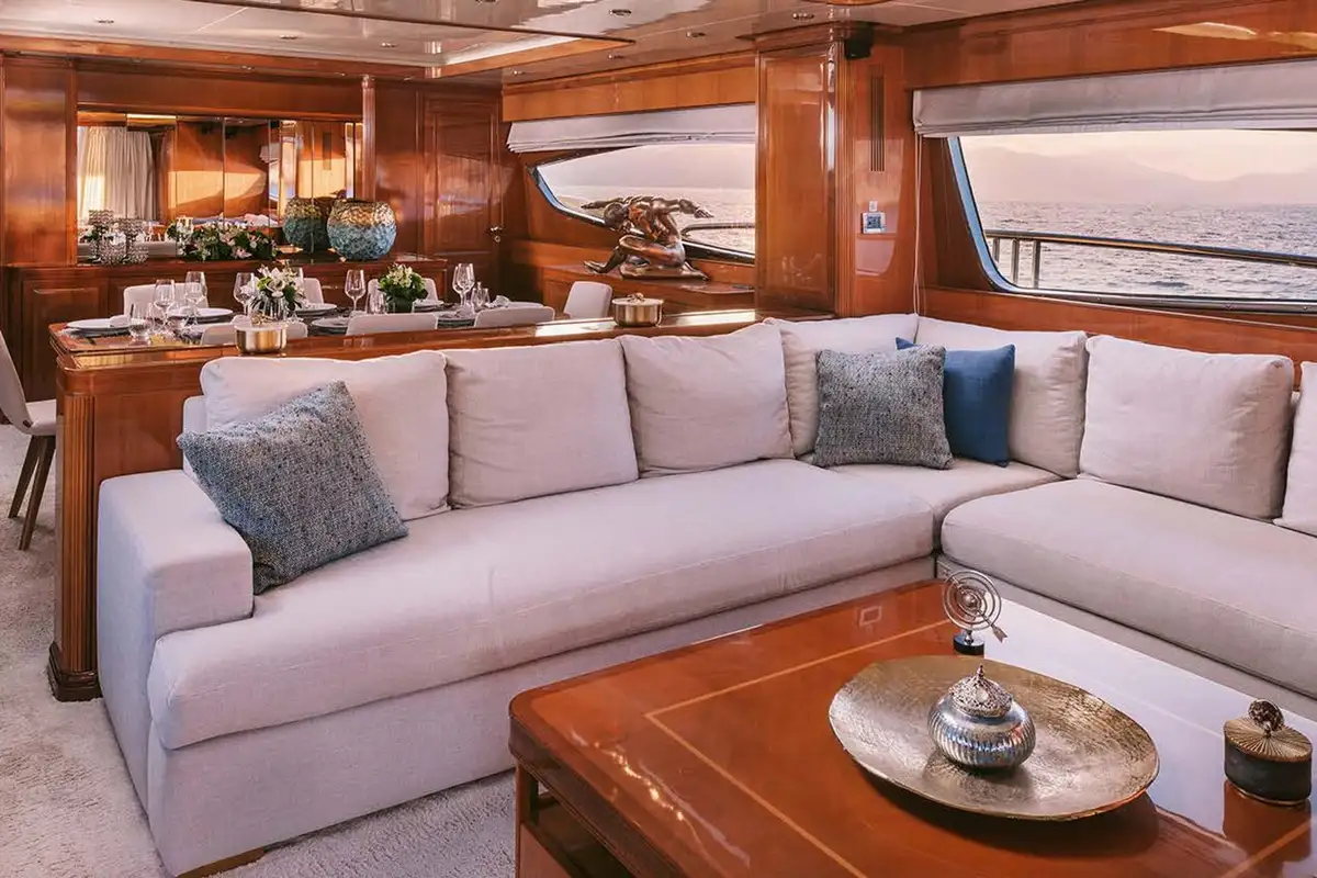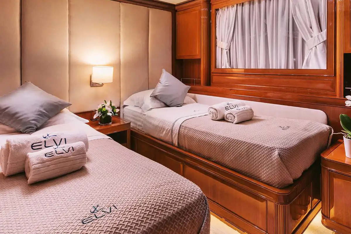 Her interior is smart and modern, finished in a soft, neutral palette with accents of polished wood and marble. The full-beam master cabin, located forward on the main deck, features a king-size bed, generous storage, a marble bathtub, and panoramic windows. Below deck, four guest suites provide versatile accommodation for up to 11 guests – two convertible VIP doubles can be opened into a large suite, while two twin cabins (one with a pullman berth) make her especially well-suited to families or mixed charter groups. Each cabin offers the same high-standard spec.