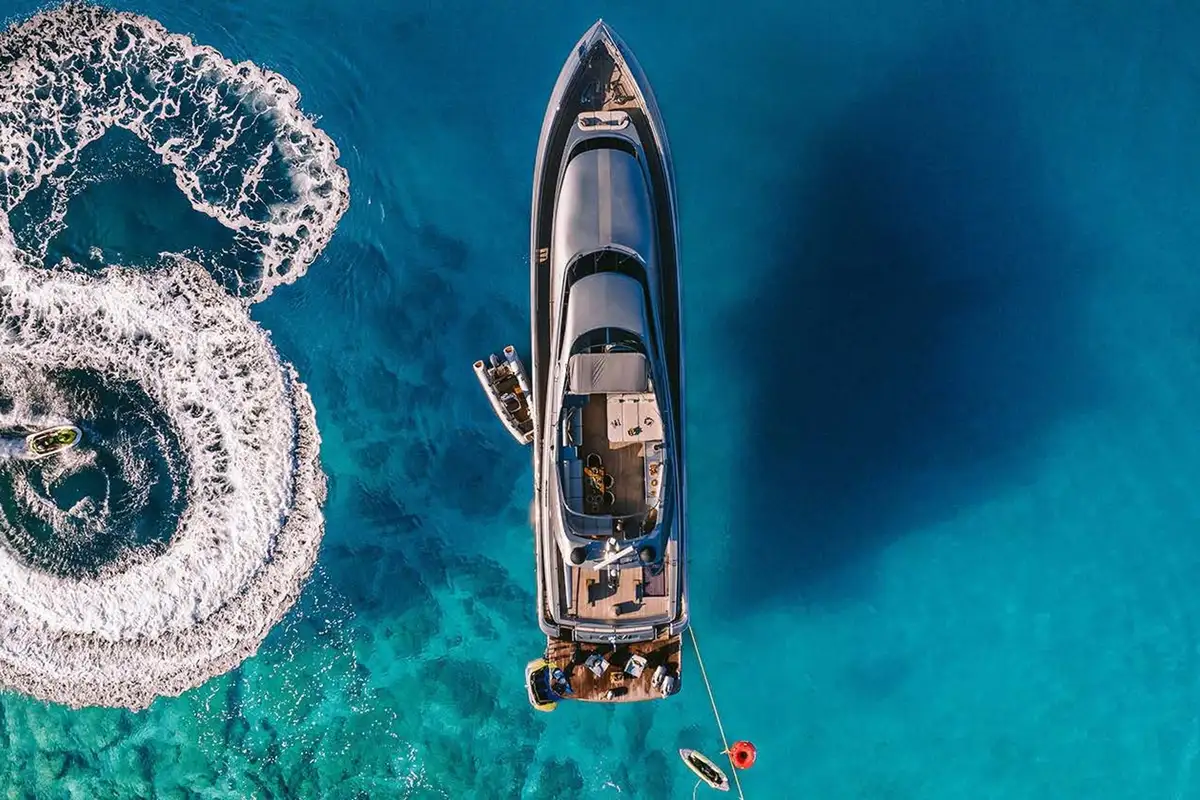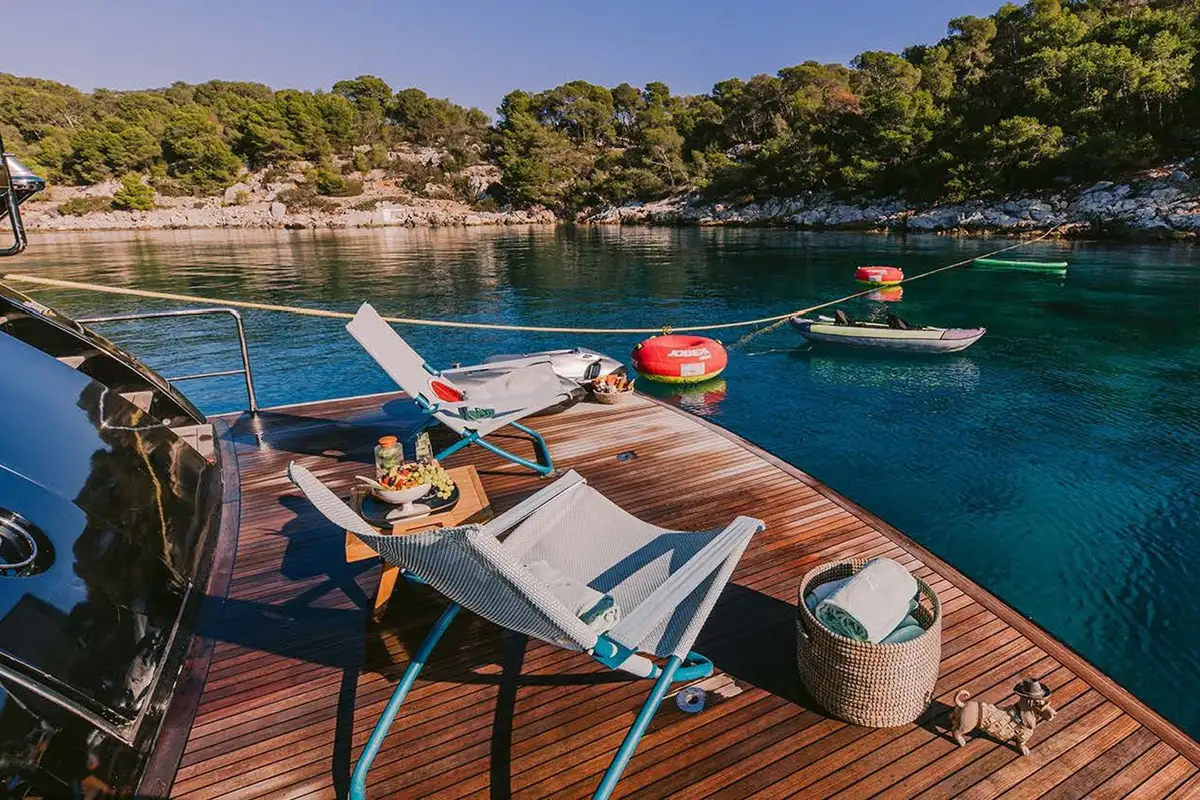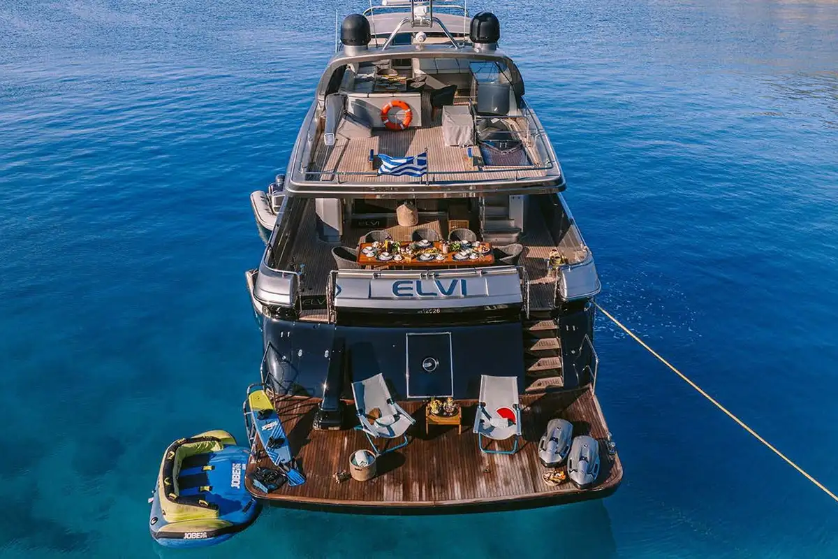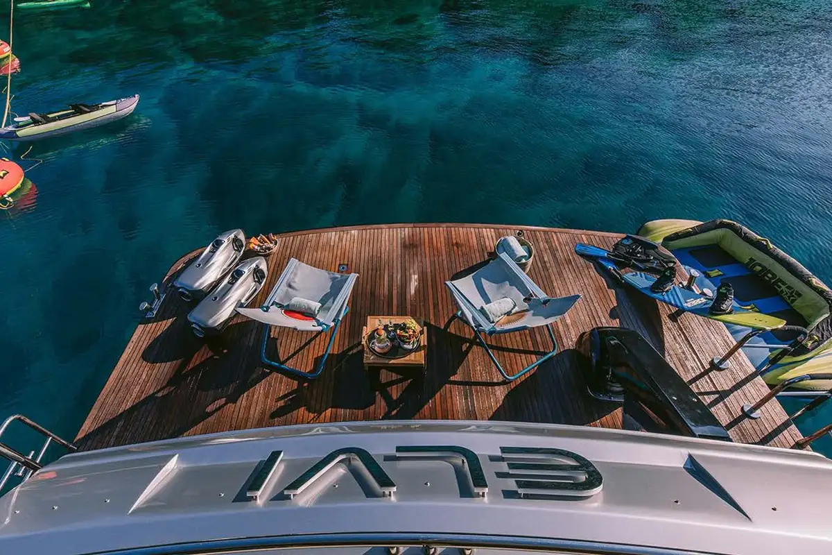 ELVI cuts through the water at up to 30 knots, driven by twin MTU engines. A cruising speed of 23 knots and a shallow draft make her ideal for island-hopping and discovering tucked-away anchorages. The yacht’s 4.5m (14.9ft) tender, equipped with a 70hp engine, is perfect for waterskiing, wakeboarding, or trips ashore. The spacious swim platform becomes a natural launchpad for days on the water, with an exciting selection of toys including jetski, SeaBobs, waterskis, wakeboard, inflatables, SUP, kayak, and more.