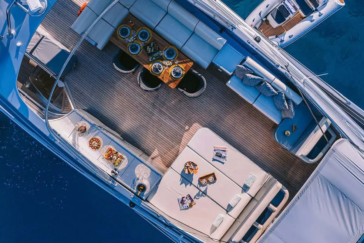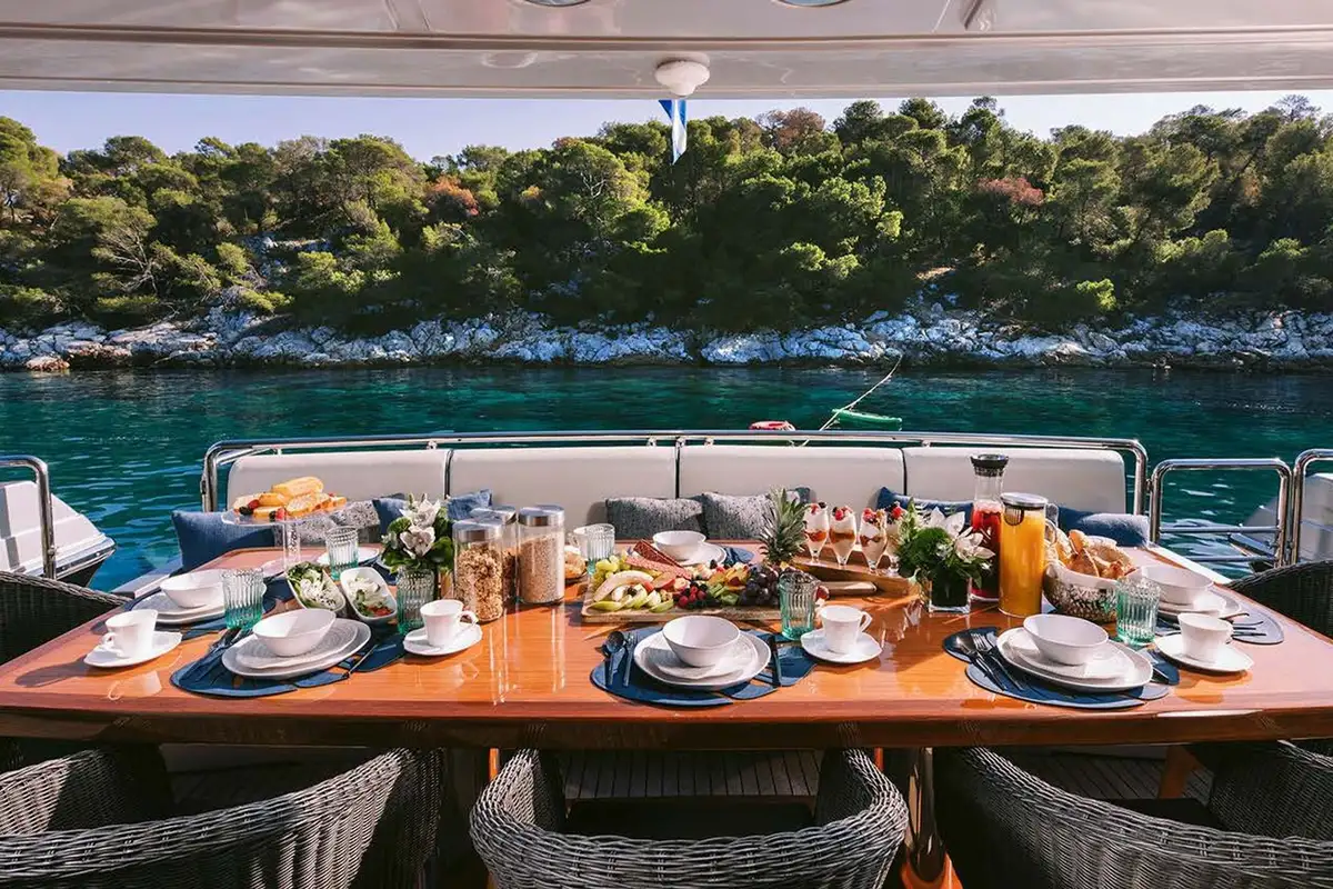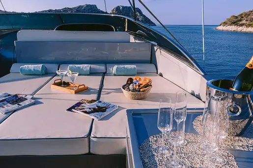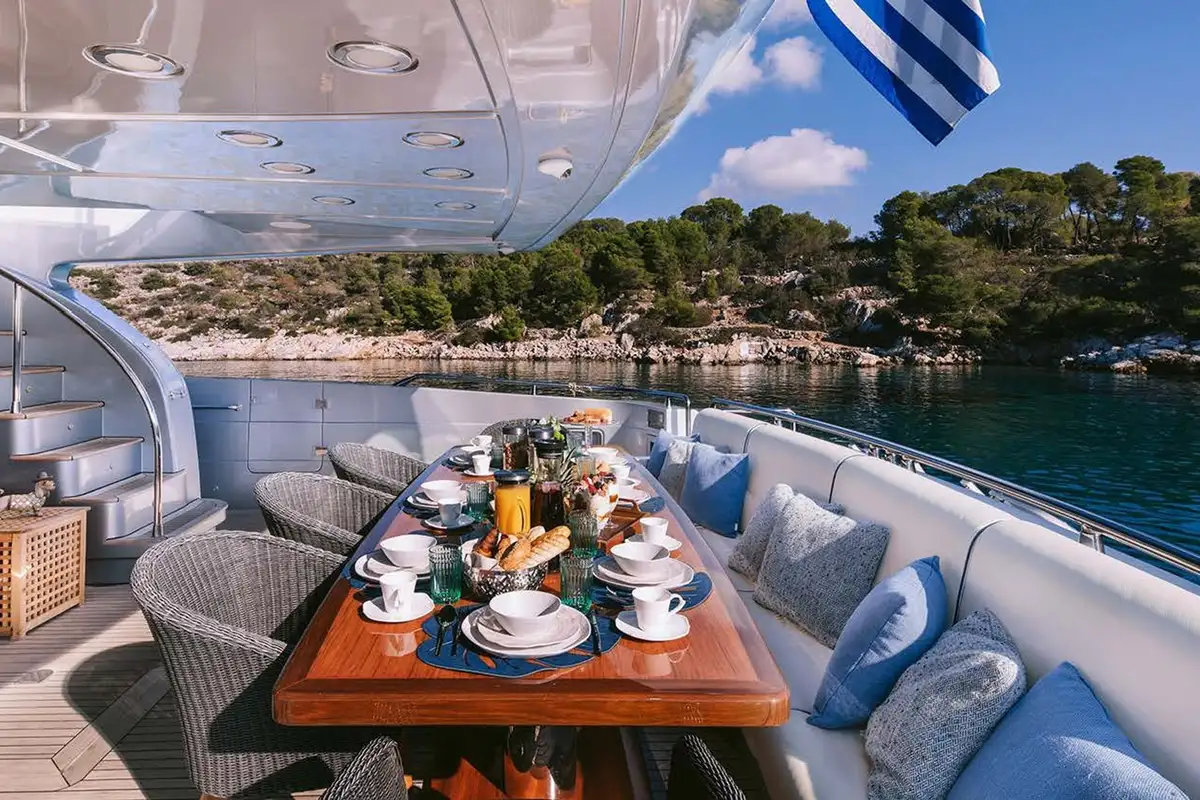 Outdoor living is a key part of this yacht’s charm. The sun-drenched flybridge includes a bar, grill, and wide lounge area, while the foredeck is a quiet spot for morning coffee or sunset views. The main aft deck is perfect for relaxed al fresco dining, and the crew of six friendly professionals delivers a seamless service throughout, led by an experienced captain with deep local knowledge of the Greek islands.