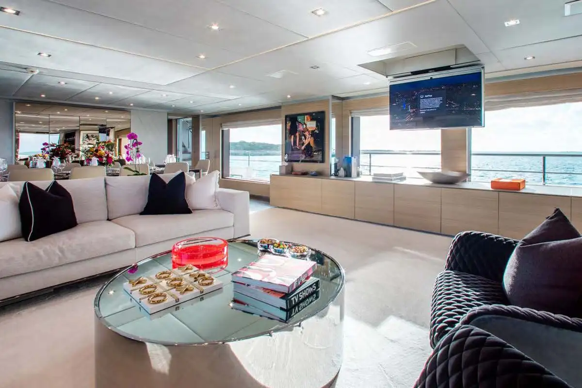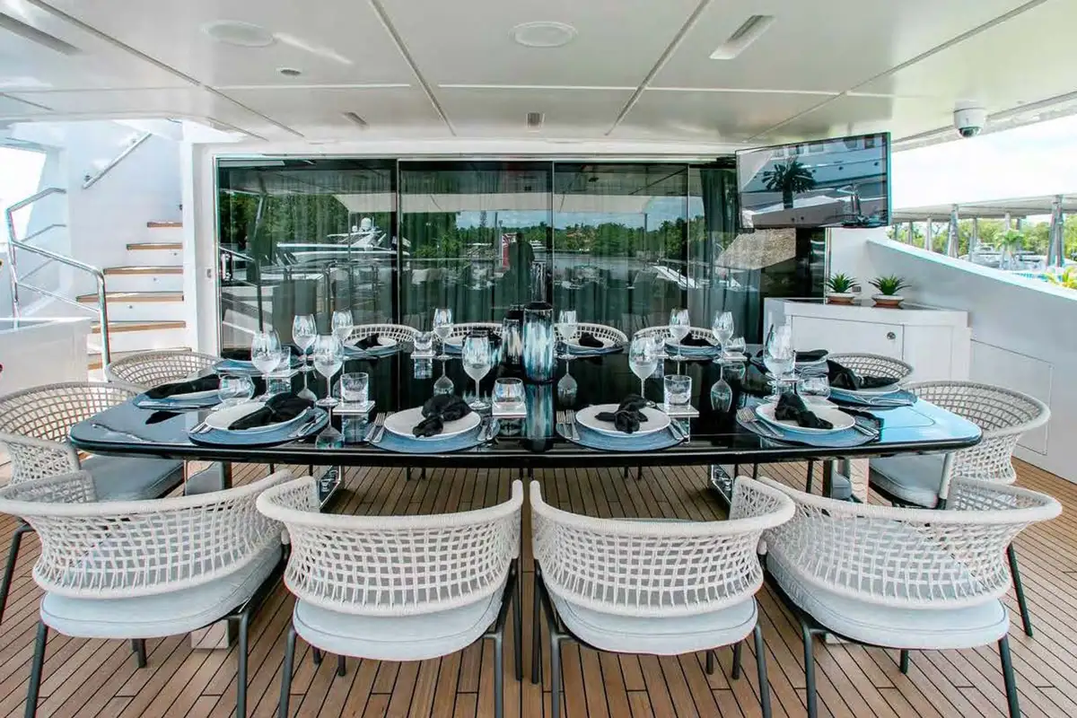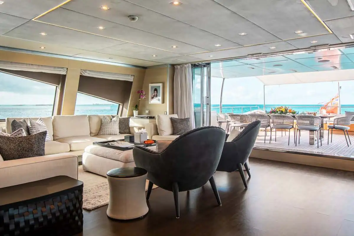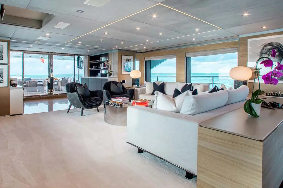 Step inside the bright lounge, where light tones and plush sofas offer a calming contrast. Picture windows run the length of the saloon, flooding the space with daylight and uninterrupted views. A formal dining table forward offers a delightful setting in which to enjoy fine dining. On the main aft deck, spacious seating sets the tone for relaxed afternoons and elegant evenings.