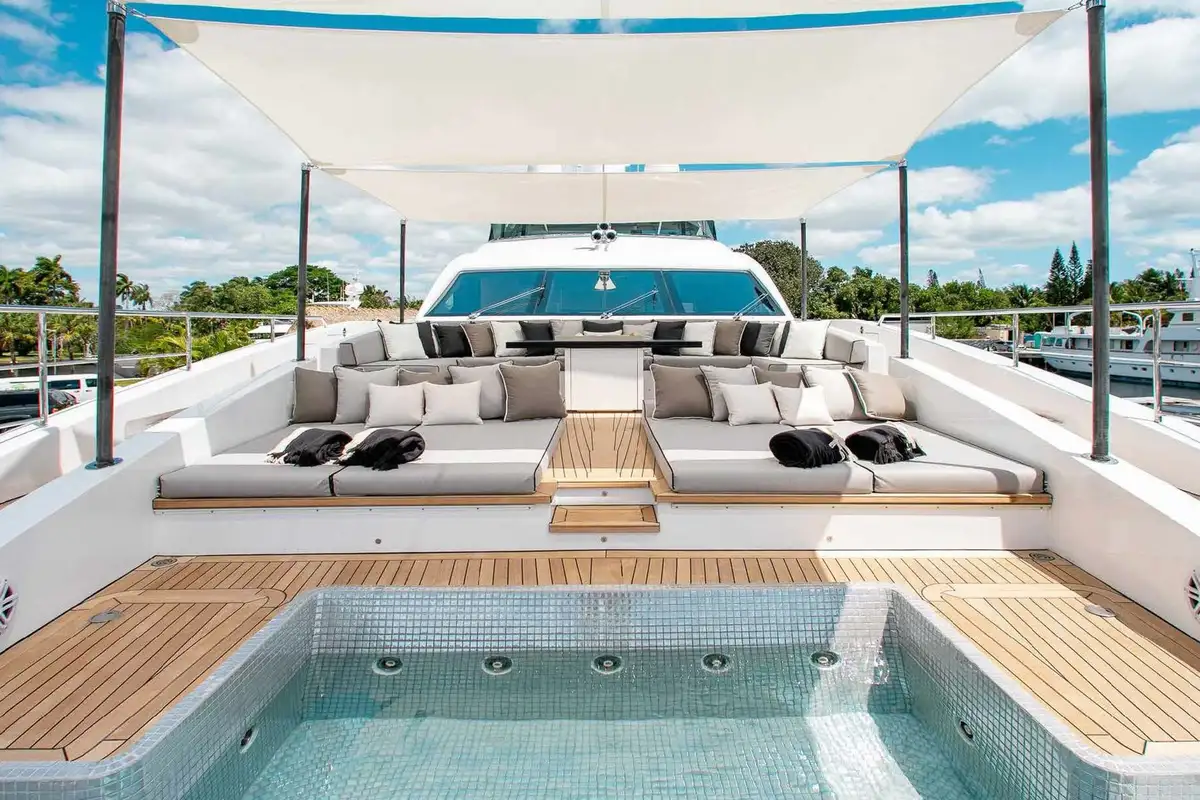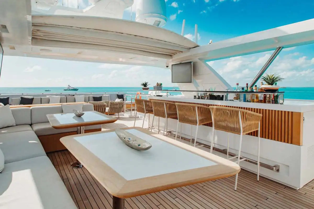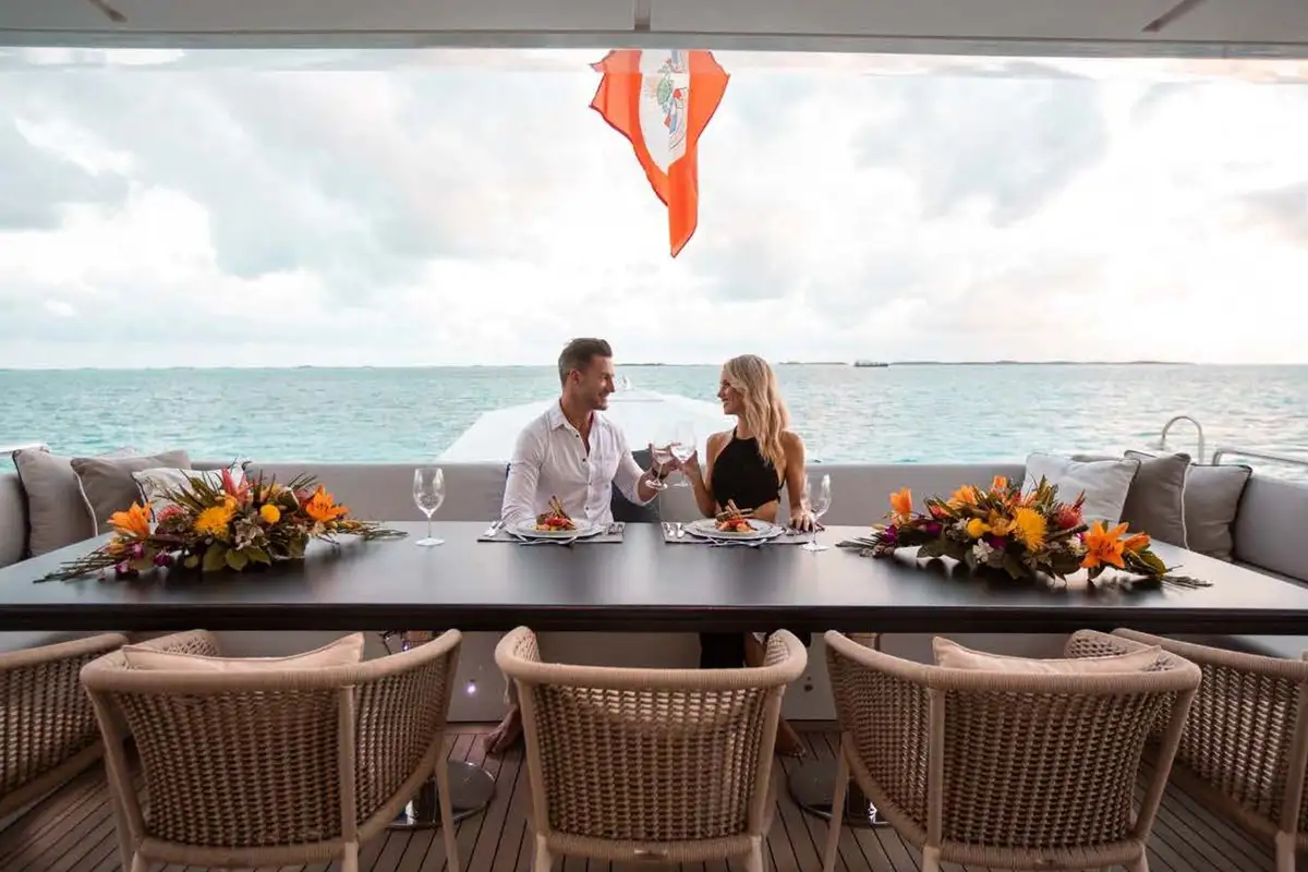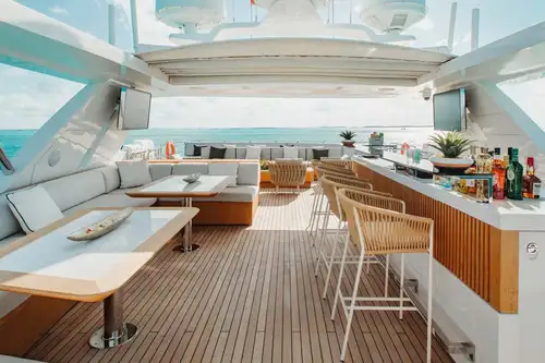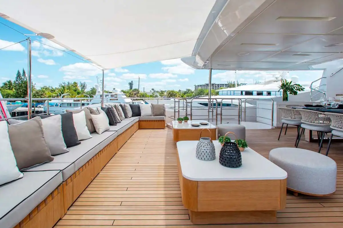 Step inside the bright lounge, where light tones and plush sofas offer a calming contrast. Picture windows run the length of the saloon, flooding the space with daylight and uninterrupted views. A formal dining table forward offers a delightful setting in which to enjoy fine dining. On the main aft deck, spacious seating sets the tone for relaxed afternoons and elegant evenings.
