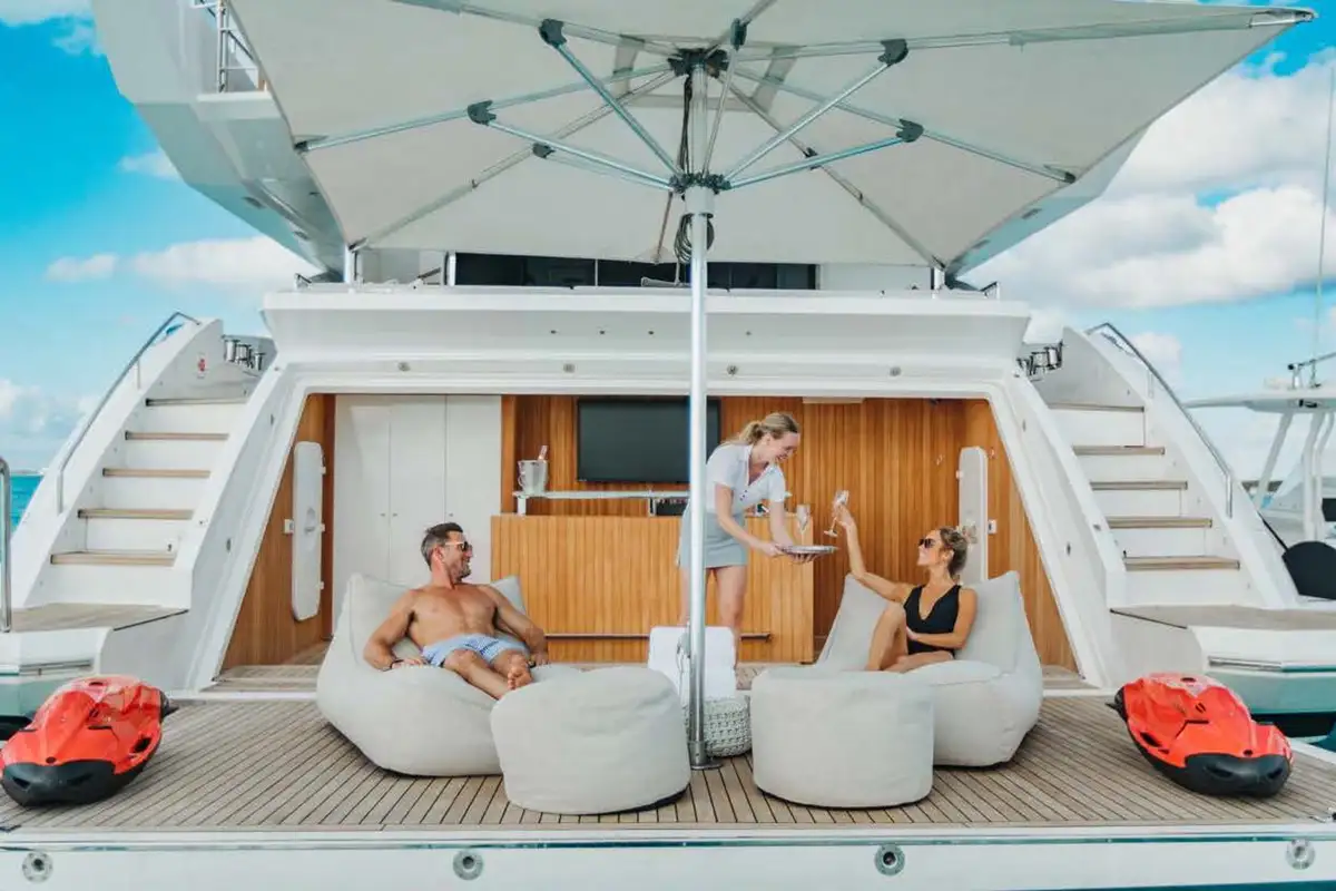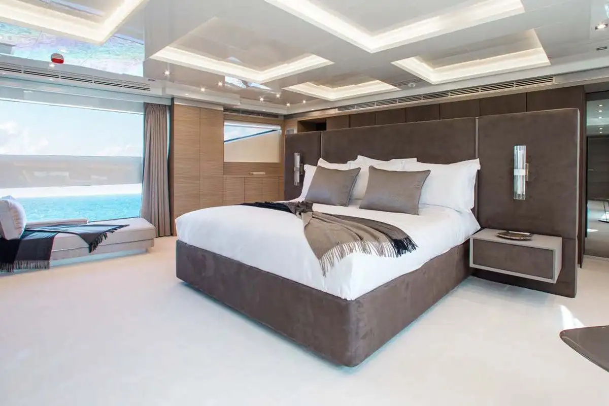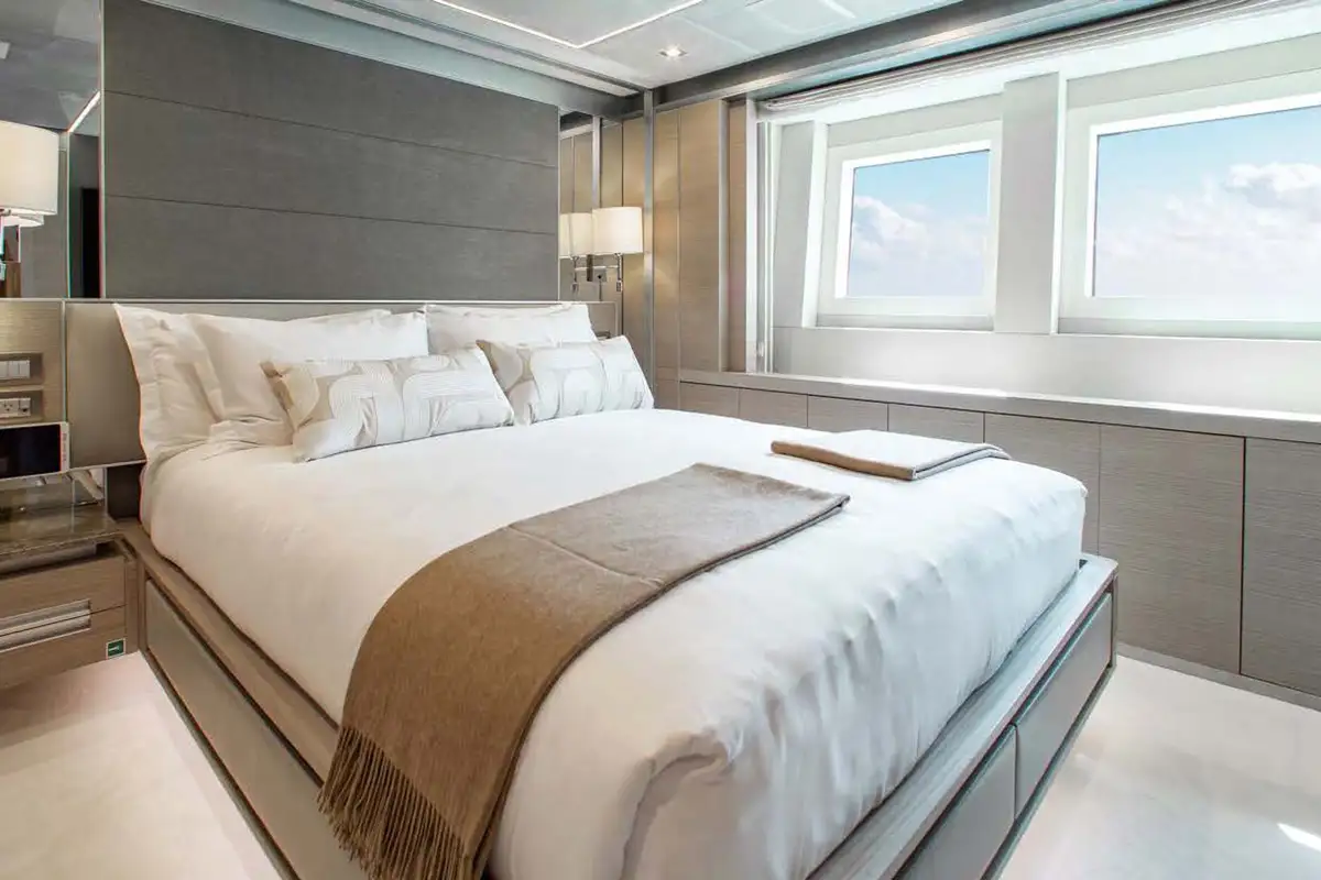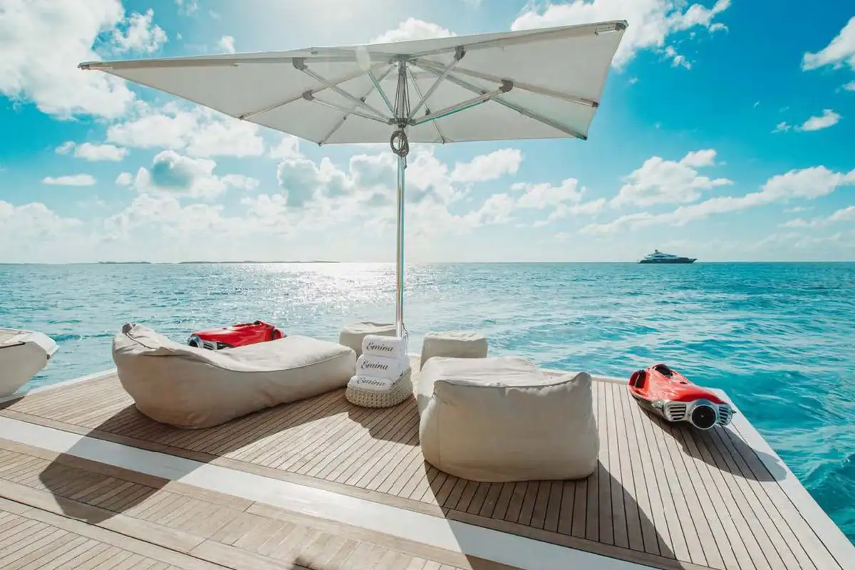 Those who enjoy watersports will love EMINA’s fold-down transom and beach club area. They provide easy access to the sea and an impressive collection of toys and tenders. These include a 32ft Intrepid tow tender, two Sea-Doo Sparks, three SeaBobs, wakeboards, inflatable tows, snorkelling gear, paddleboards, an Efoil and more.