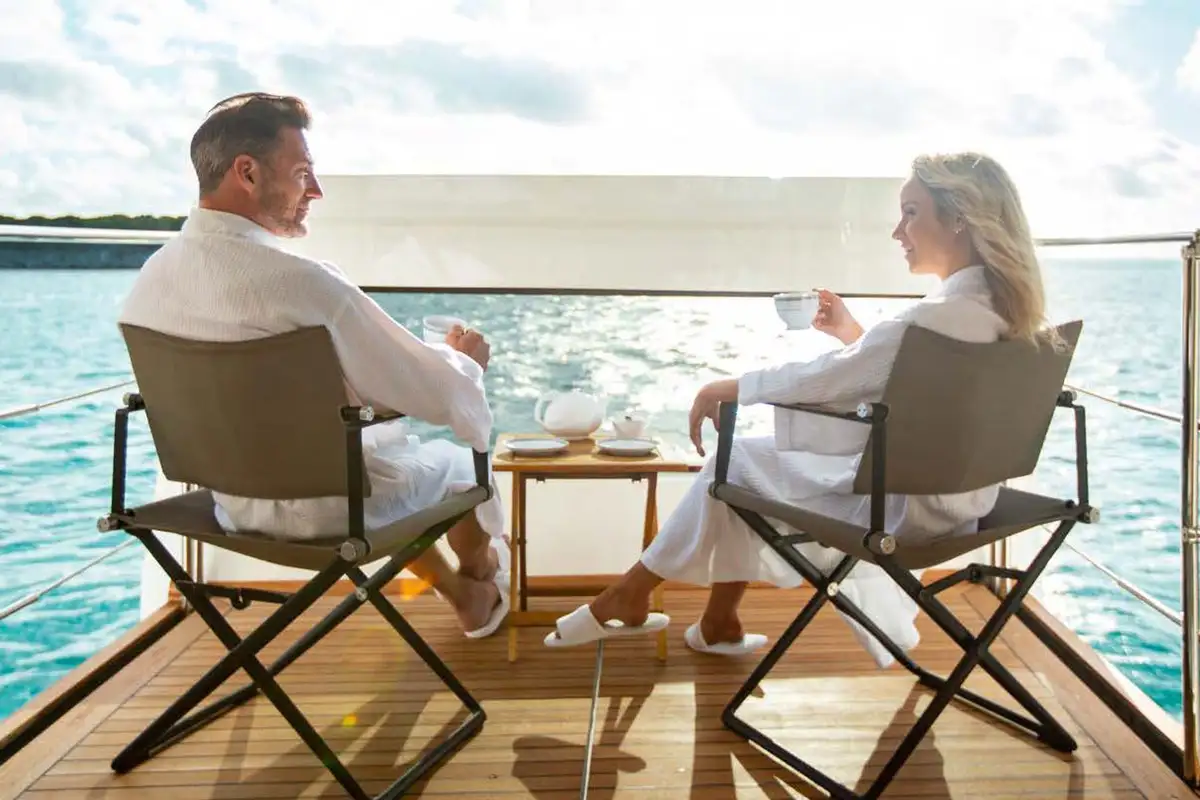EMINA’s foredeck is another standout area, with forward-facing sunpads, a jacuzzi, and a sociable seating area perfectly positioned for panoramic views. Moving aft on the upper deck, the sky lounge transforms into a cinema with sumptuous U-shaped seating, leading out to an elevated al fresco dining terrace – perfect for sunset dinners or celebrations under the stars.