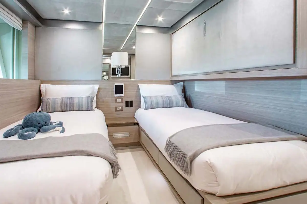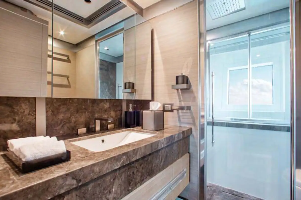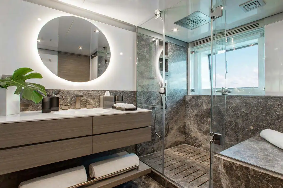 Your master suite is also on the main deck; just stroll through your private office and dressing area. This secluded space expands with fold-down balconies – ideal for morning coffee or a quiet breakfast with exceptional views. The full-beam en suite bathroom offers a serene retreat to unwind in your private space.