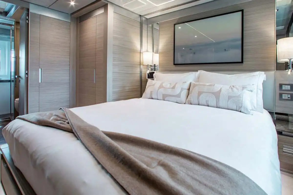 During the day, the sun deck offers a relaxed setting. This space centres around a stylish cocktail bar. Twin TVs mean you can keep up with live sport from the bar or dinette seating opposite. The full-beam lounge area and sunpad that stretches across the aft section complete this casual space.