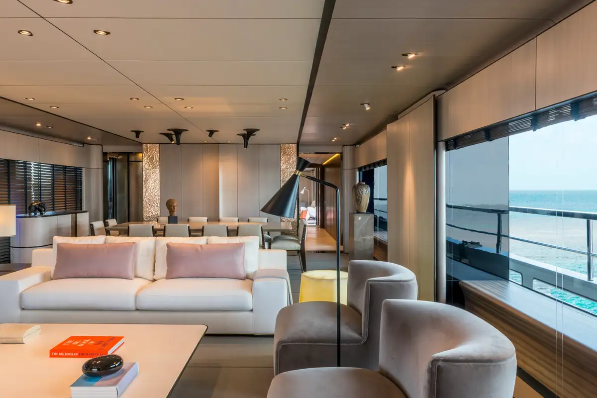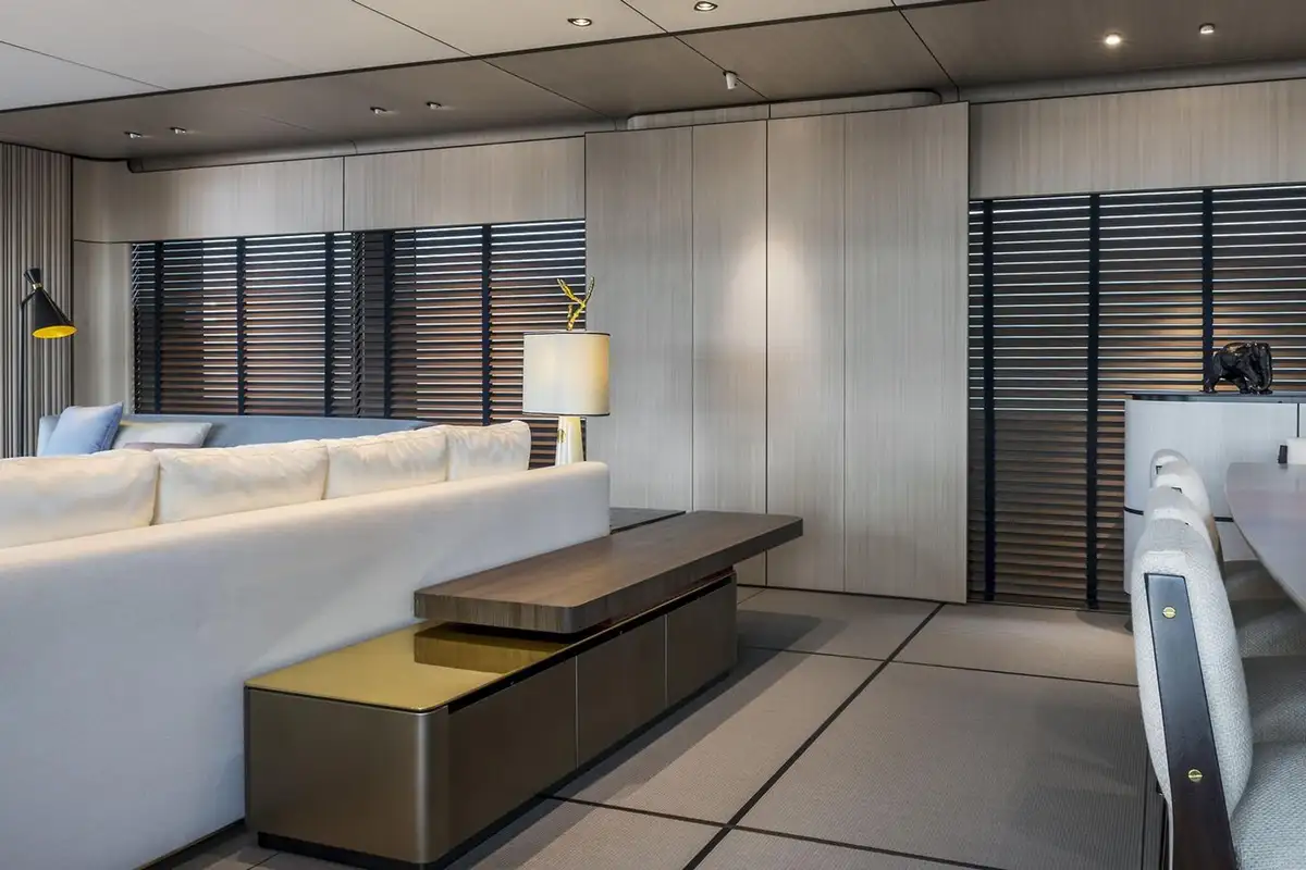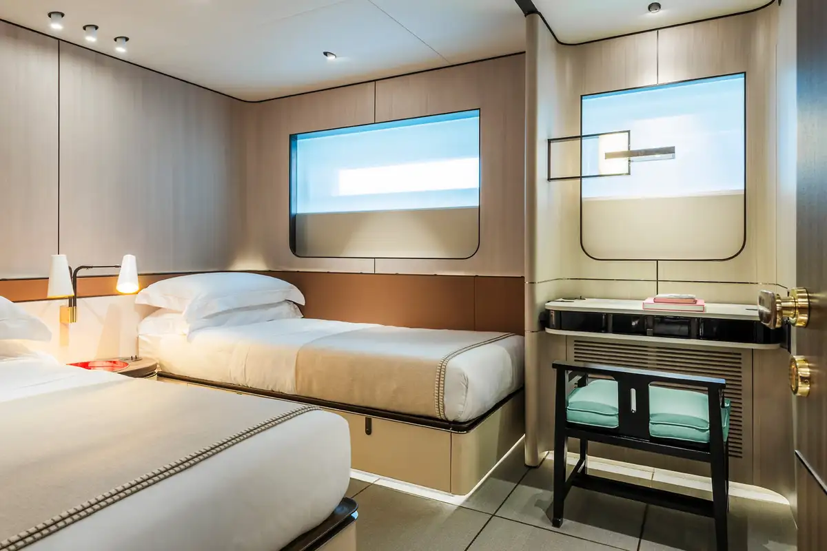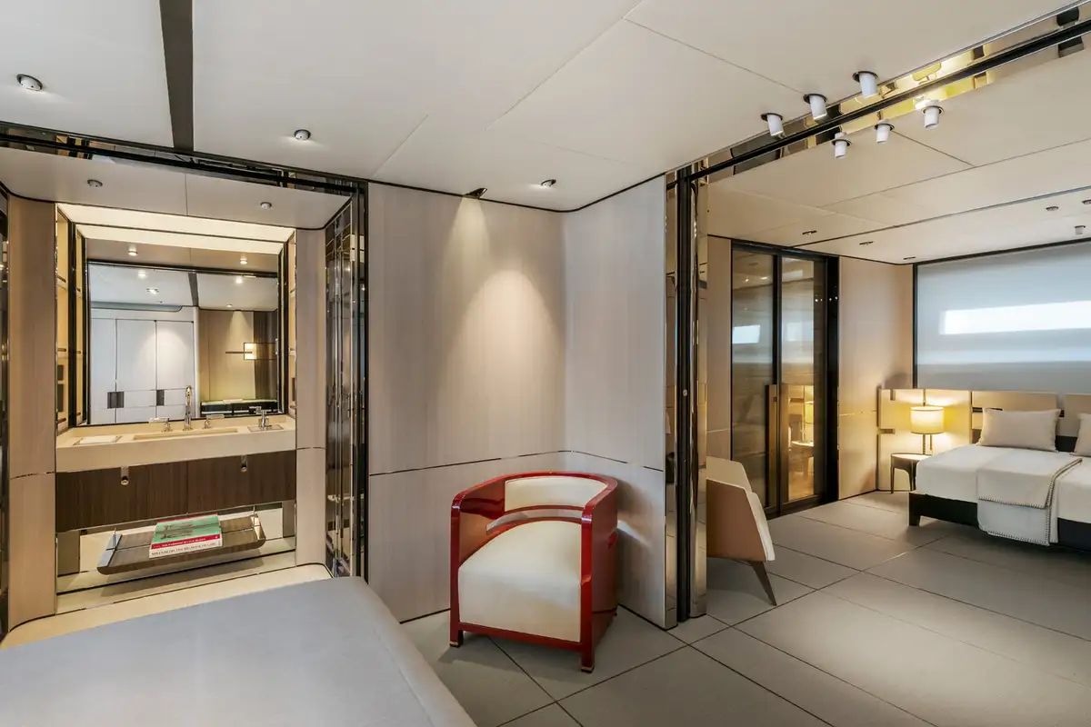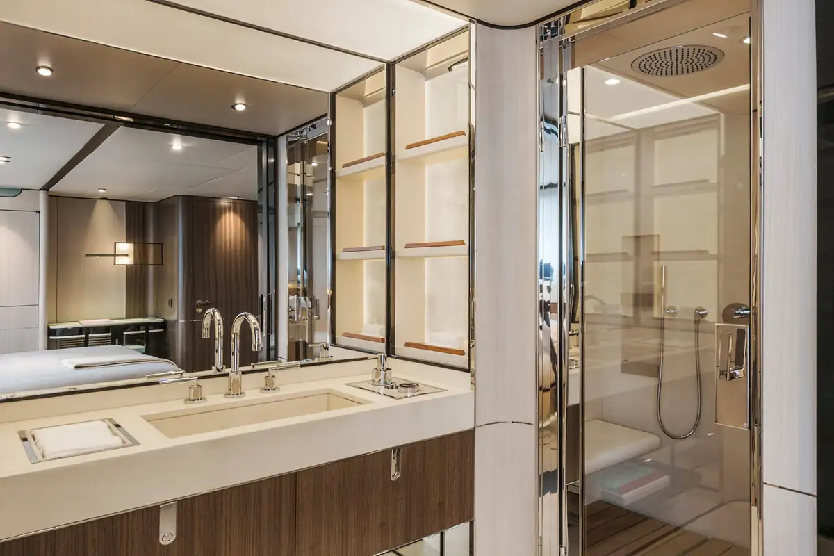 The generous full-beam master suite is located forward on the main deck and offers plenty of light and a wonderful panorama thanks to the large windows at either side, essentially bringing the outdoors inside. The owner's suite features a private balcony as well as a huge walk-in shower. The two equal-sized twin cabins with en suite facilities and the convertible VIP cabin are located on the lower deck. The VIP cabin can either be used as one large suite with private lounge or if separated by means of a large sliding door as two cabins, with en suite facilities. The VIP lounge features a sofa which can be converted into a smaller bed. This bed is comfortable for two children.