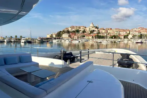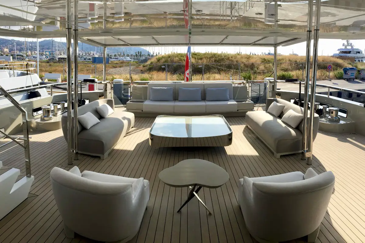 The yacht's profile is characterized by a broad use of windows ensuring magnificent floor to ceiling panoramic views. The outside dining area with extendable table for up to 12 guests is located on the upper deck, while the main deck aft is equipped with comfortable seating and an enclosed bimini for protection in bad weather.