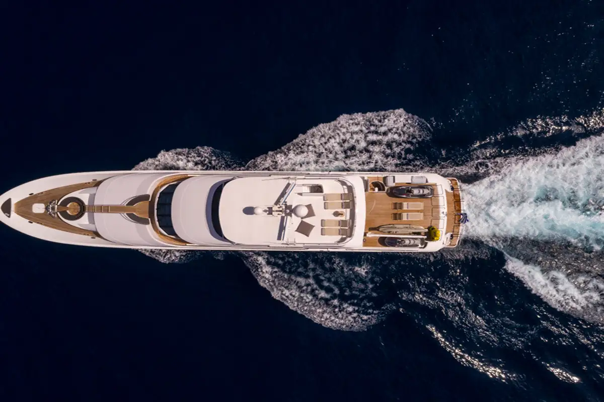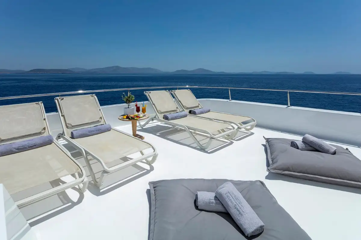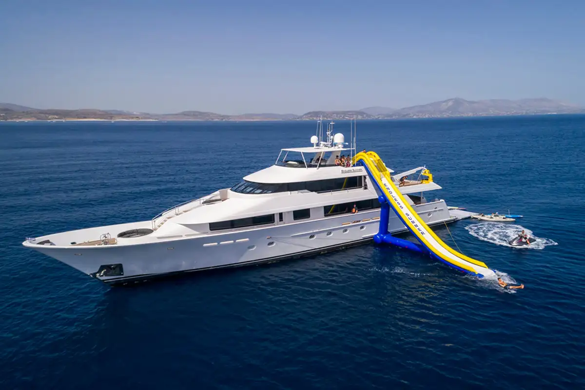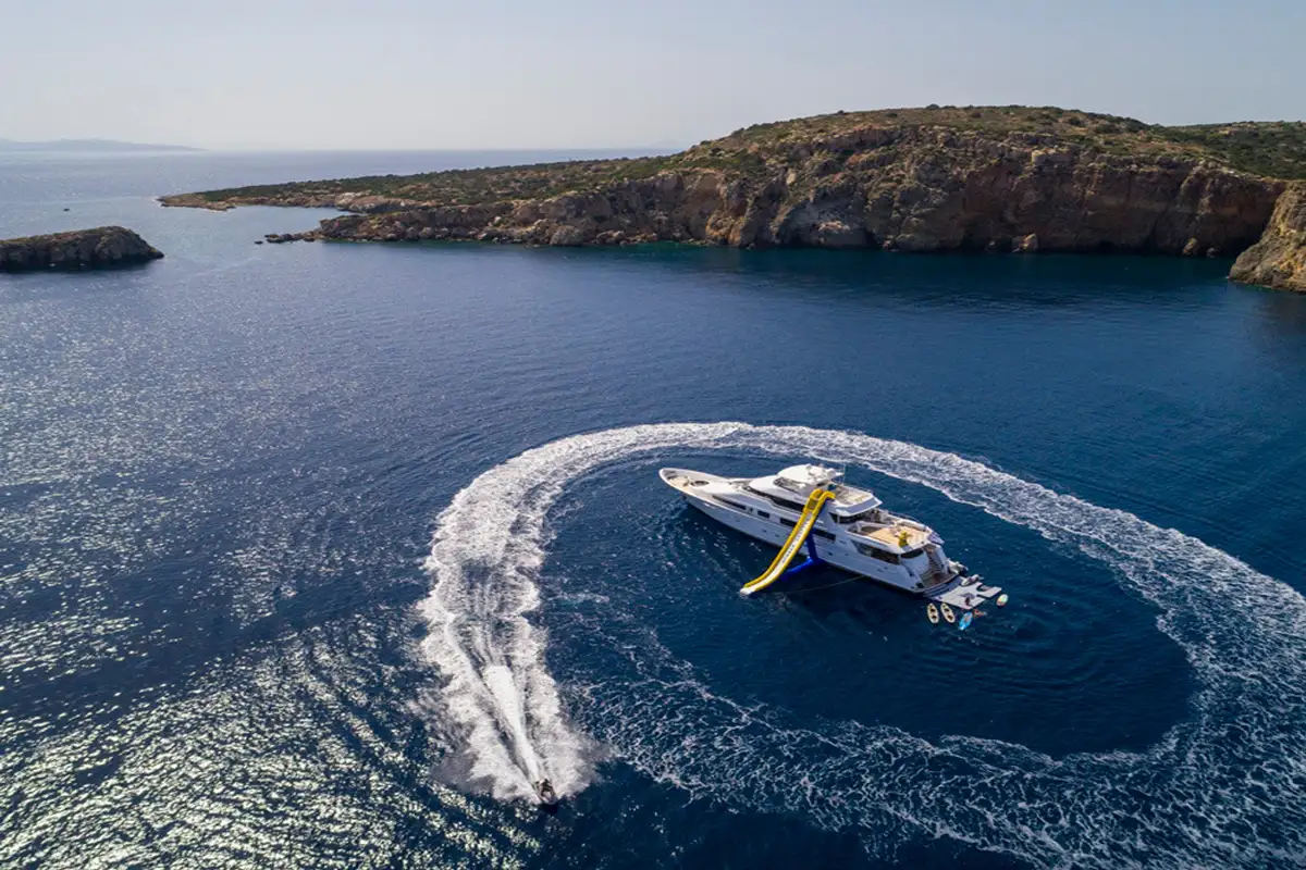 Spread your time across four expansive decks. The superyacht sundeck enjoys a Bimini hardtop for that must-have shade on hot summer days. Recline on the oversized cushions or lounge chairs, break bread over lunch al fresco, and when it’s time for a dip take the fastest – and most fun – way down via the giant inflatable slide.