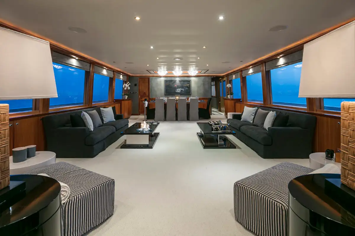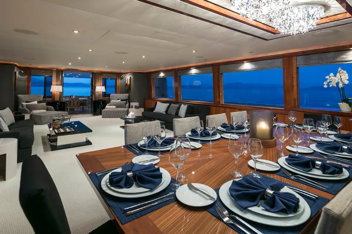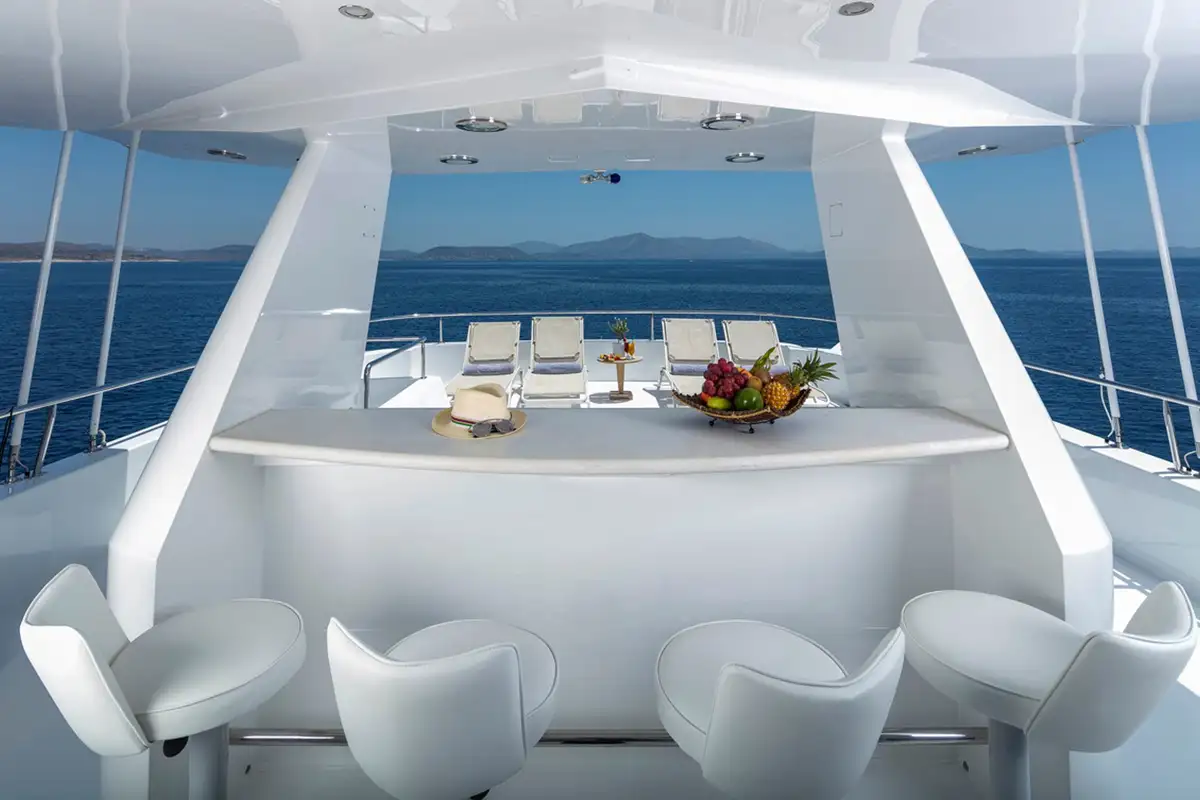 Drink in views from the bridge deck sky lounge where ample seating and an enticing games table exist. It leads directly to the aft deck where a full wet bar and eight-person Jacuzzi provide the ideal evening arrangement. Further al fresco dining under the stars is found here, or take the formal route and enjoy lavish dinners in the main deck salon. The yacht’s chic and sophisticated interior make for a tasteful experience all round.