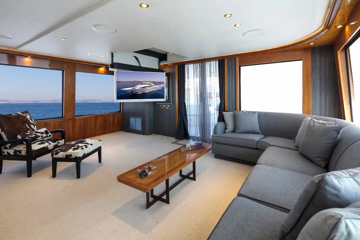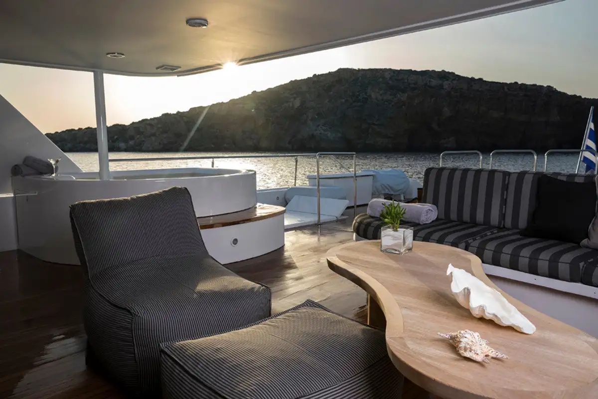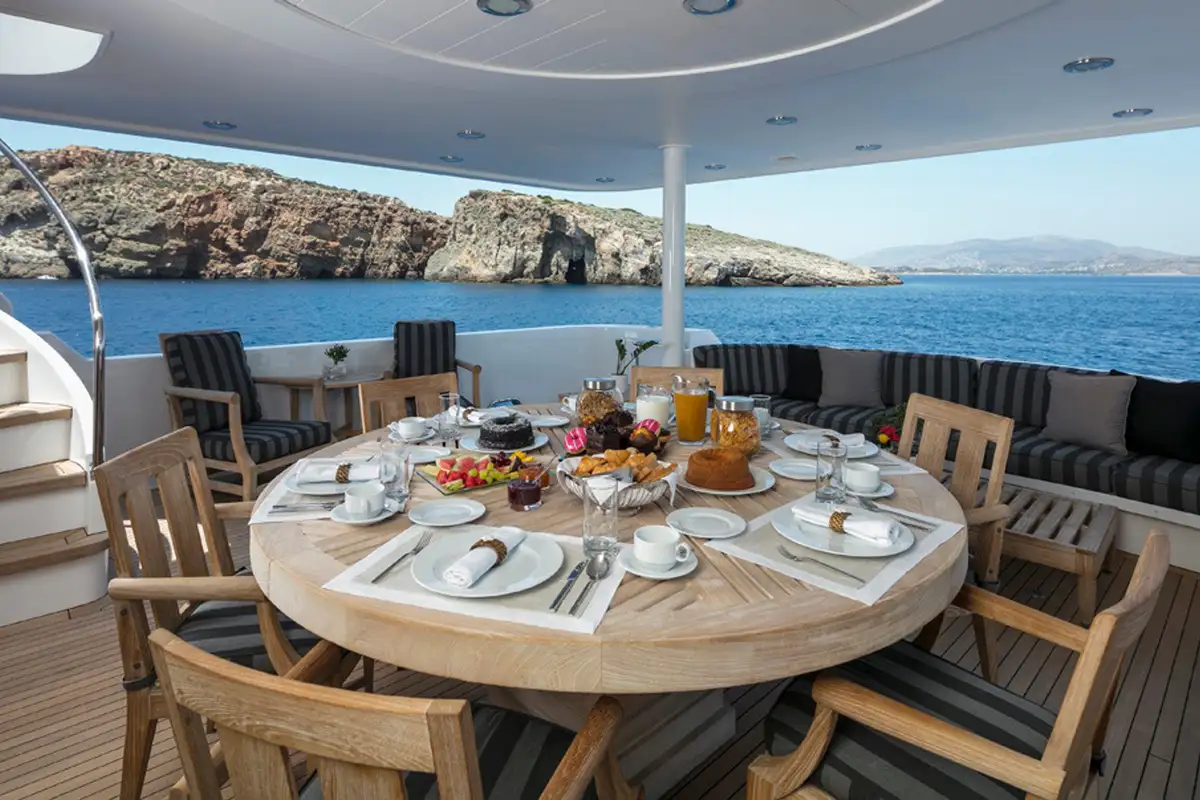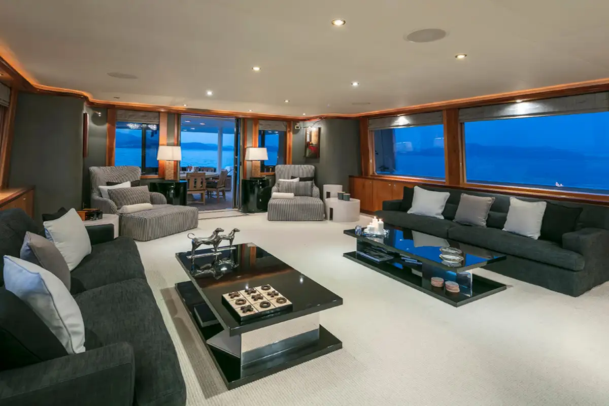 Drink in views from the bridge deck sky lounge where ample seating and an enticing games table exist. It leads directly to the aft deck where a full wet bar and eight-person Jacuzzi provide the ideal evening arrangement. Further al fresco dining under the stars is found here, or take the formal route and enjoy lavish dinners in the main deck salon. The yacht’s chic and sophisticated interior make for a tasteful experience all round.