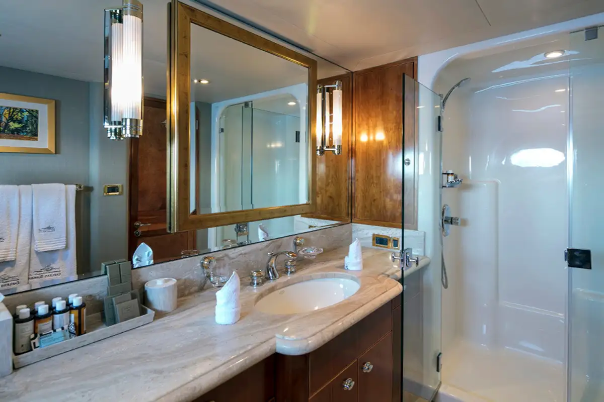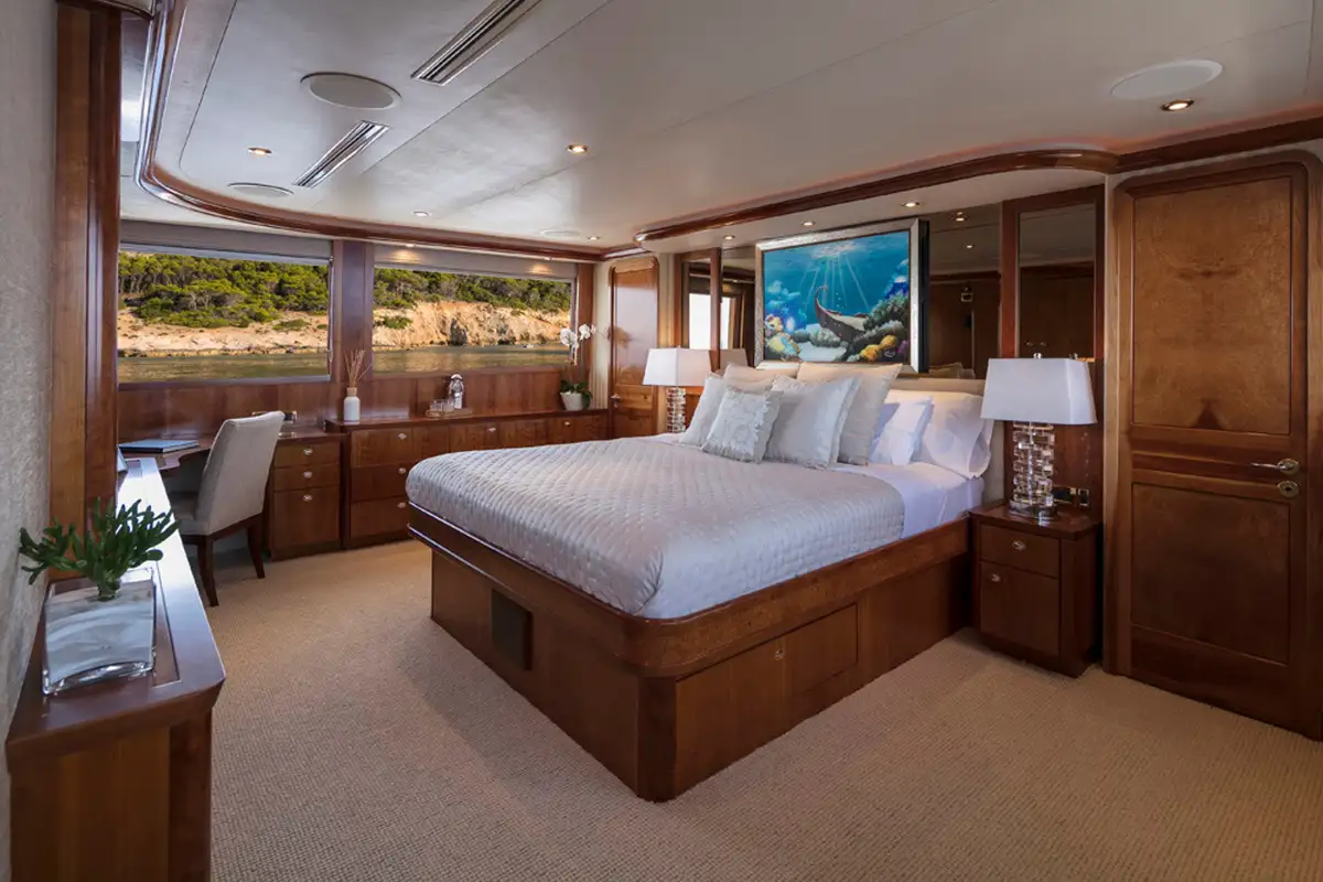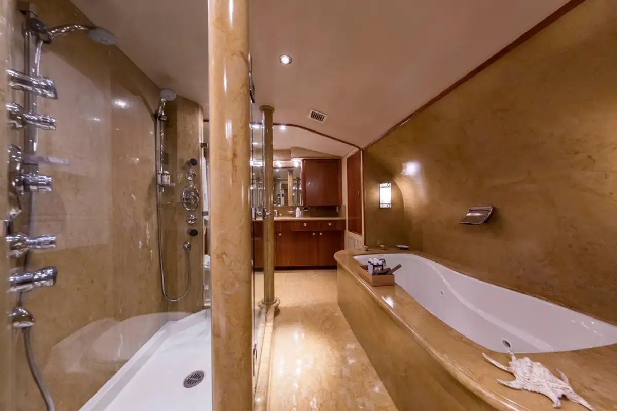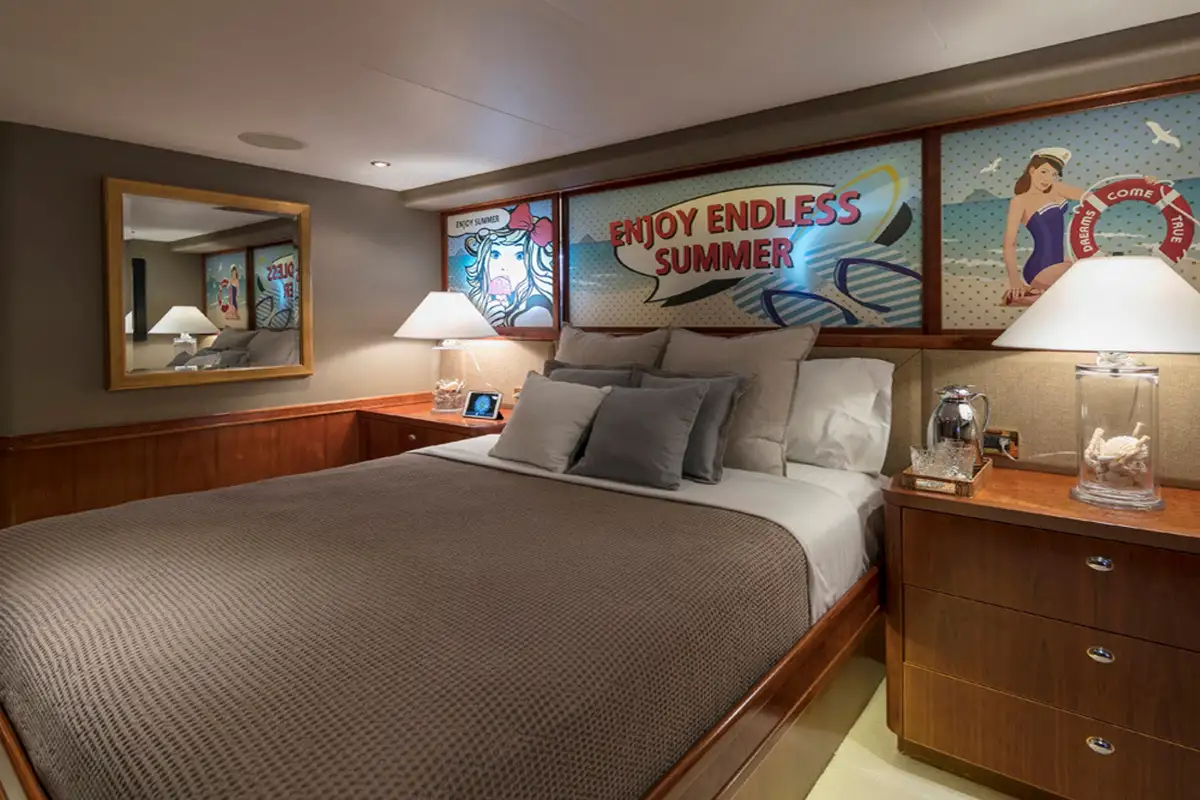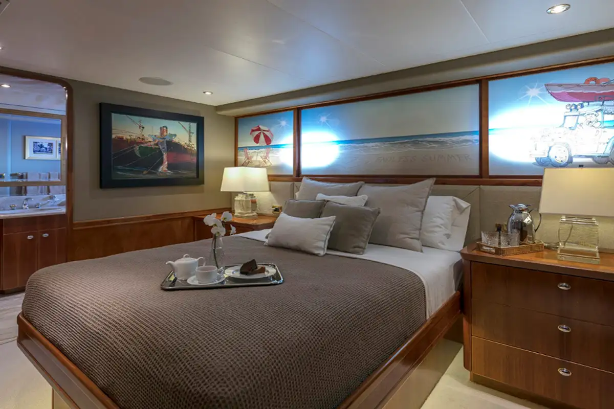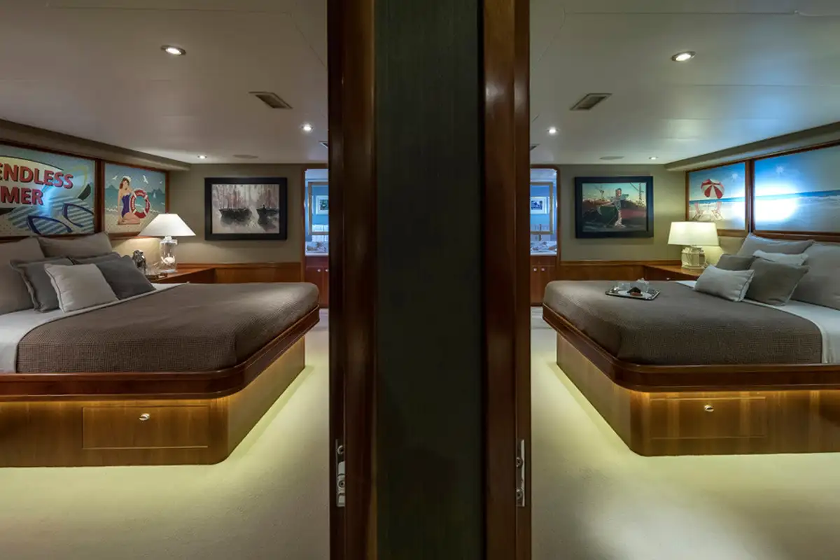 ENDLESS SUMMER welcomes 12 guests in six spacious cabins, five of which are doubles. The warm and cosy full-beam master on the main deck enjoys long-reaching views and artisanal cabinetry. Take stock of the day’s activities with a soak in the full-sized bathtub in the caramel-coloured marble en suite. A double shower and private dressing table complement the arrangement. One VIP suite is found on the bridge deck, while a further two VIPs a located on the lower deck, along with two twin cabins (that convert to doubles) each with a Pullman berth. With versatility at the fore, ENDLESS SUMMER’s set up is equally suited for family vacations or groups of friends looking to charter in comfort.