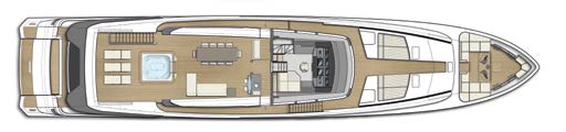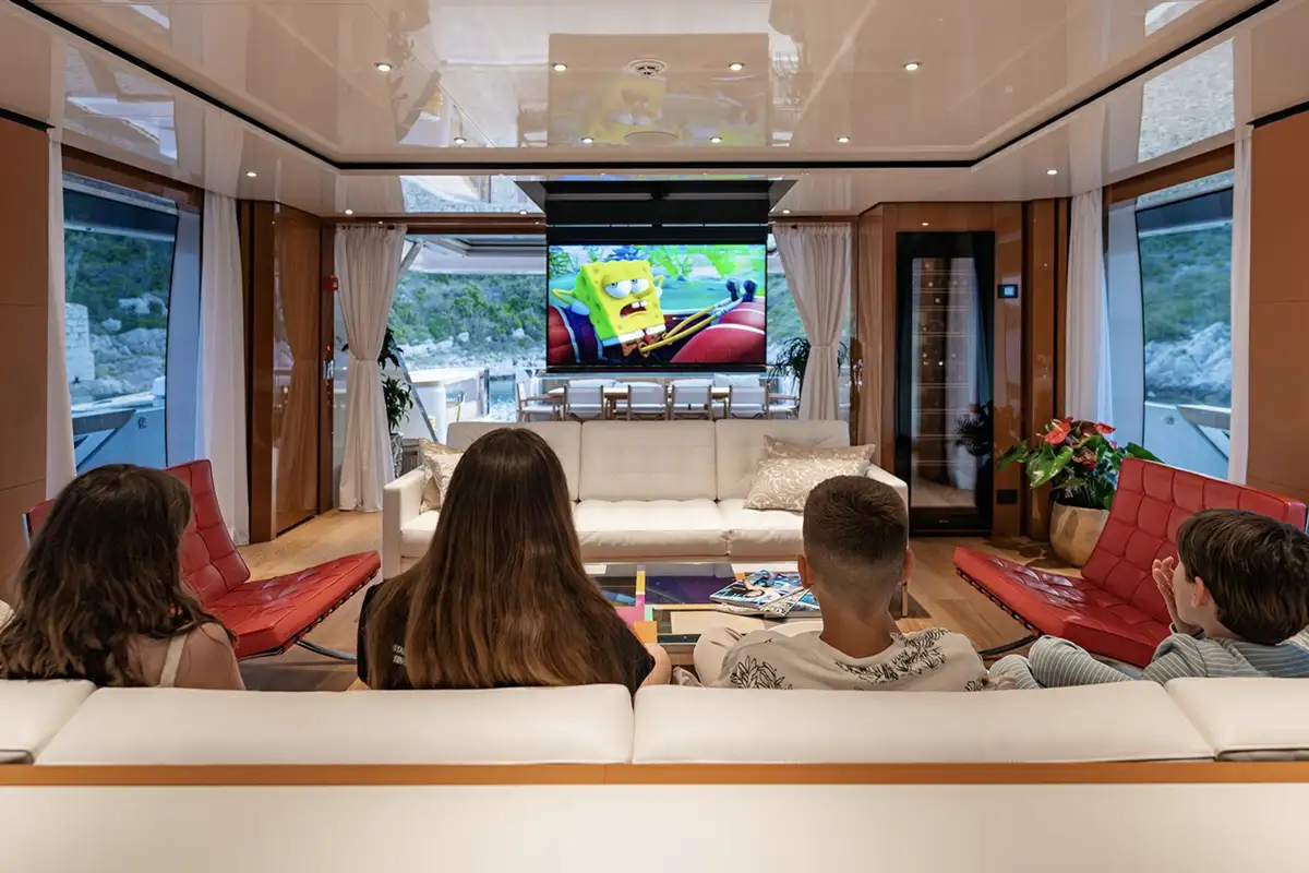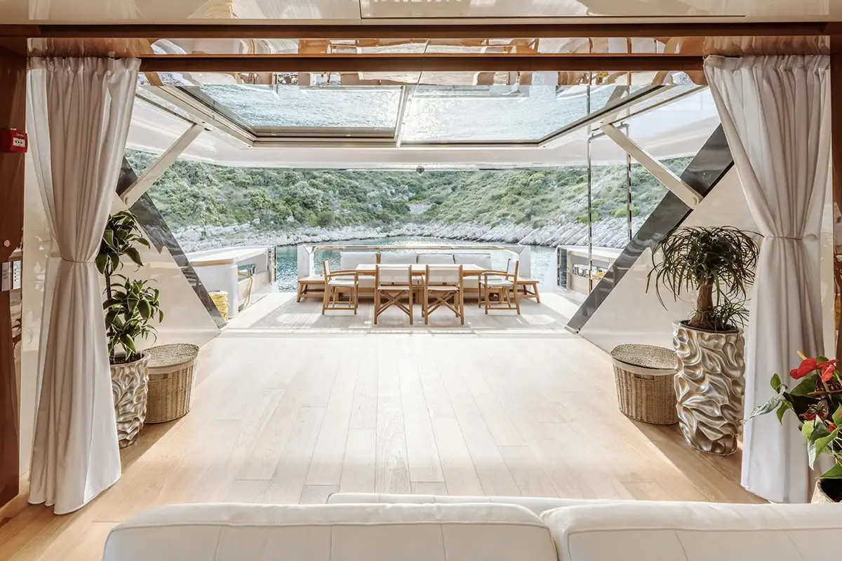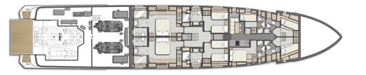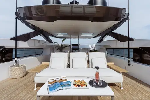 The same philosophy informs the layout of her sundeck where the central area beneath the hardtop provides a shady retreat from the day beds and loungers in glorious full sun. There’s plenty more space to relax and unwind in her foredeck lounge, with sunpads and seats around a table in the cool sea breeze.