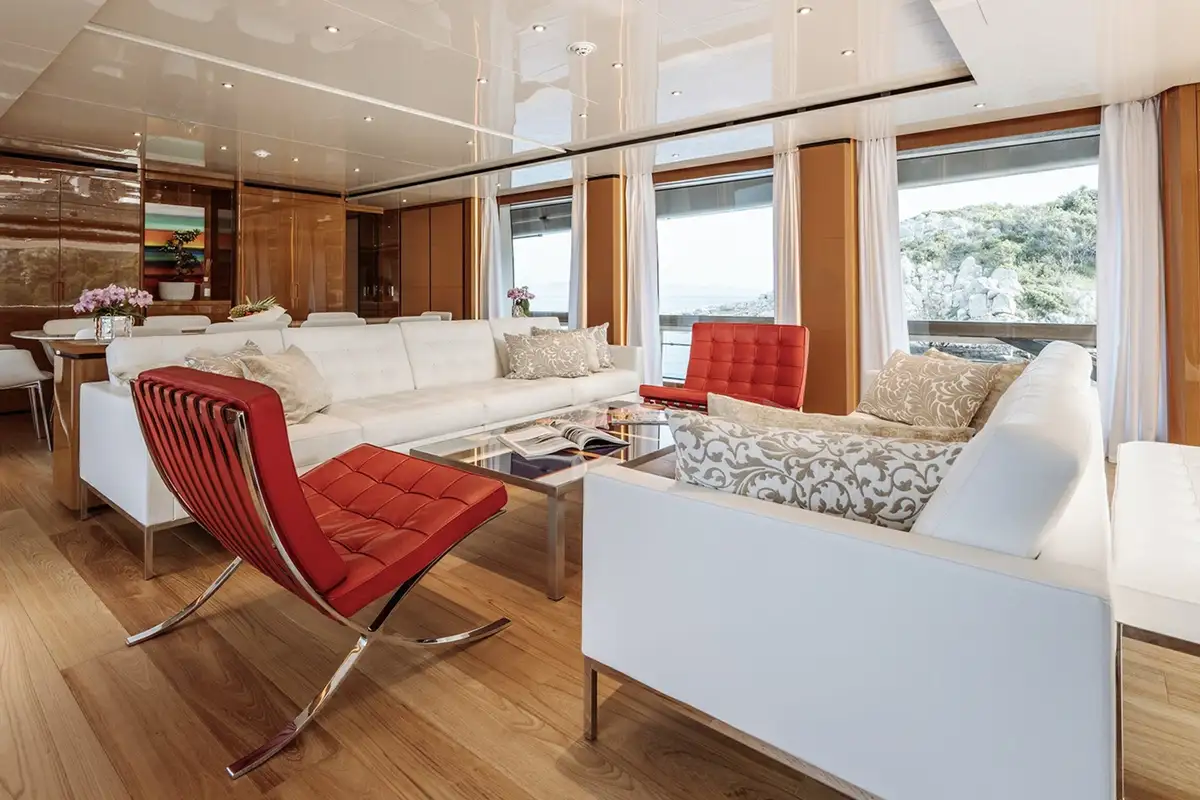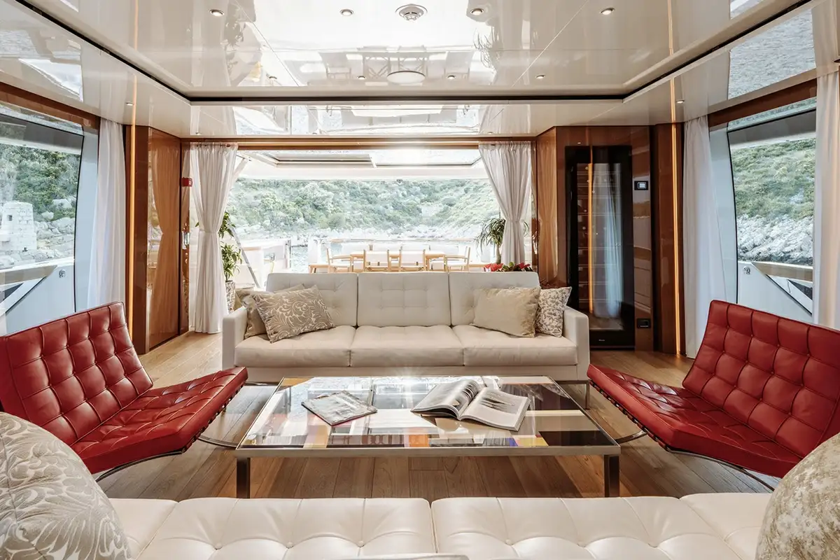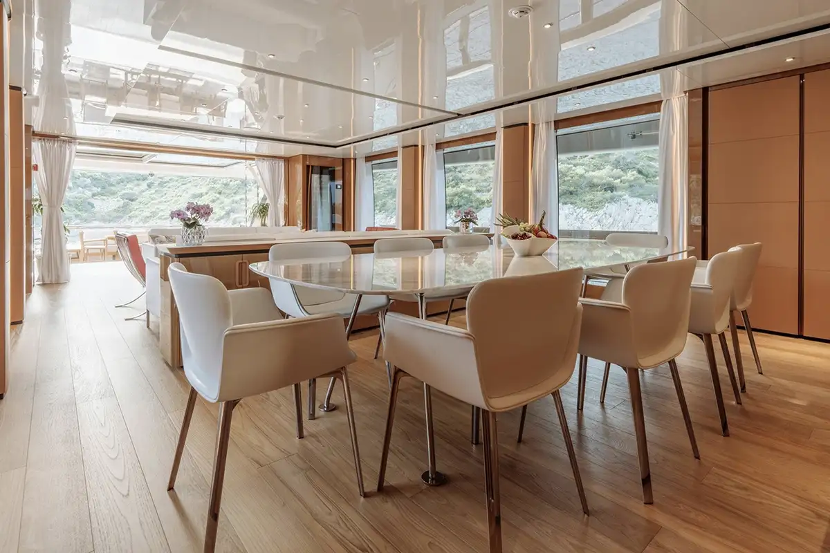 There are floor-to-ceiling windows on both sides of the main deck saloon that make the yacht’s main living space extremely bright, with ample natural light throughout the day and panoramic views of the seascape wherever you choose to sit or lounge inside. It’s beautifully finished in high-gloss blond hardwood with design classic sofas and a marble dining table. An open-plan layout that flows seamlessly out into her outside aft cockpit enables lovers of both sun and shade to enjoy each other’s company while picking their own perfect places to sit or recline.
