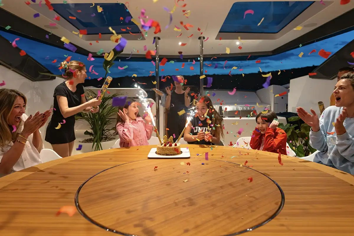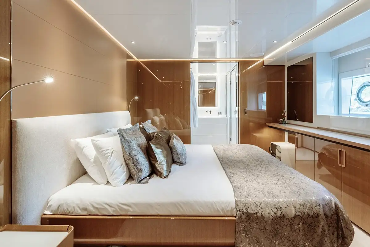 As the sun sets into the turquoise sea, the master suite – with its spa bath and spacious full-beam cabin – is a luxurious retreat at the end of each perfect day.