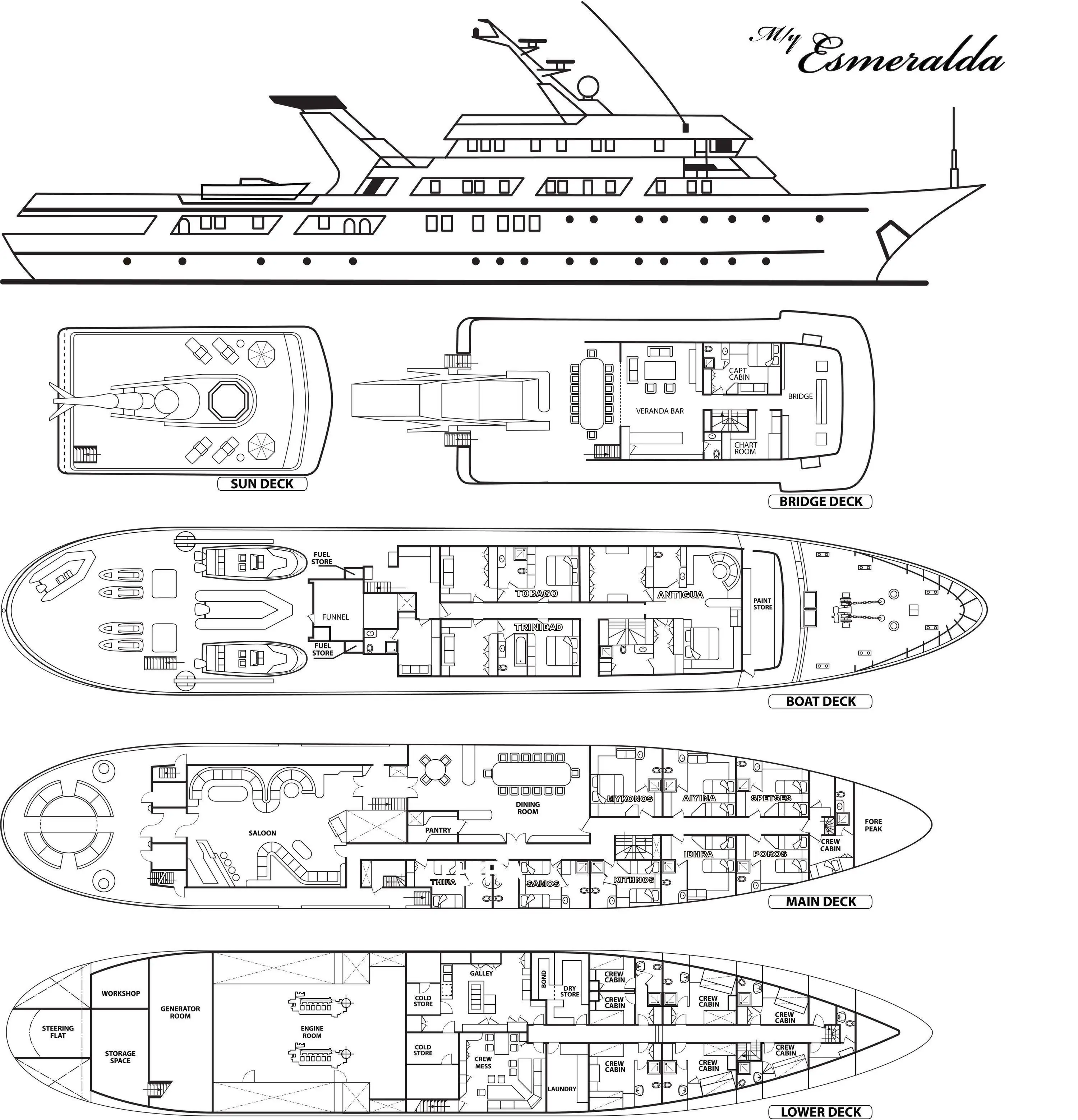 ESMERALDA and her attentive crew can host 12 guests (and 6 supernumeraries) in 11 spacious suites located on the main deck and upper (boat) deck. The main deck guest suites are forward of the yacht’s vast main saloon bar and lounge area. To starboard, there are three twin-berth suites to port ESMERALDA’s large formal dining area. Further forward there are four more twin-berth suites and a delightful double suite.