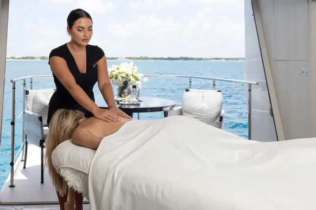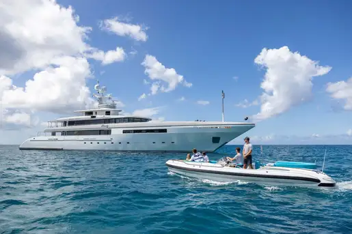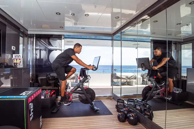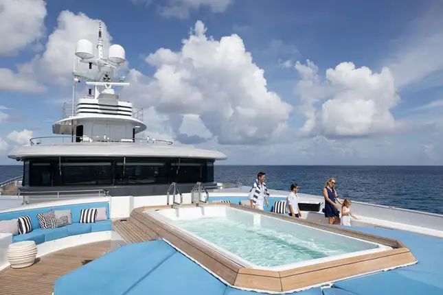 She has expansive deck spaces, with multiple options for sunbathing and spending a lazy day lounging around enjoying the spectacular views of your charter destination. A congenial semi-circle sun deck bar features swivel stools and a large TV to enjoy sports and Netflix’s latest gripping series. A 5.2m (17.3ft) foredeck jacuzzi doubles as a resistance pool. Stay in shape with the dedicated sun deck gym with all the equipment you could need, from punching bag to yoga mats. An extensive array of watertoys including an inflatable 2m swim platform extension will mean that the ocean is your new best friend.