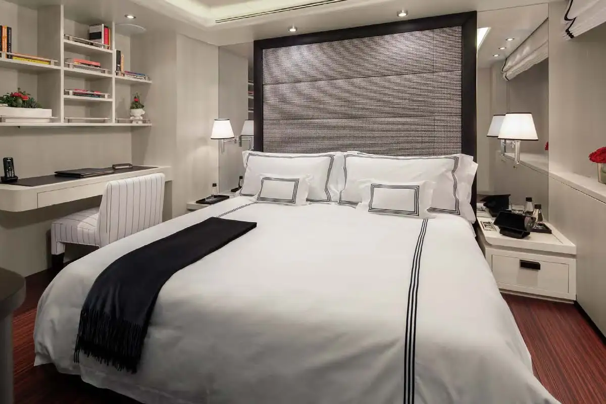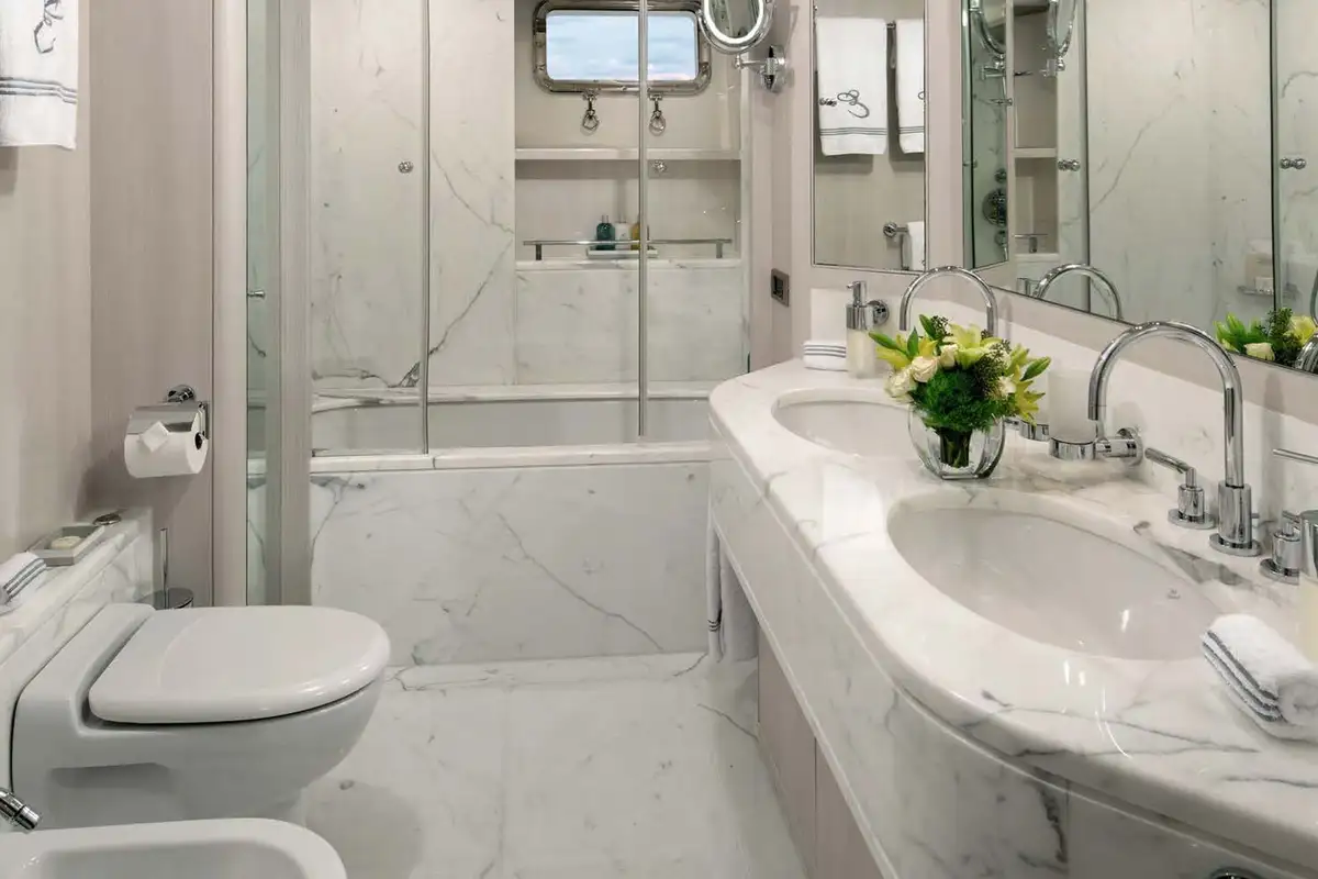 Seven cabins accommodate 12 guests, all with marble ensuites containing a bath and shower. The gorgeous master cabin benefits from a fold-out balcony for never-ending sea views, as well as a jacuzzi tub, steam shower and his-and-hers closets.