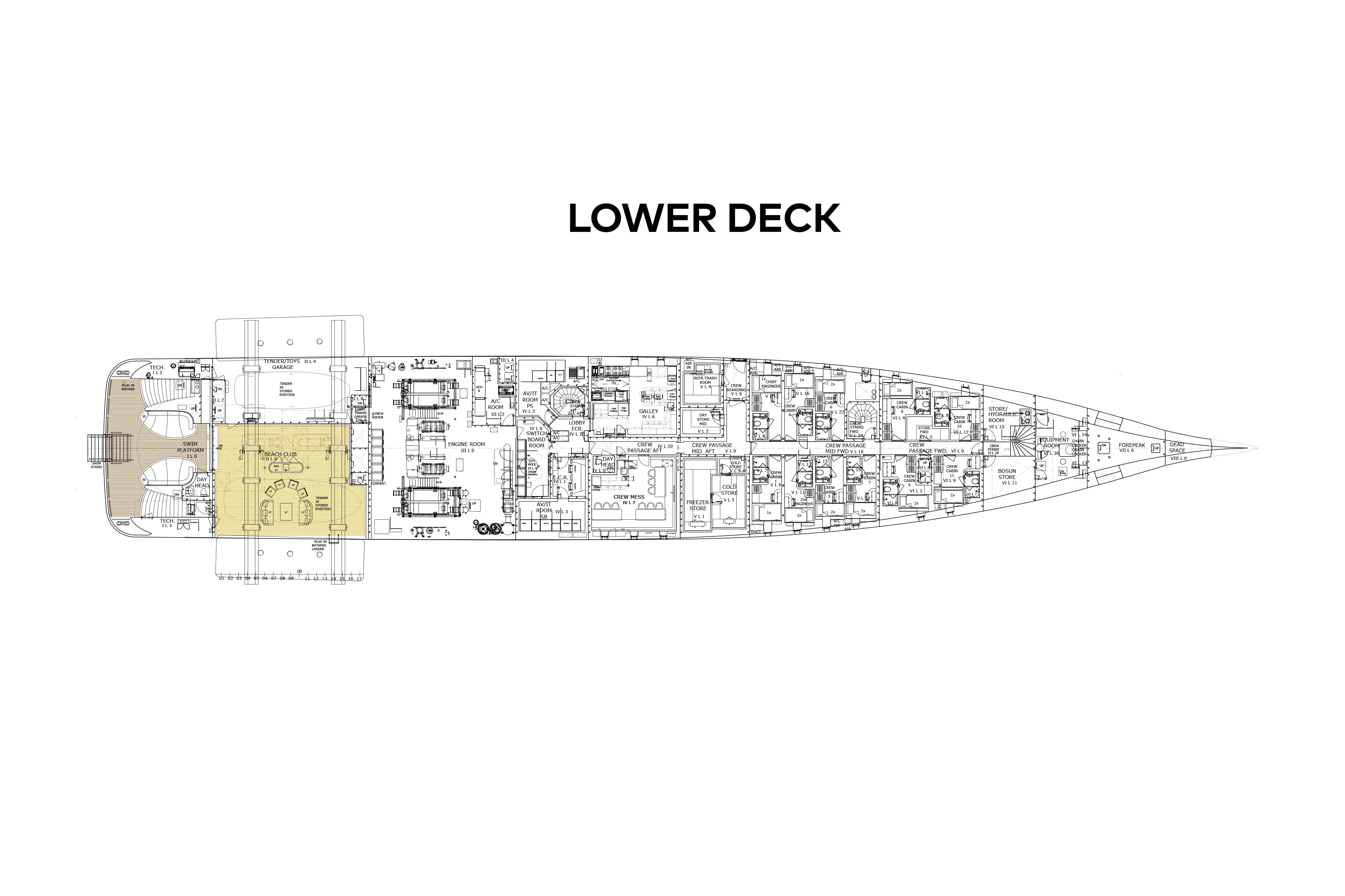 The entire upper deck is dedicated to the owner’s private domain, encompassing a luxurious master suite and lounge, a private aft deck with jacuzzi and sun lounging area and a forward terrace. Above the owner’s deck is the substantial sun deck with lounge area and another jacuzzi. A large pool is located on the main deck, complemented by a swim-up bar. The main deck also houses the guest accommodation, comprising six double cabins, a lounge and dining area, a dedicated cinema room, spa, sauna and a well-equipped gym. From here, steps lead down to the expansive beach club with an inviting terrace area and wide, comfortable bathing steps, providing easy access to the plethora of water toys stored in the garage, which has been fitted out with a bar and seating area, creating a further social hub for guests as they enjoy the wide variety of water activities available.