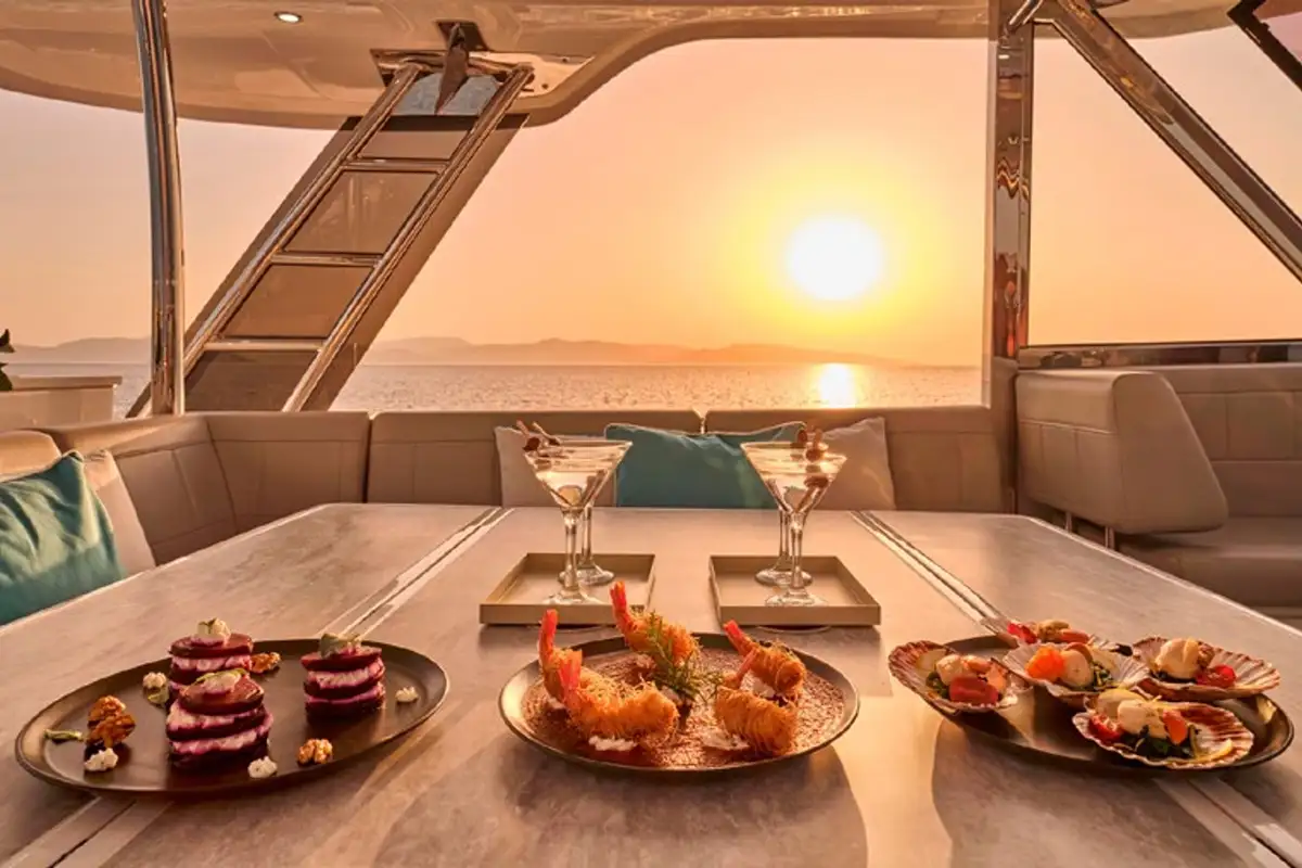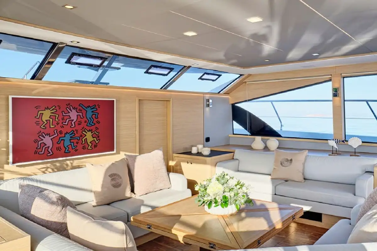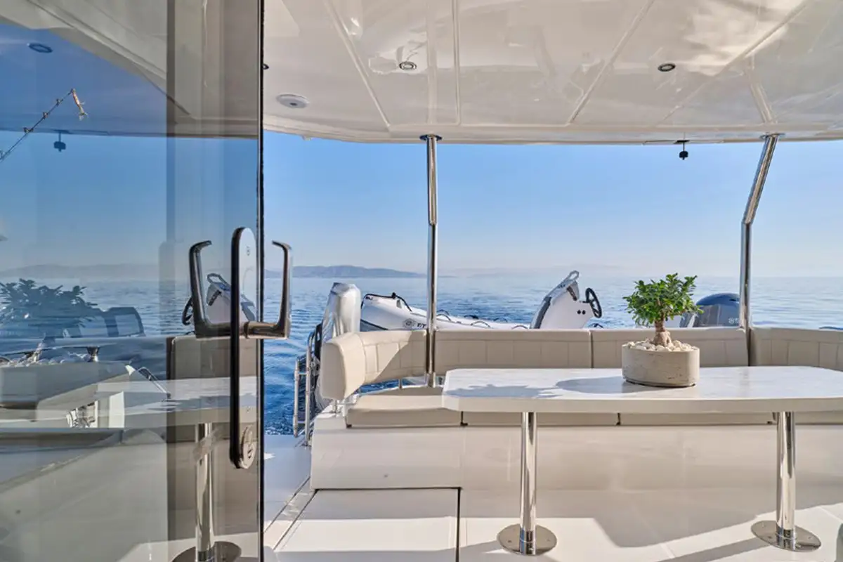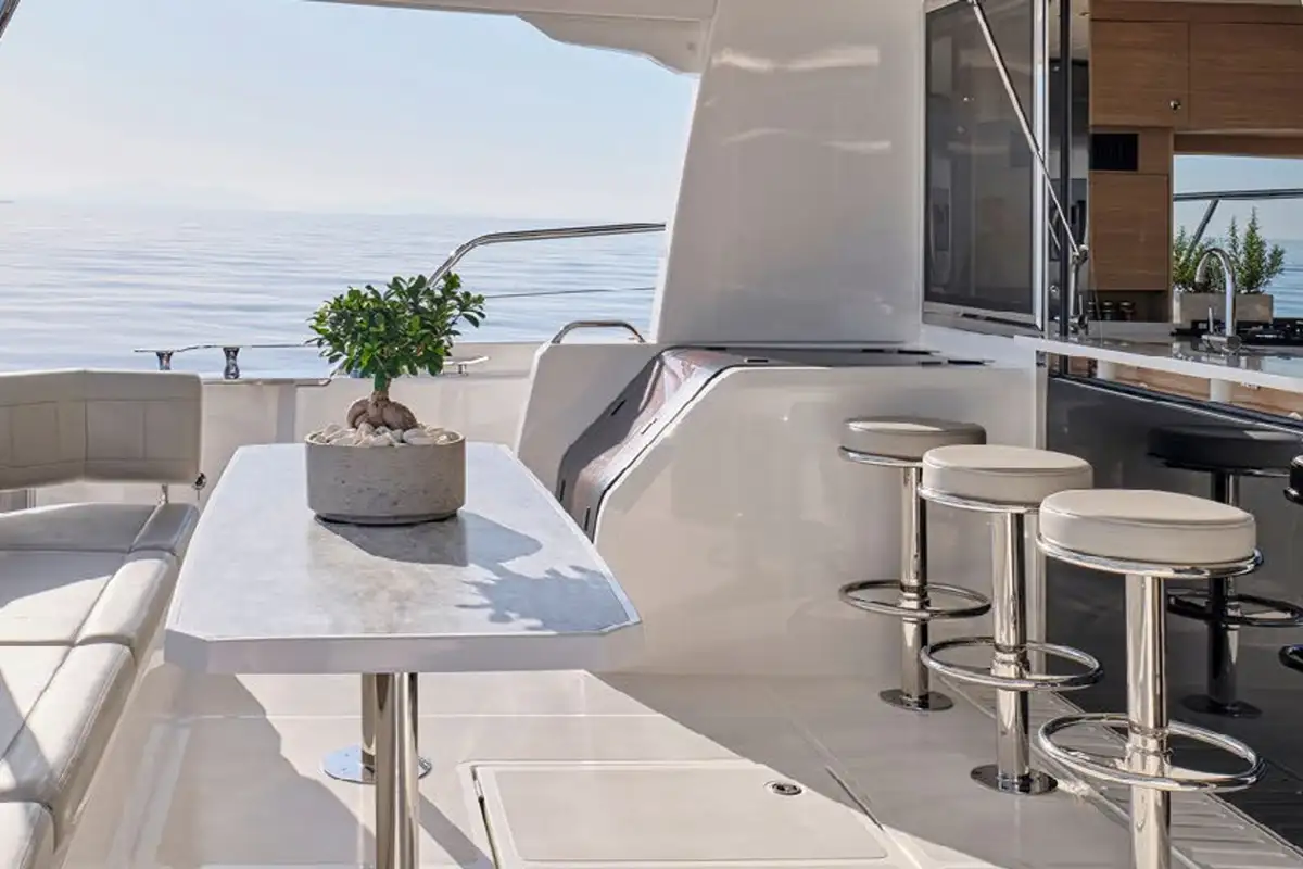 Her flybridge is a great social hub where guests can gather while cruising from one destination to the next, with 360° panoramic views and a hardtop above providing shade. There are observation seats up front, a lounge-dining area amidships, a fridge and barbecue grill, and sunloungers facing astern. Companionways on both sides of the flybridge lead around it and forward to the sunpads and seats on the coachroof, and steps lead down to the main deck aft cockpit where there’s a sit-up bar and banquette seats with a table.