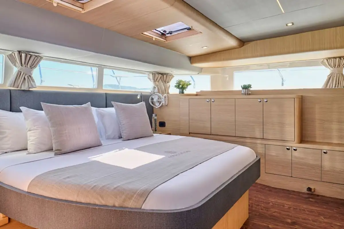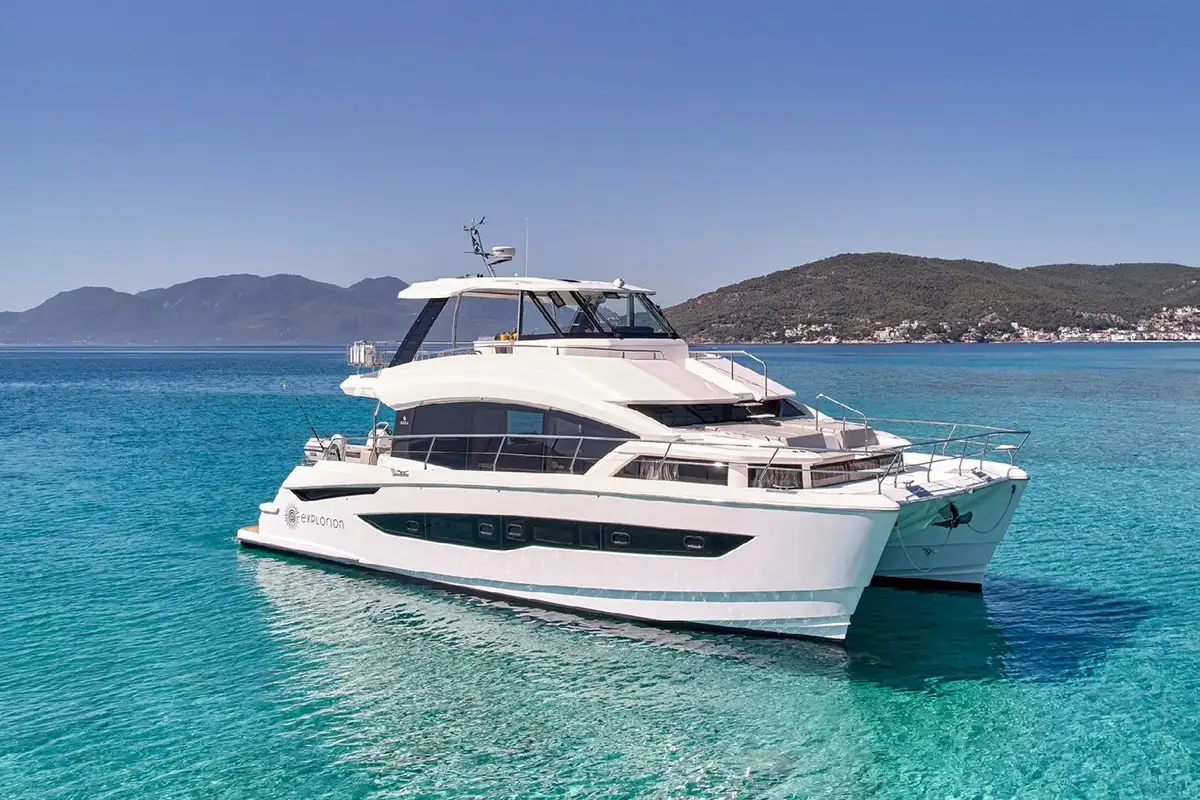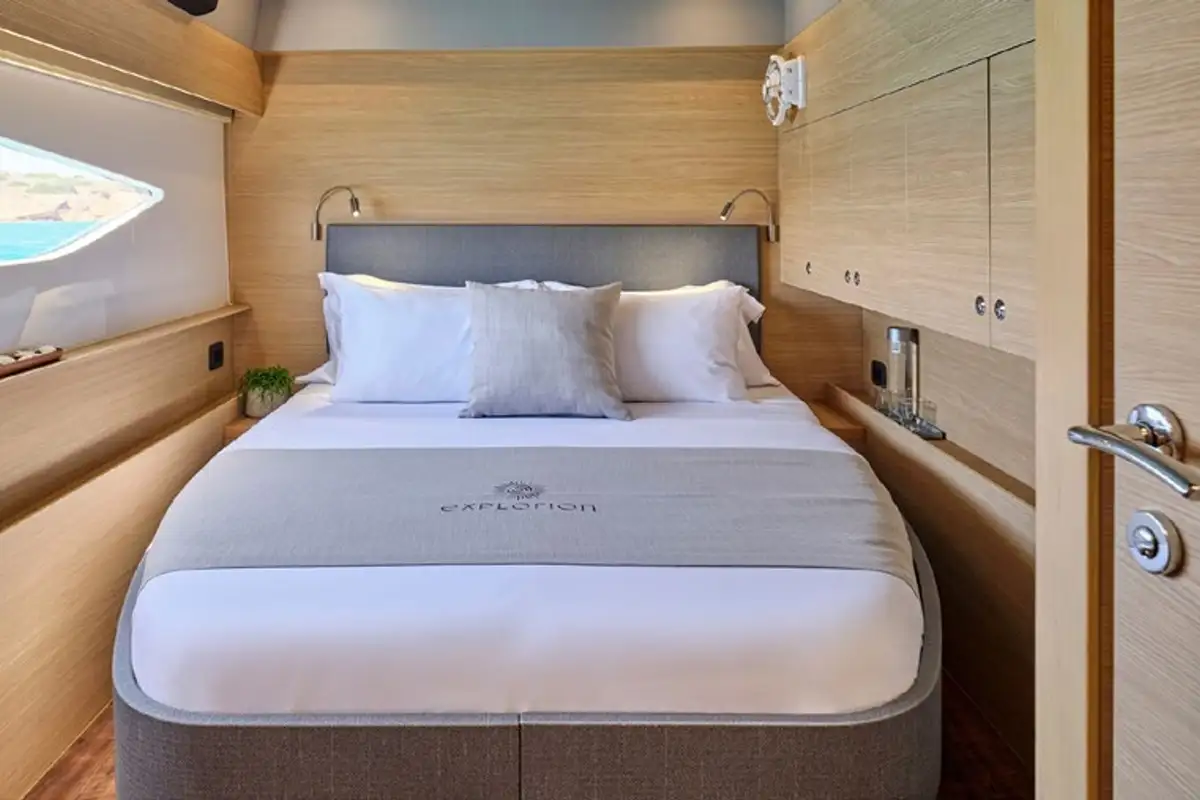 Are two hulls better than one? This 16m (53ft) EXPLORION cruising catamaran makes a very strong case for that point of view. You get a much wider, more stable platform than any monohull of equivalent length – she’s as wide as many 30m (100ft) yachts – so there’s a lot more living space, including a large master suite and a vast, open main deck lounge with panoramic views. Her fuel consumption at cruising speed is a lot lower, so she’s a more eco-friendly option, and there is no rolling motion at sea or when she’s anchored in a bay.