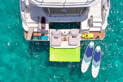 Another great exterior feature is the stern platform, which can be lowered right down to sea level in an anchorage to provide a beach club area with two day beds and an excellent launch pad for watersports toys. She carries a RIB tender with an inflatable tow, a wakeboard and waterskis for adults and kids, plus SeaBob and Scubajet underwater scooters, paddleboards, fishing gear, snorkelling gear and more.