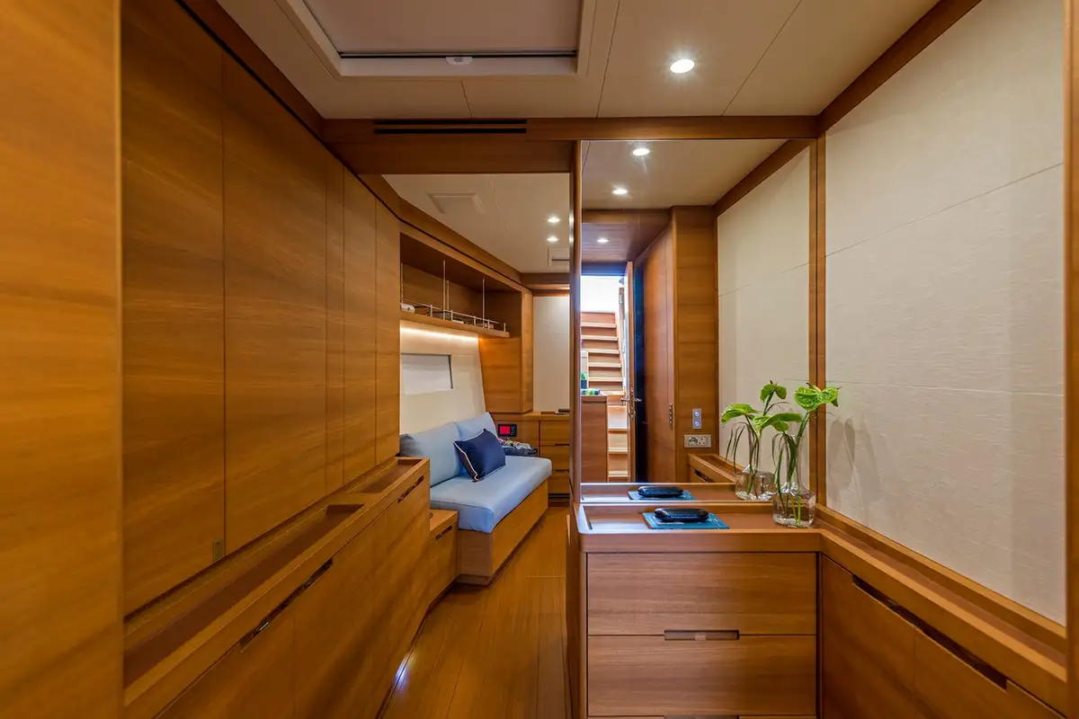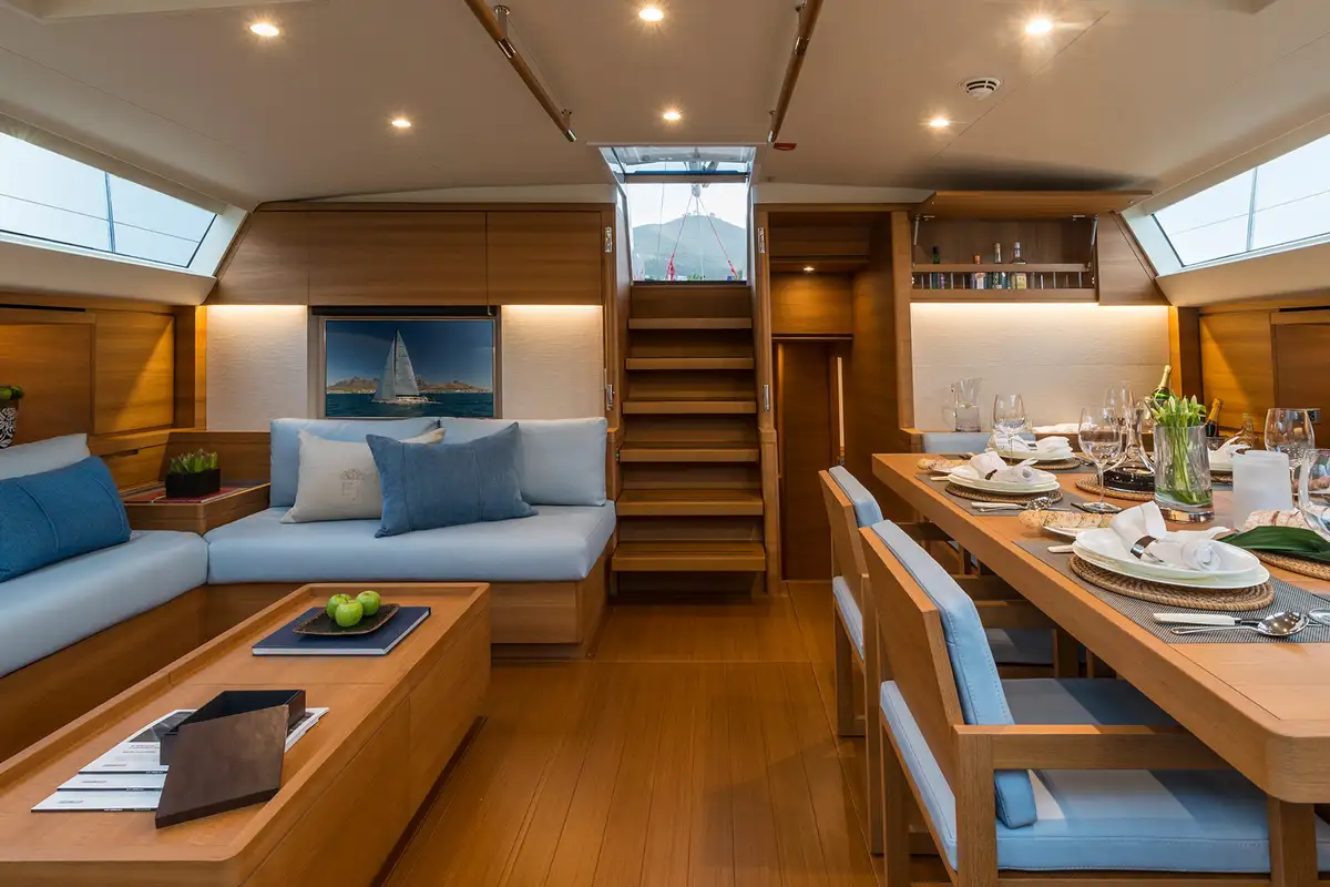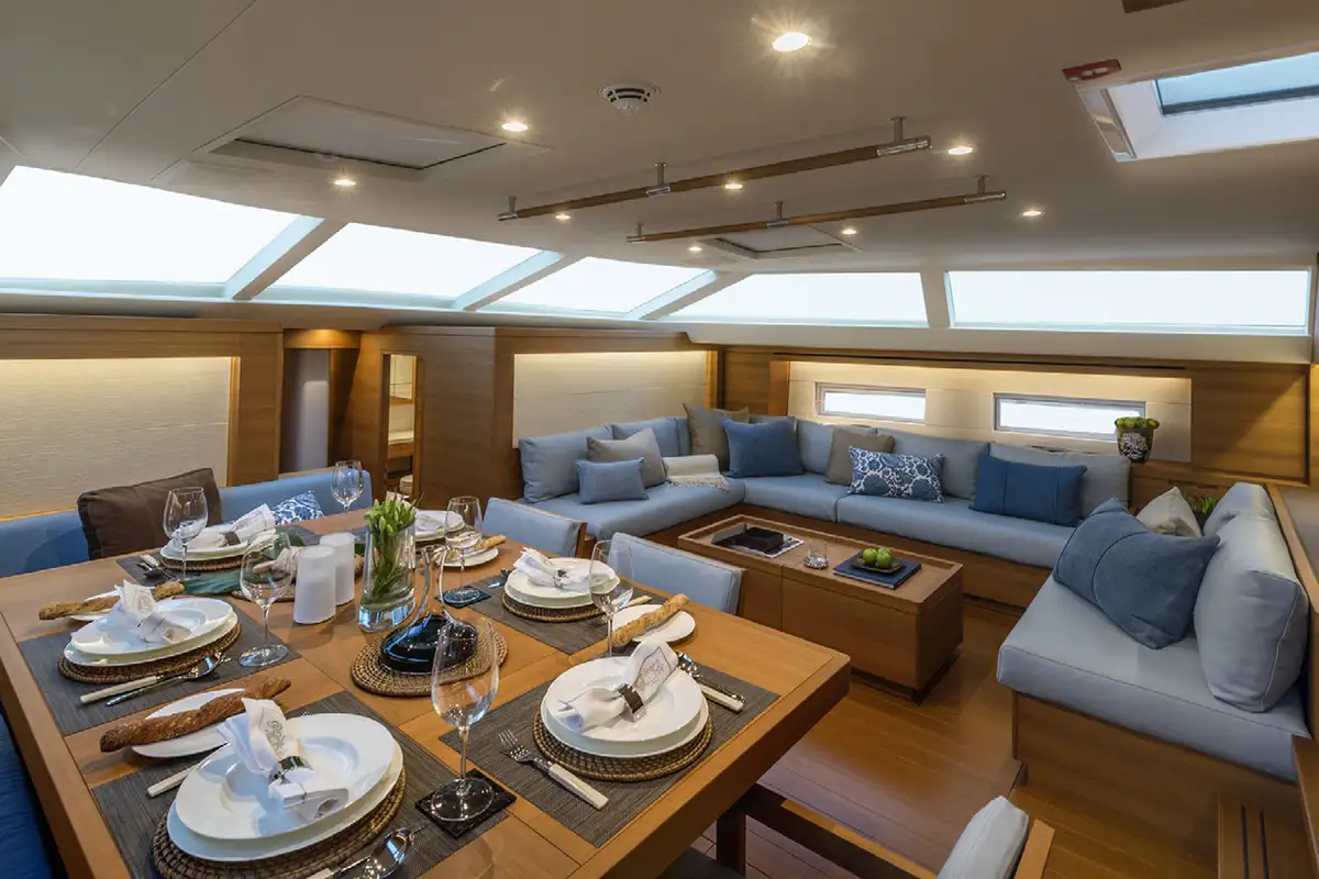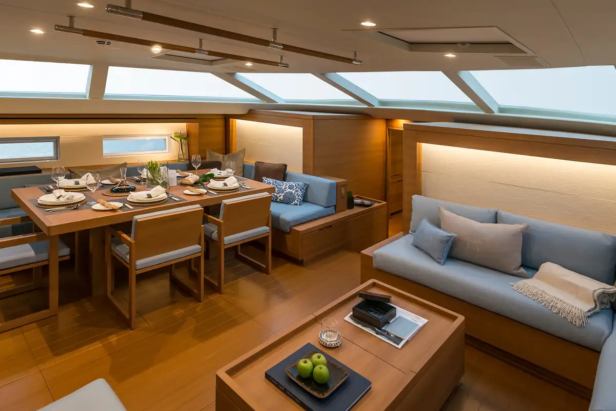 Inside FARFALLA, the beautiful raised saloon offers greater privacy and intimacy and can be used for more formal dining occasions. Although you're inside, you and your guests won't miss your surroundings; 270-degree views, as well as the hull windows, allow you to take full advantage of the vistas and light they permit. Her modern interior design is welcoming and overflows with the warmth of wood. The dining area lies to starboard, while to port is a relaxing lounge. Even seated, the eye-level hull windows provide views for children and adults alike.