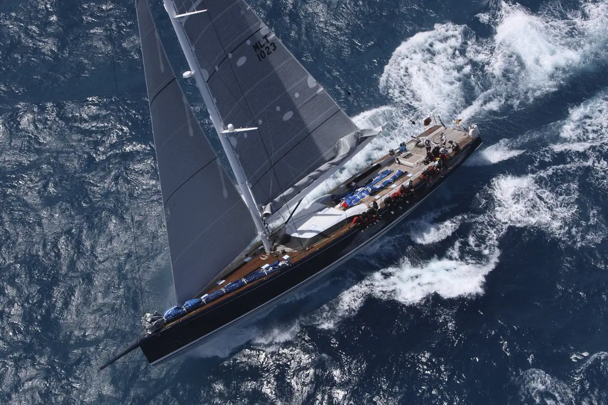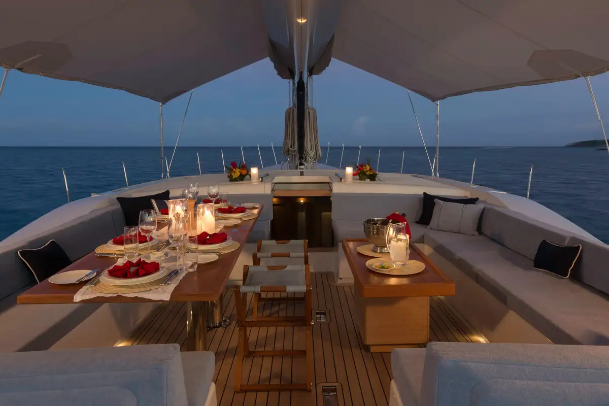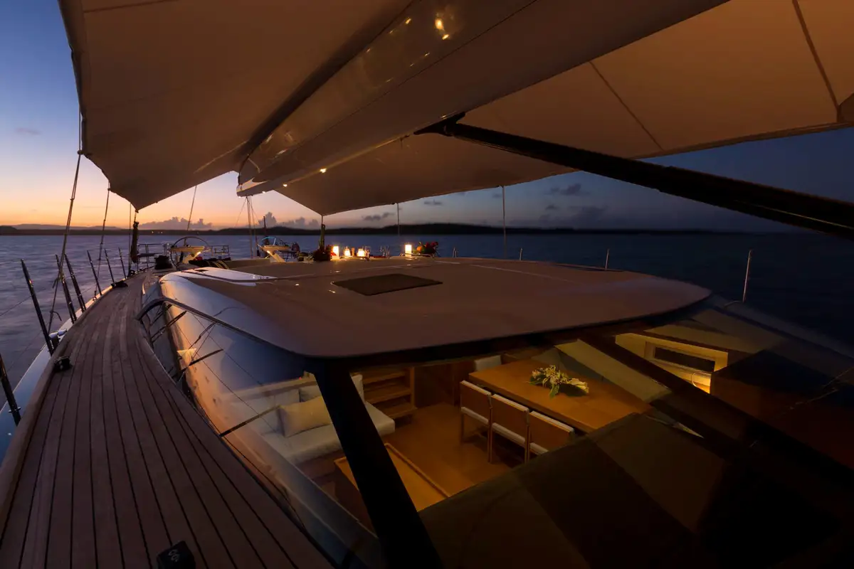 Welcome aboard FARFALLA, the majestic 31.8m (104.3ft) Southern Wind cutter-rigged sloop. Her flush deck and low coachroof design create a modern, elegant, and eye-catching profile. The vast deck area offers plenty of places to relax and take in your surroundings. In the guest cockpit, just forward of huge sunpads, the long, U-shaped, inboard-facing seating is the perfect place to experience this gracious yacht's power as she glides under sail. At rest, this area is an al fresco lounge area that can be shaded by a cockpit awning. With the addition of freestanding chairs, the area also makes a convivial al fresco dining area.