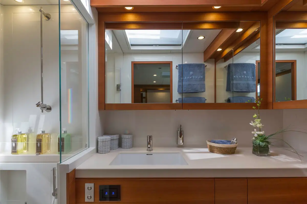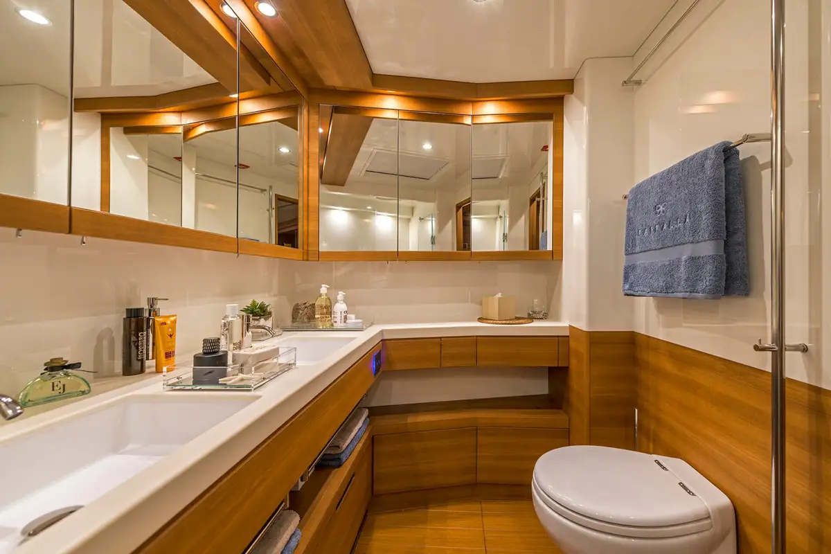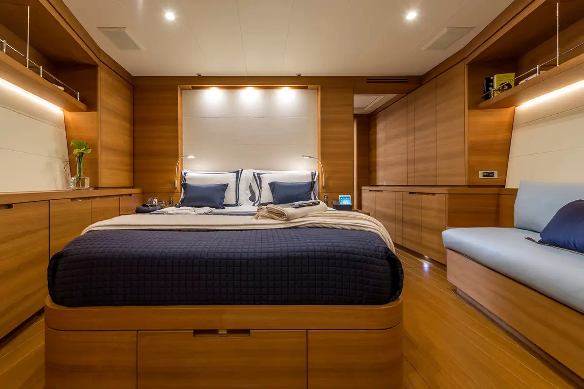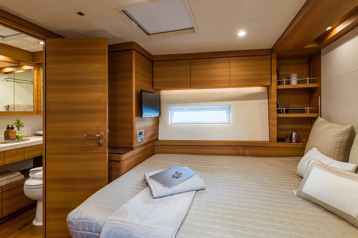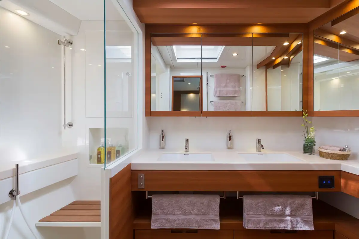 Your full-beam master suite is a stylish, secluded sanctuary. Foremost is the en suite bathroom with twin sinks and a separate shower compartment. The sleeping area has seating that faces the peninsular berth. Deck hatches and hull windows allow plenty of natural light in during the day and can be covered for total privacy while you sleep.
