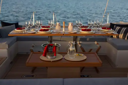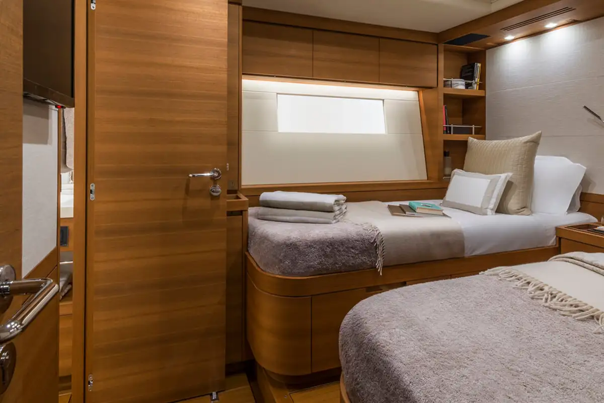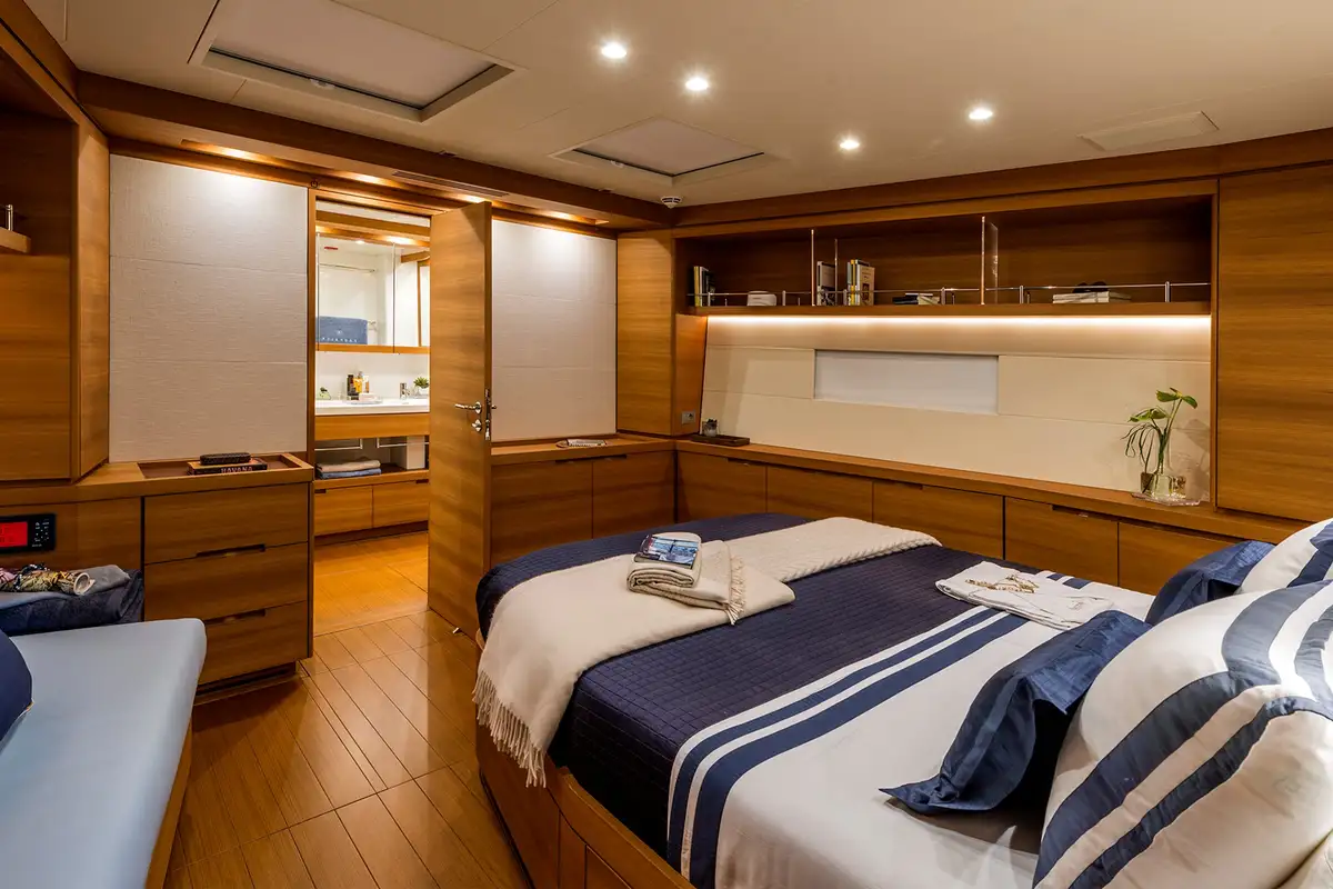 As the sunset approaches, you can enjoy evenings of cocktails, conversation and captivating cuisine on deck or inside. Whether you're celebrating a special occasion or relaxing with friends, you're assured of many memorable nights on board FARFALLA. When the night draws to a close, you and your guests can retire to the comfort of your suites. In addition to the master suite, there are two double and two twin suites. All of the yacht's suites are en suite.