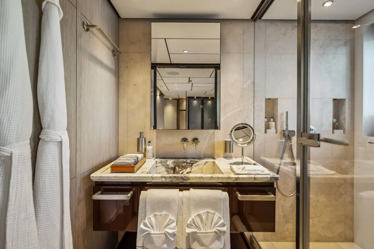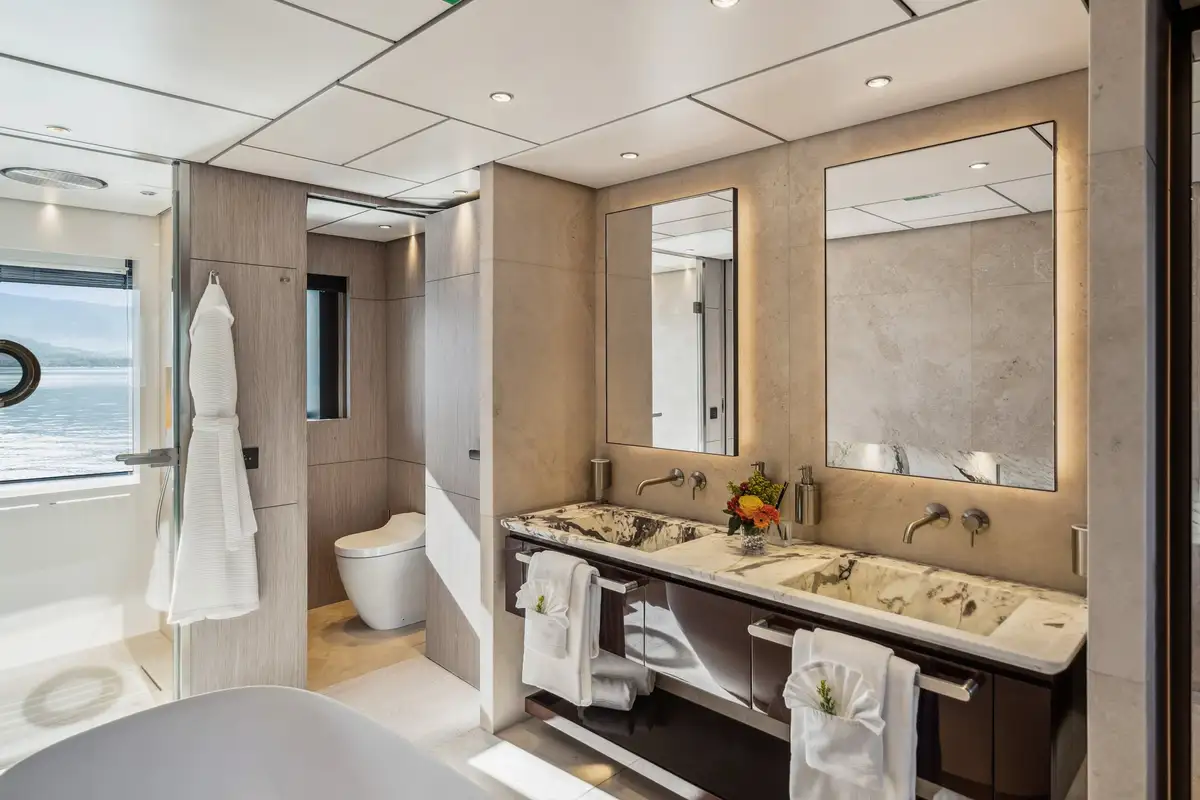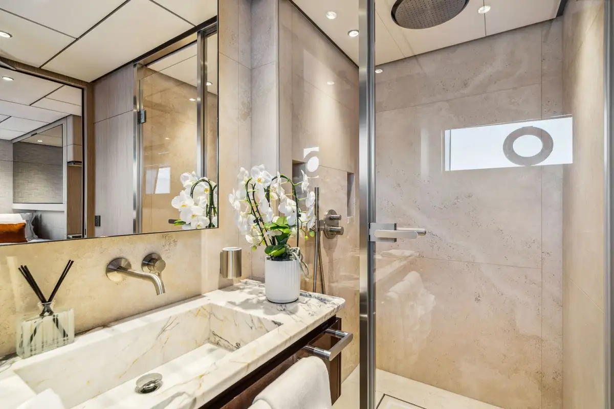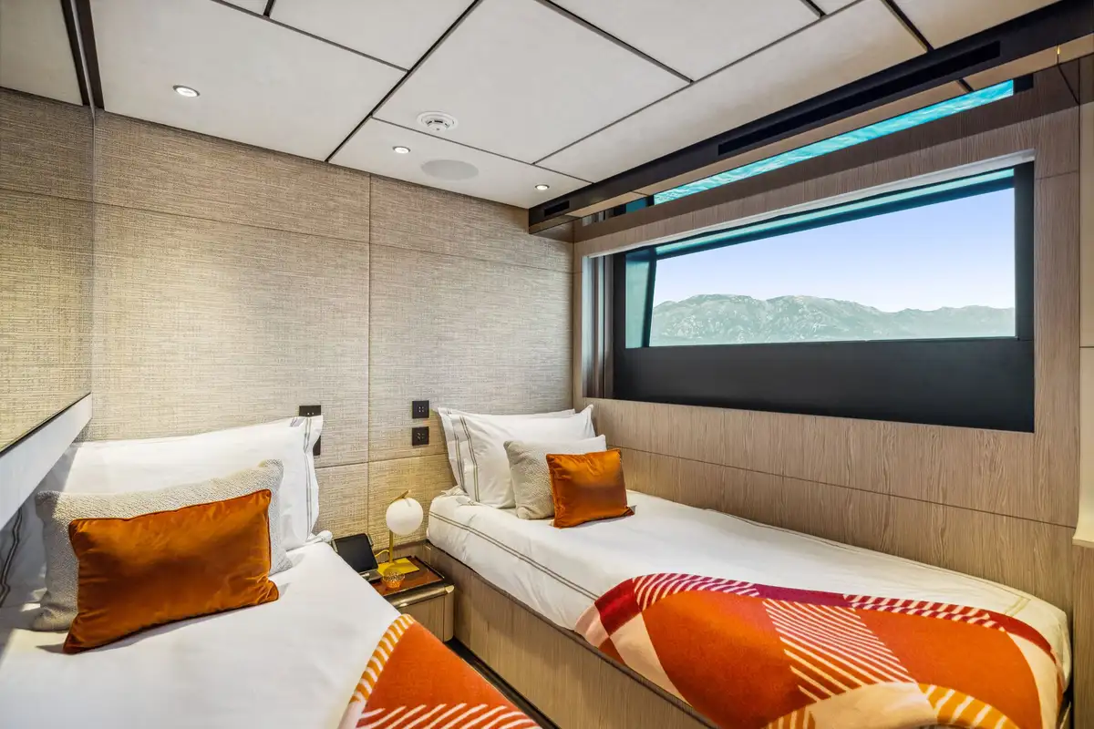 FIFI accommodates up to 10 guests across five stunning staterooms. On the main deck, the master suite features a central king-size bed, a walk-in closet and dual ensuite baths joined by a spacious, multifunction shower. The lower deck hosts three VIP cabins with queen beds and ensuites, alongside a twin stateroom equipped with an additional pullman, all designed to offer a peaceful retreat after a day of exploration. Each cabin is fitted with the same contemporary styling seen across the rest of FIFI, with touches like faux-fur blankets, pops of blue and marble accents in the bathrooms.
