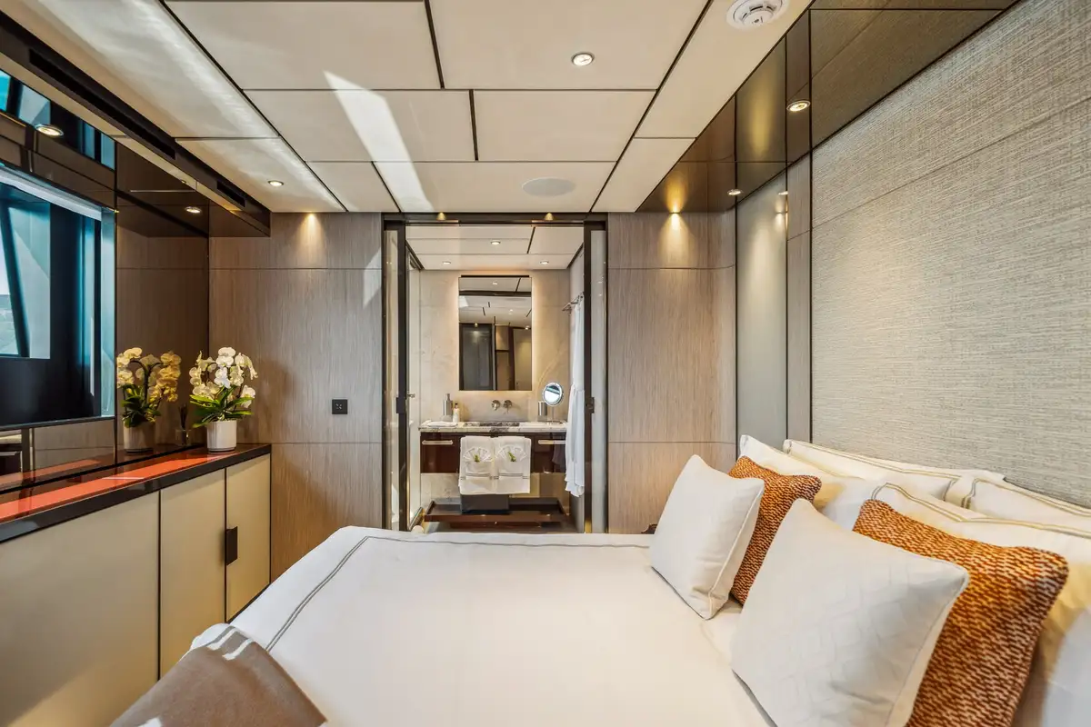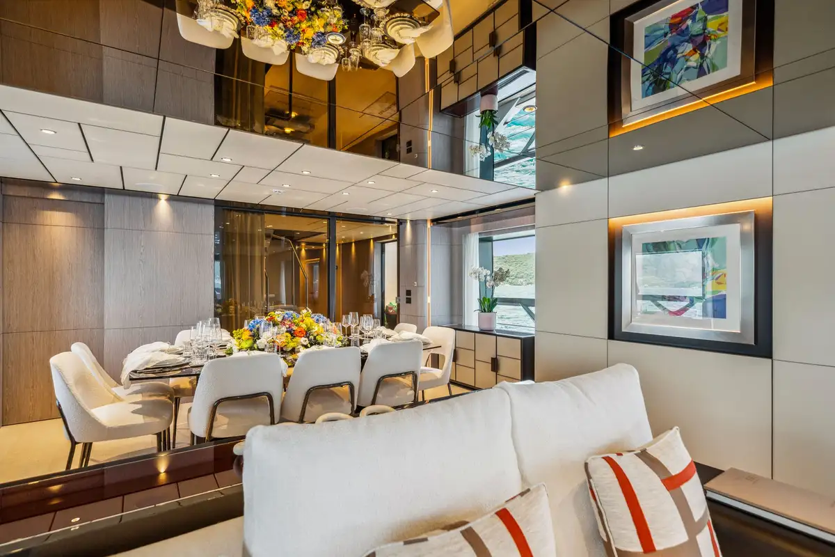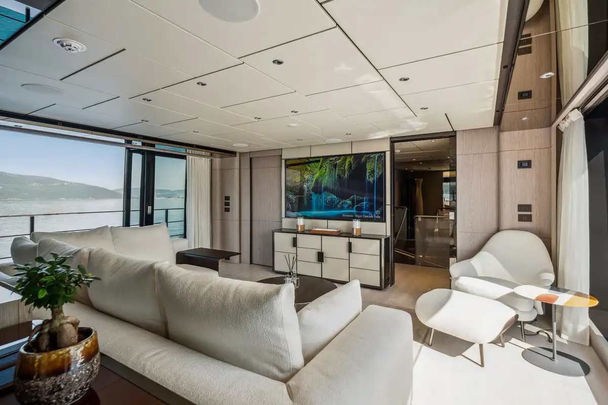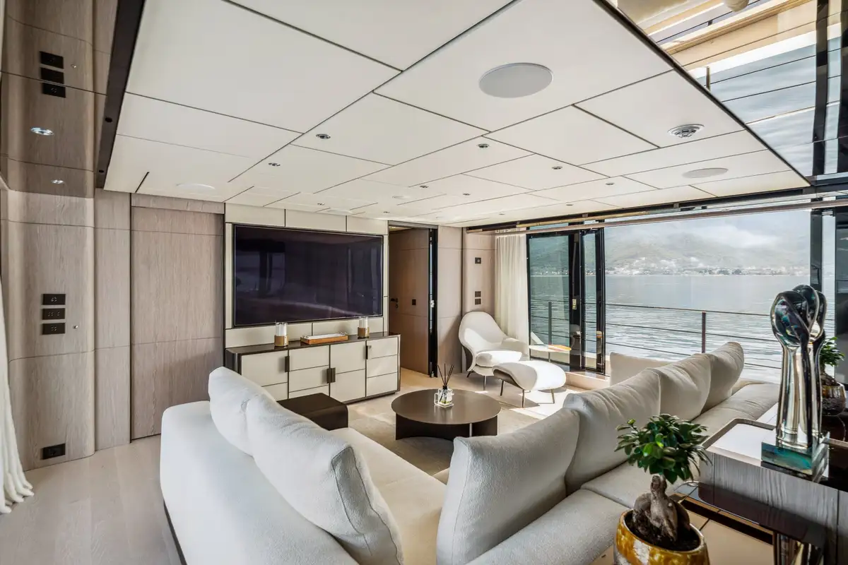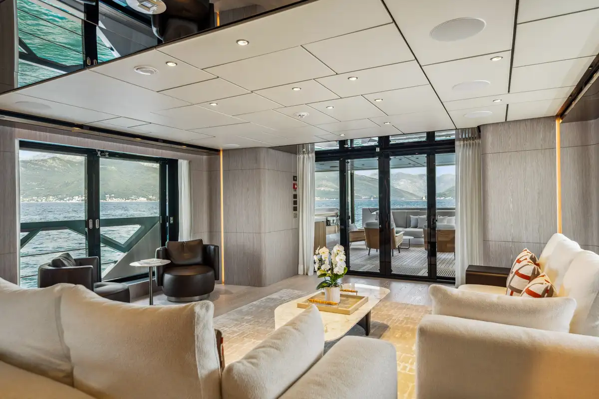 The main salon offers an elegant atmosphere, complete with a large L-shaped couch and a floor-to-ceiling sliding door that opens to a fold-down balcony. This unique feature blurs the line between indoor and outdoor living, creating a seamless flow to her open-plan layout, where a formal dining area awaits. Above, the sky lounge offers another area for relaxation, featuring cascading glass doors that lead to a spacious aft dining deck, ensuring every moment onboard feels connected to the cruising grounds.