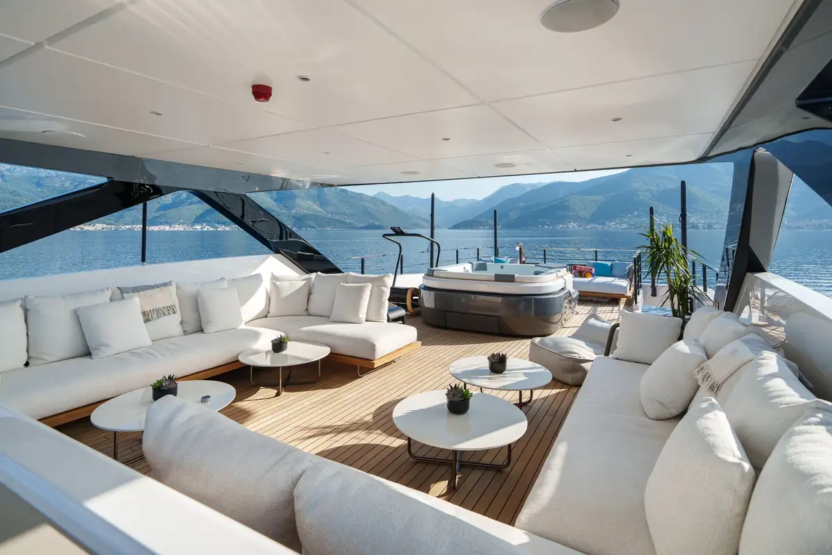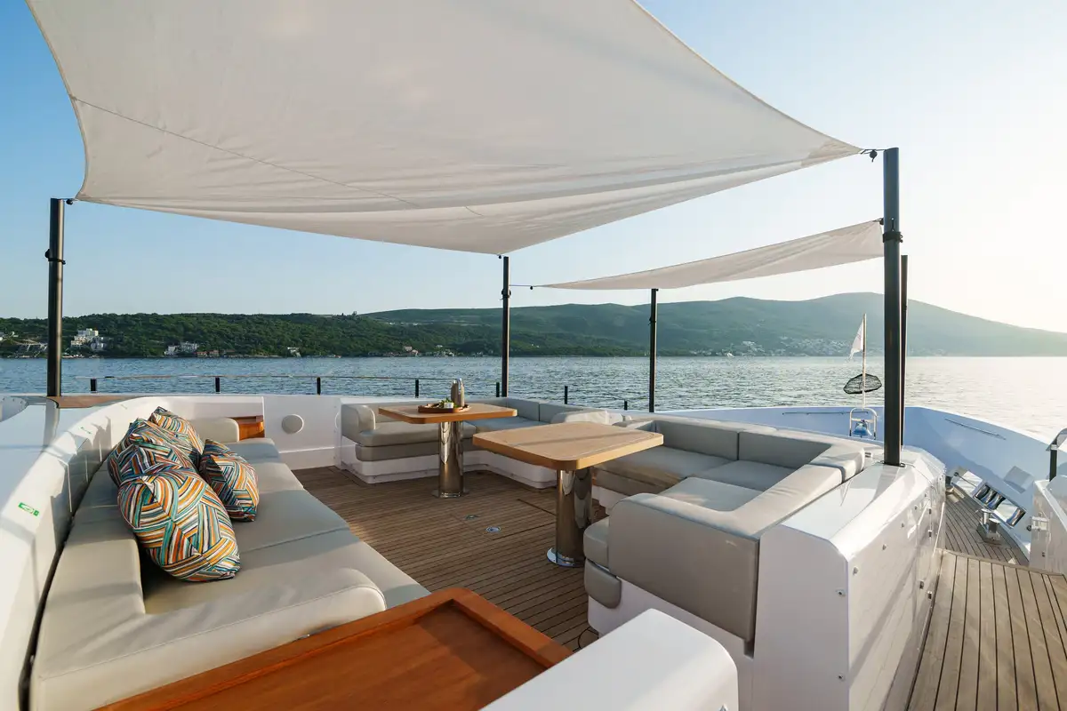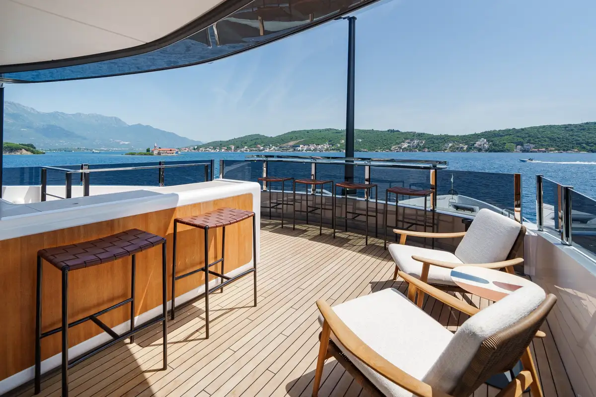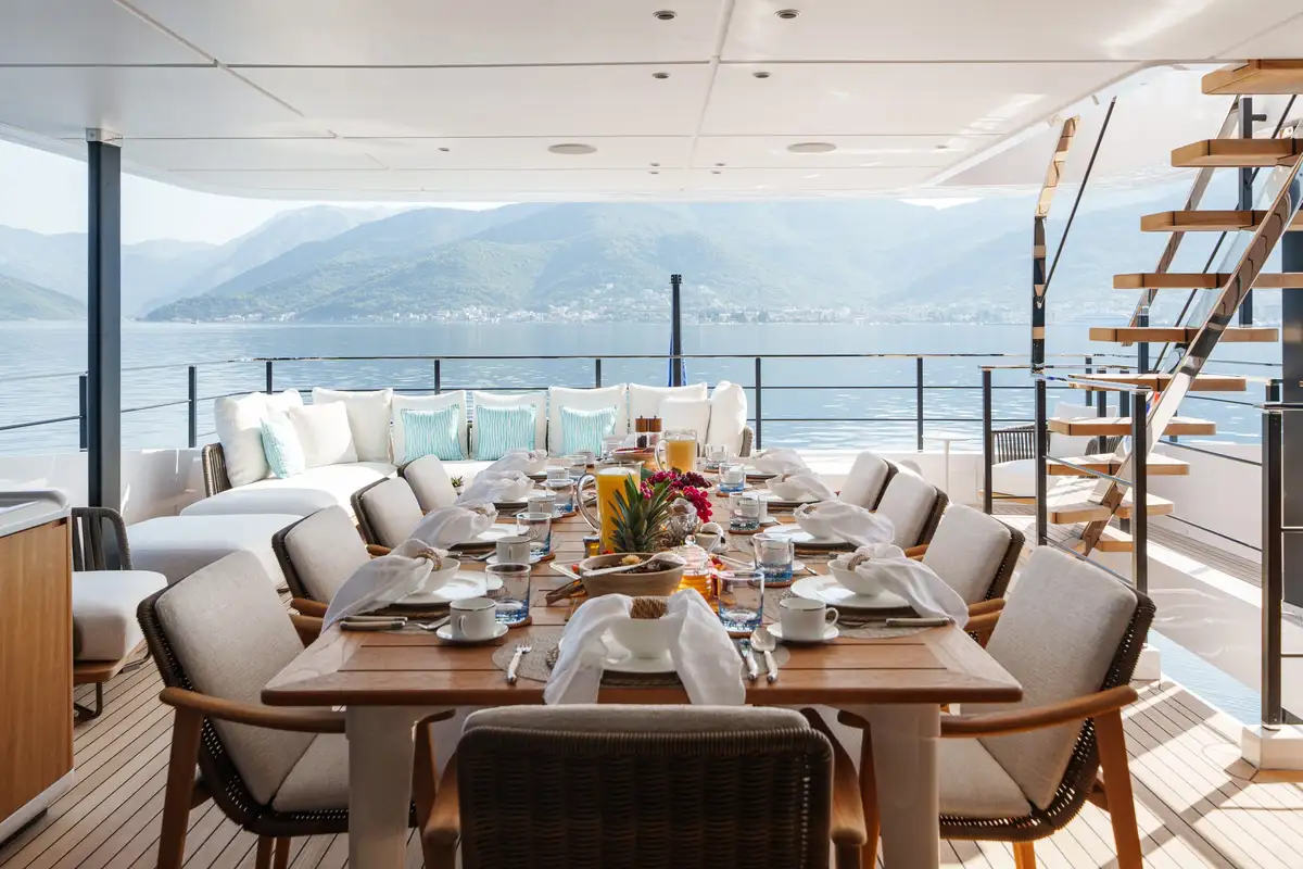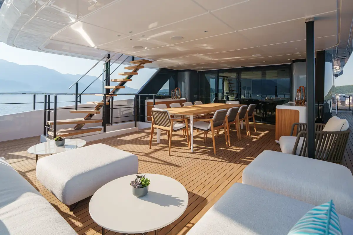 The main salon offers an elegant atmosphere, complete with a large L-shaped couch and a floor-to-ceiling sliding door that opens to a fold-down balcony. This unique feature blurs the line between indoor and outdoor living, creating a seamless flow to her open-plan layout, where a formal dining area awaits. Above, the sky lounge offers another area for relaxation, featuring cascading glass doors that lead to a spacious aft dining deck, ensuring every moment onboard feels connected to the cruising grounds.