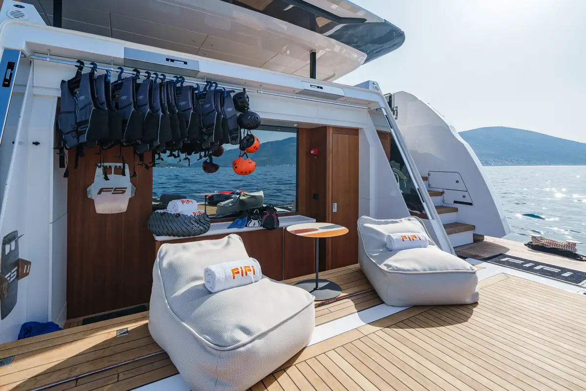 FIFI truly shines with four expansive decks offering endless opportunities for entertainment and relaxation. The sundeck is a standout, featuring a large Jacuzzi, a sit-at bar and ample lounge areas. The skylounge aft offers a large rectangular dining table comfortably seating 10, with cascading doors joining the interior with outside. The foredeck is another inviting space, with a U-shaped sofa and a large sunpad, ideal for alfresco dining or sunset views. The aft deck and swim platform extend the fun right to the water’s edge, with waterside seating and a treasure trove of toys ready for adventure.