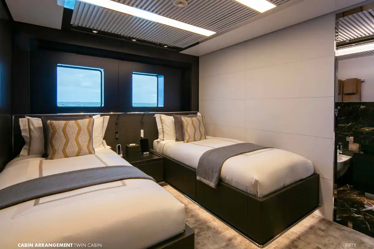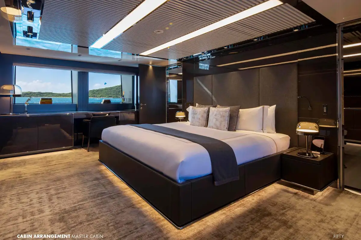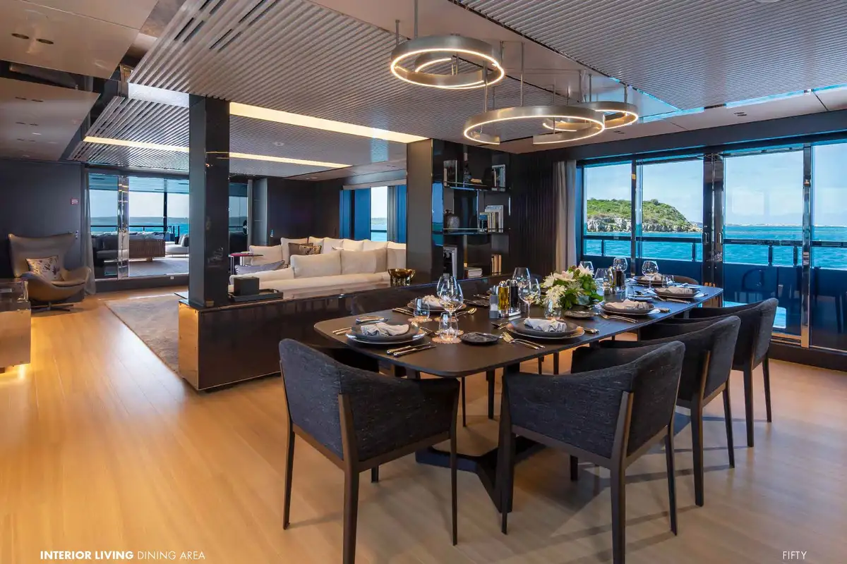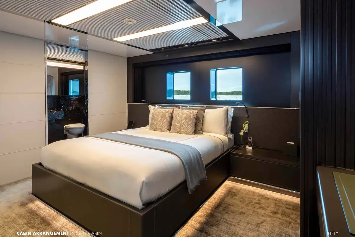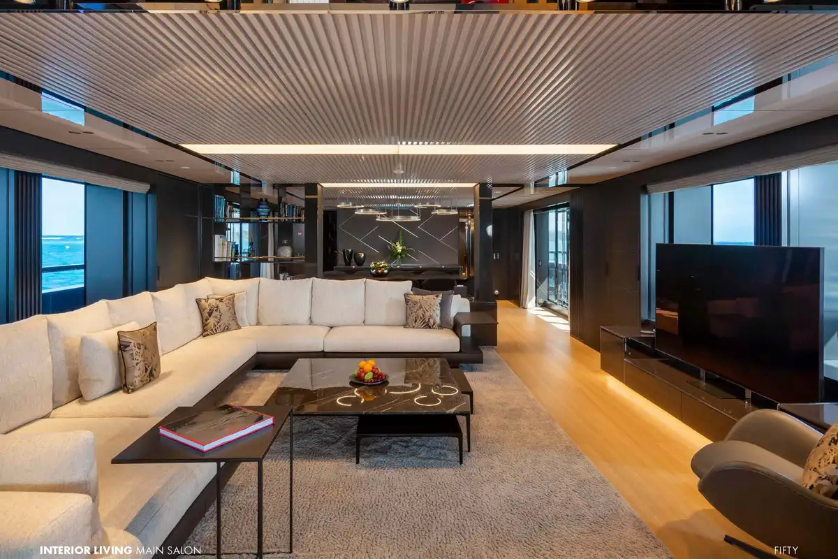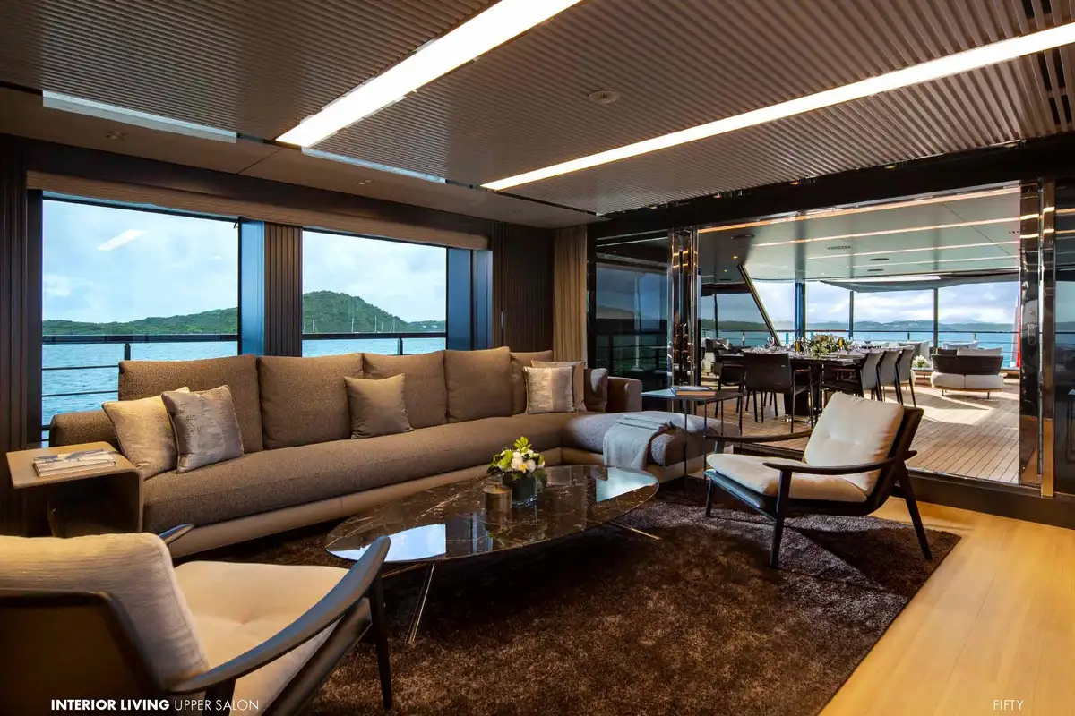 Inside, FIFTY channels the elegance of a luxury penthouse. Calming, contemporary interiors are bathed in natural light, with panoramic views through vast windows that blur the line between inside and out. Her layout flows effortlessly from space to space, creating a relaxed and refined on board atmosphere.