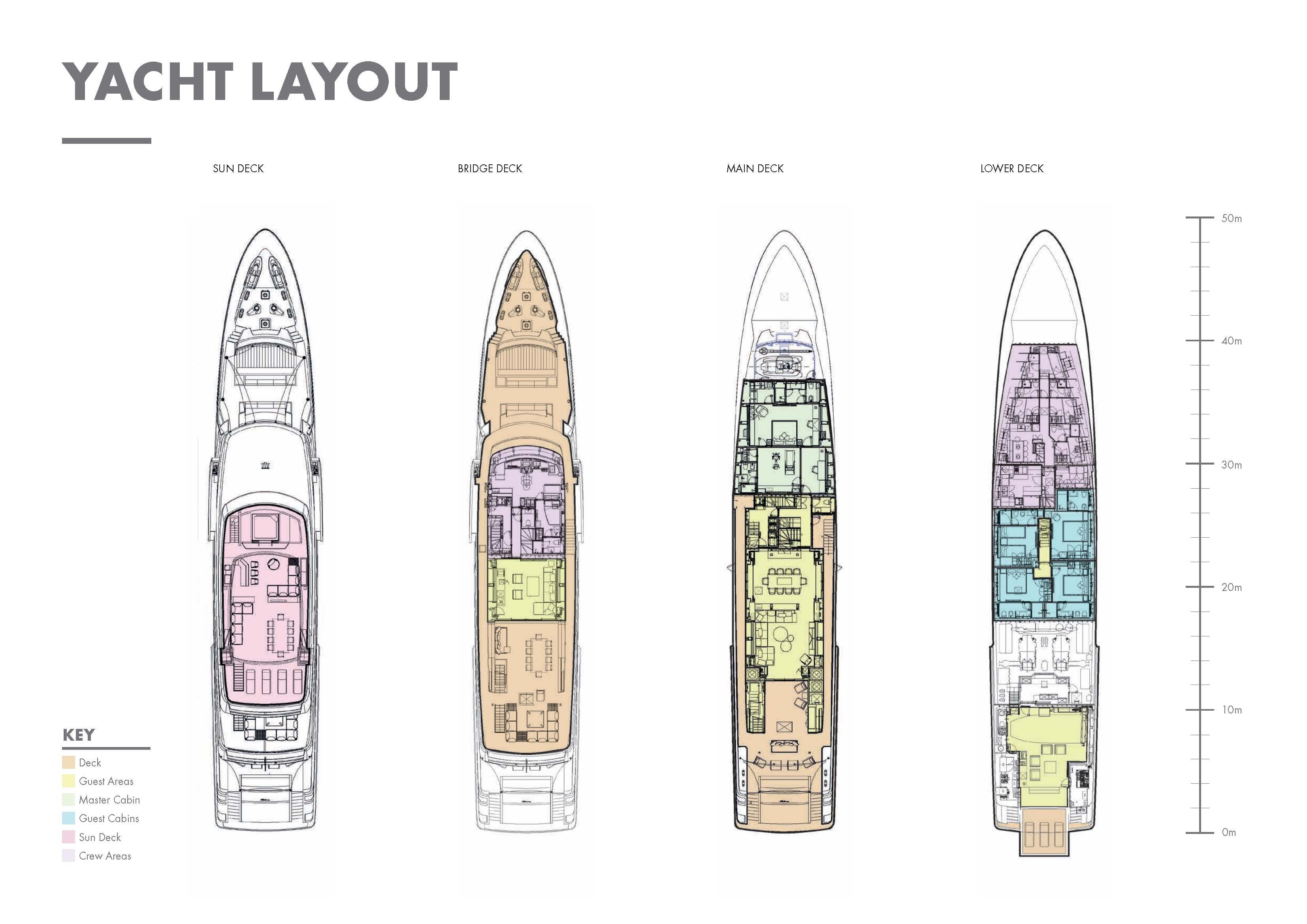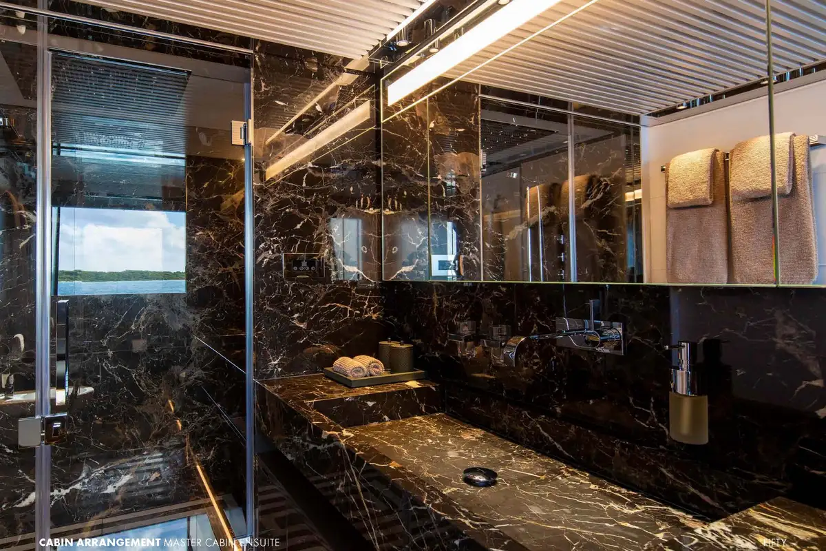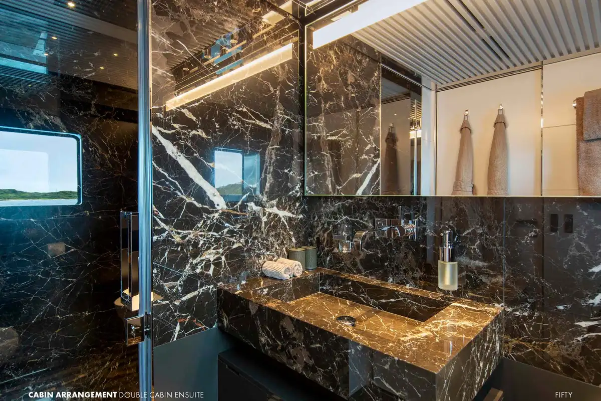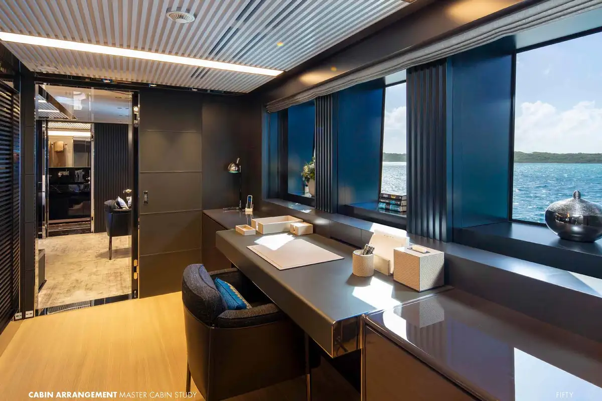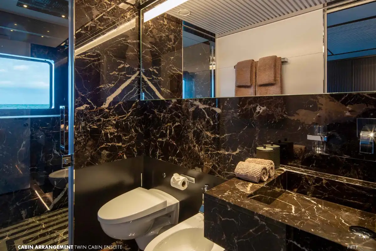 Inside, FIFTY channels the elegance of a luxury penthouse. Calming, contemporary interiors are bathed in natural light, with panoramic views through vast windows that blur the line between inside and out. Her layout flows effortlessly from space to space, creating a relaxed and refined on board atmosphere.
