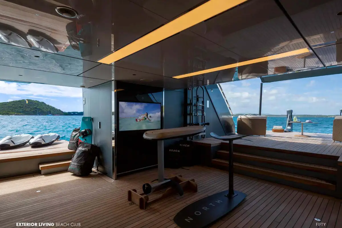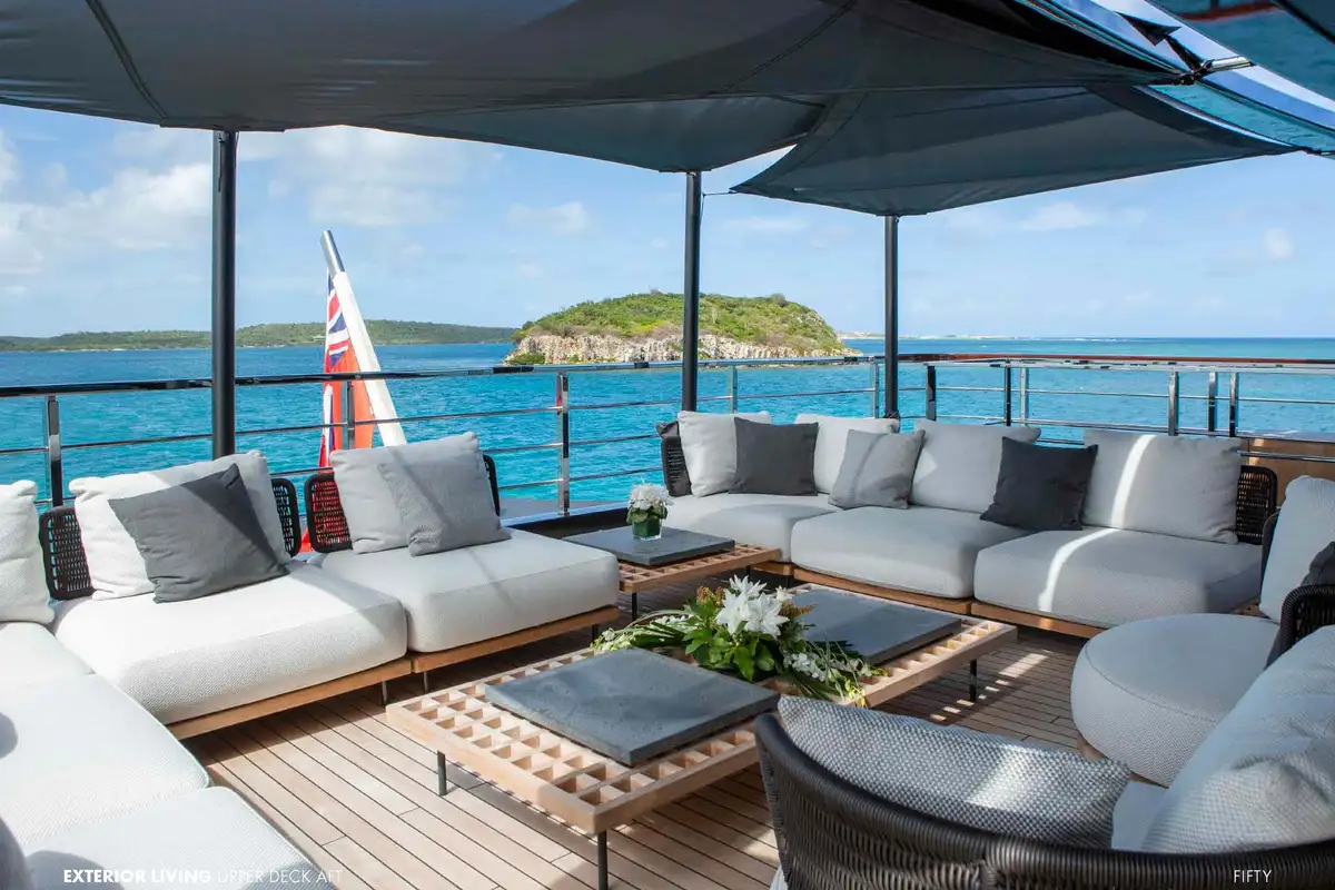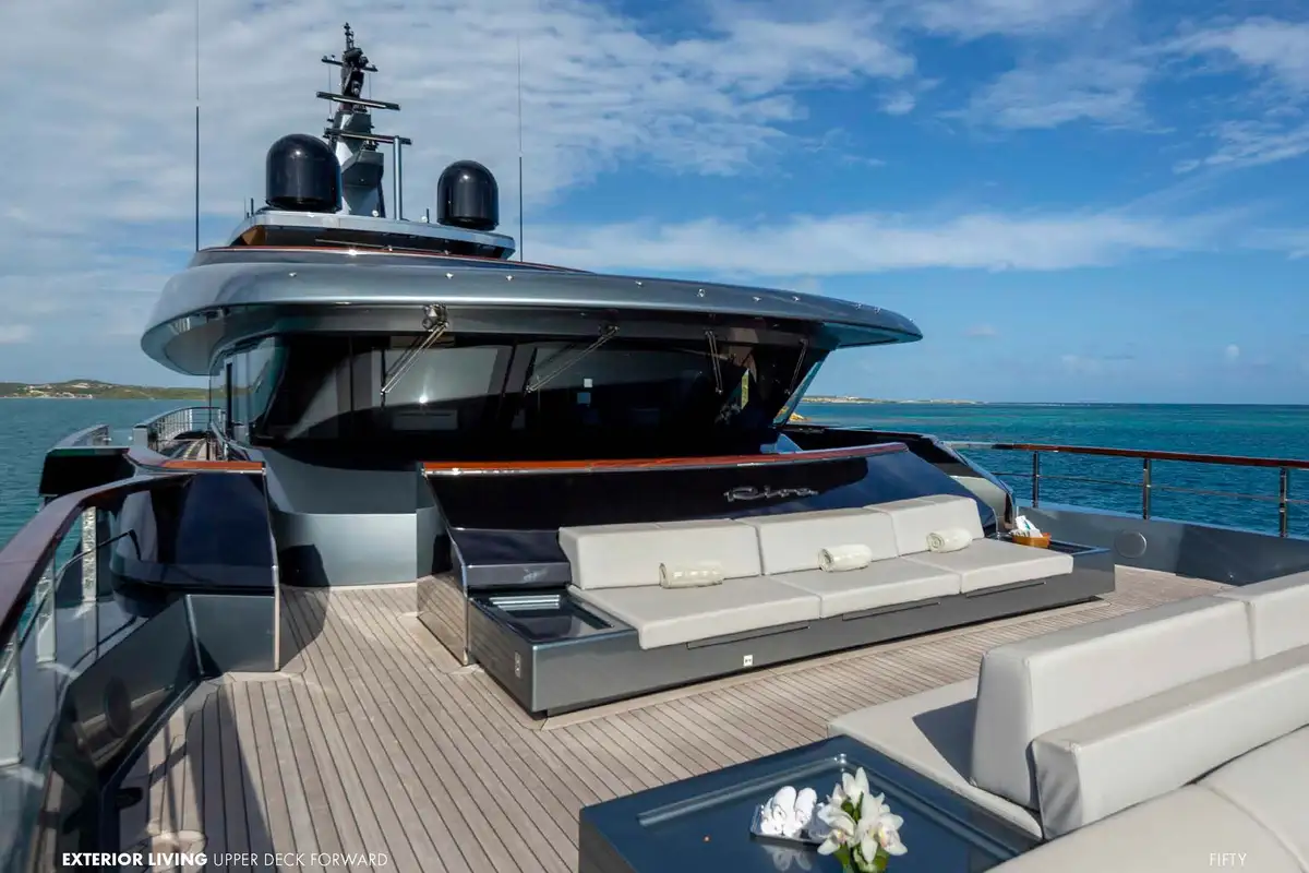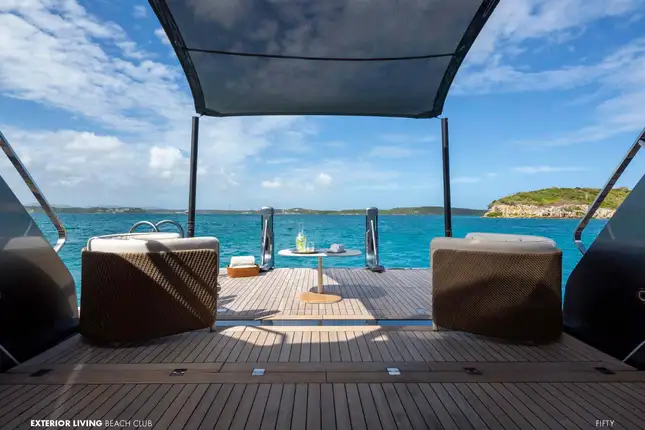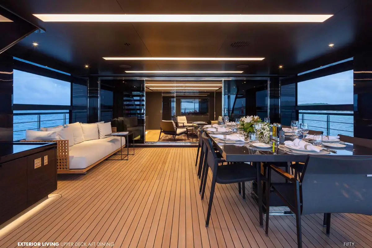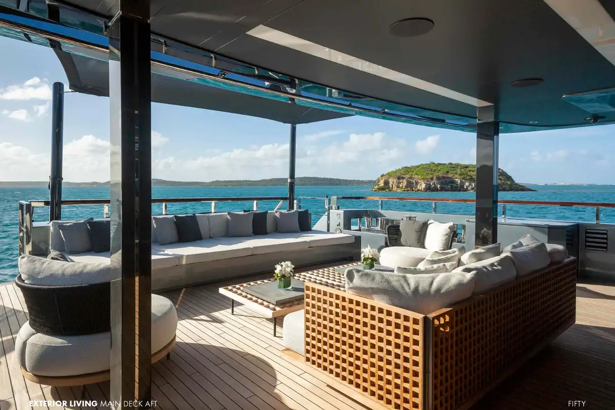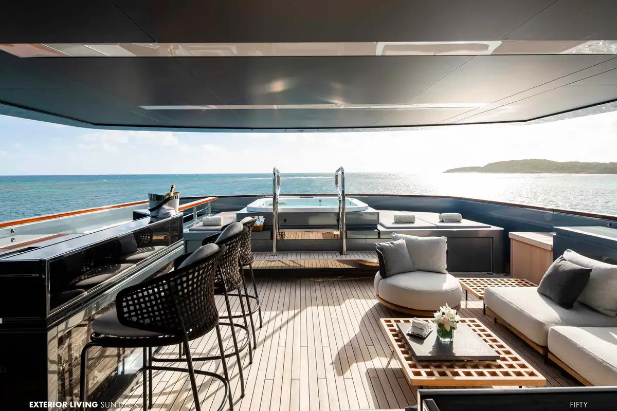 With a variety of deck spaces, FIFTY offers multiple ways to relax, dine, and entertain. The expansive sun deck features a large dining area, bar, BBQ, sunloungers, and a jacuzzi – ideal for sociable days in the sun. Dine al fresco on the bridge deck aft, while forward a large sun pad and seating area invites morning coffee or sunset cocktails.