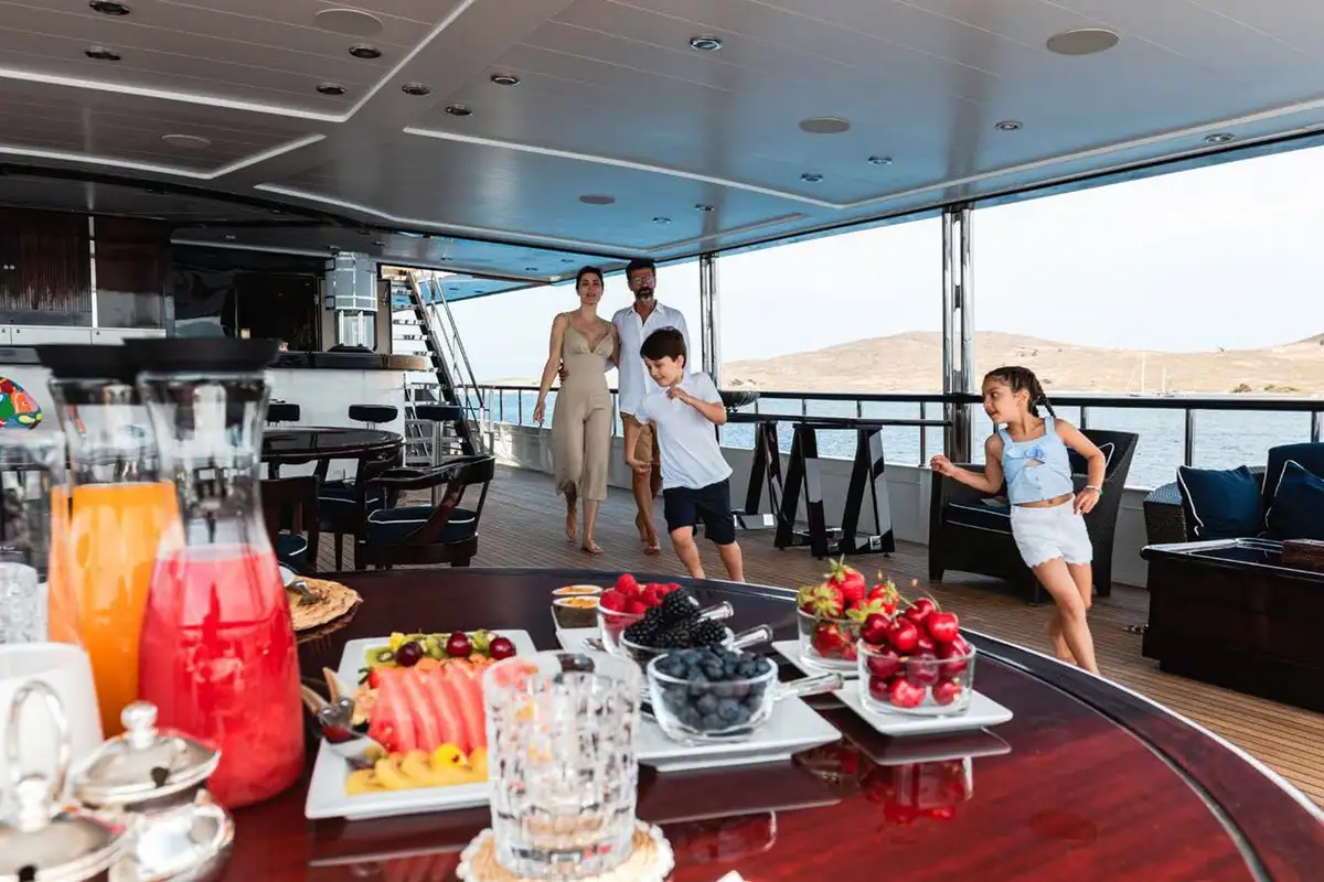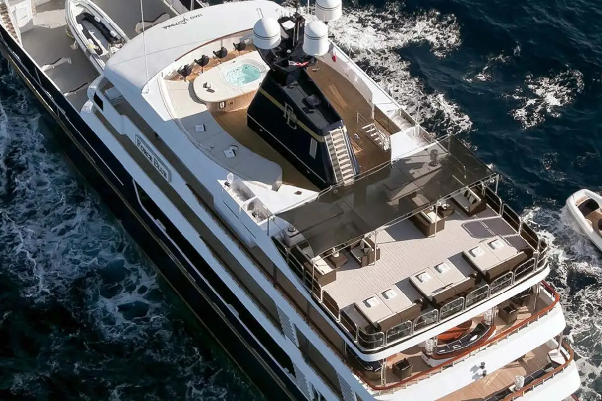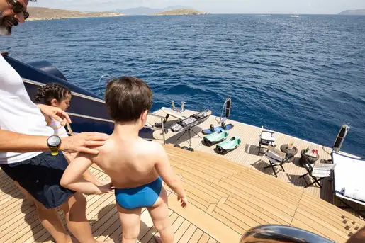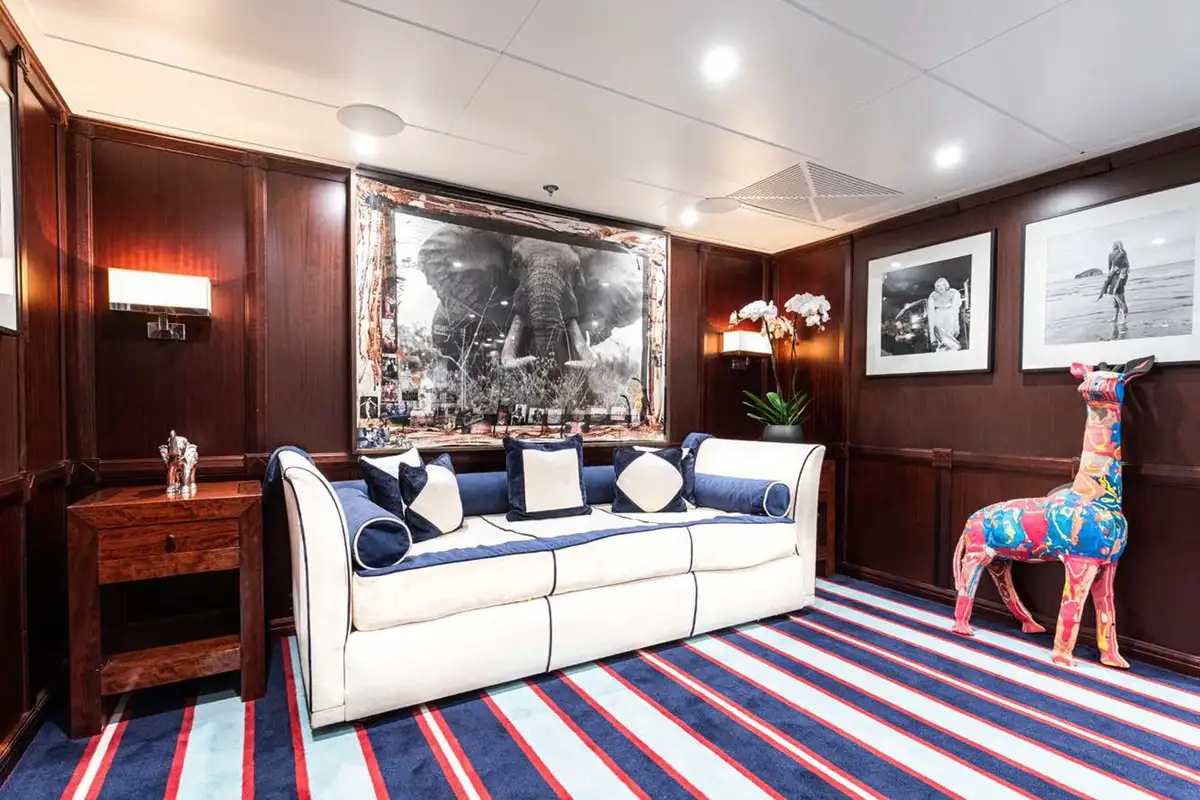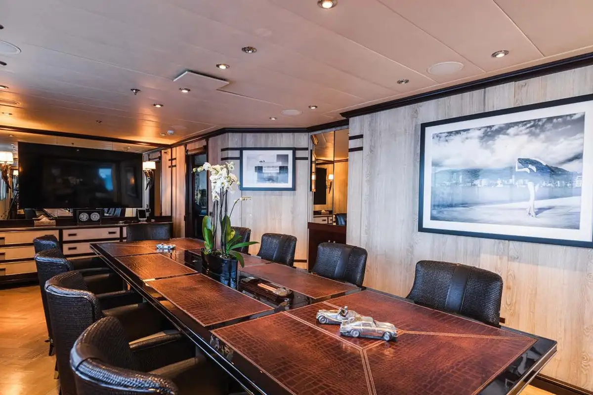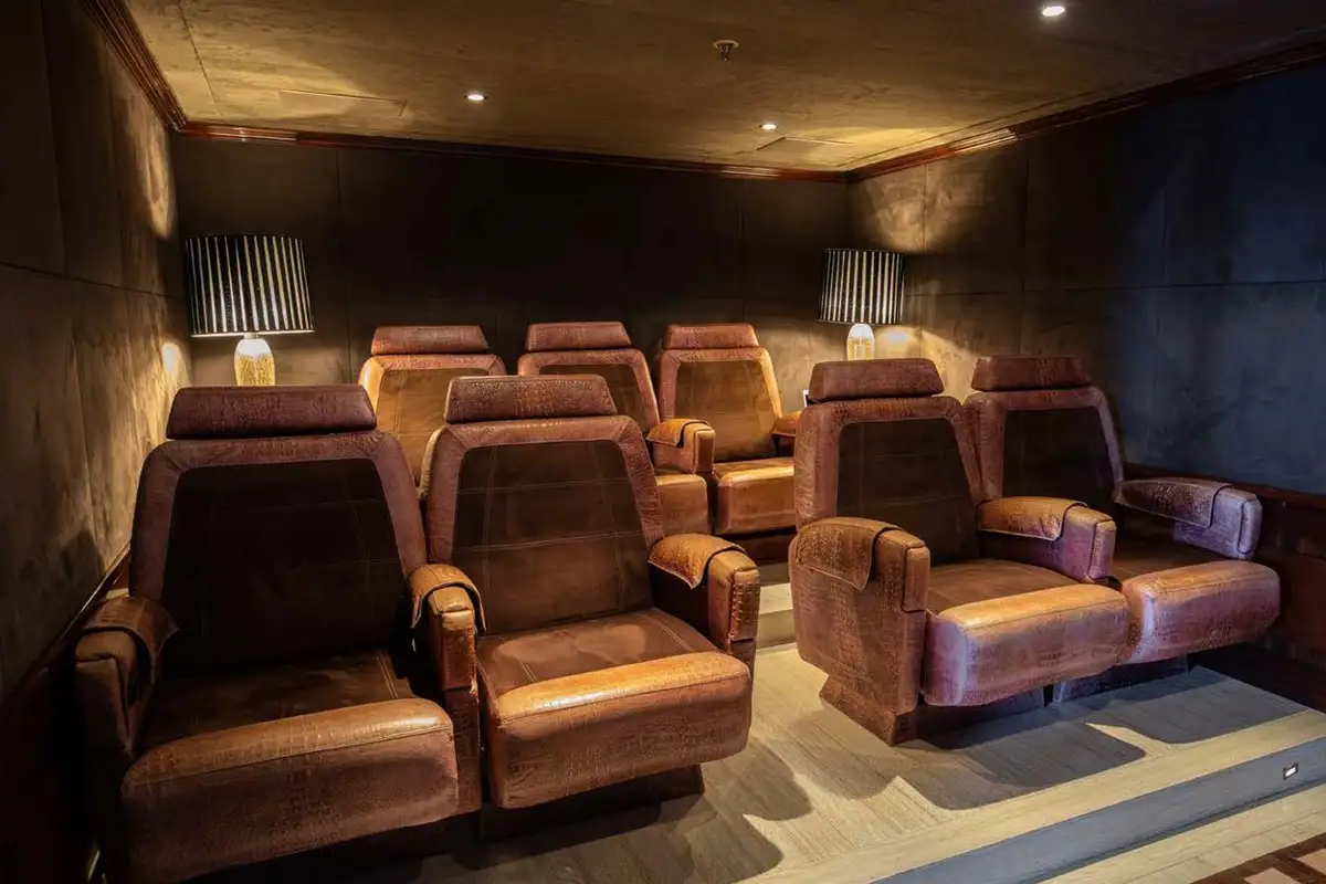 The key features of this amazing vessel include what is believed to be the largest and most comprehensively equipped spa/wellness centre on any private yacht available for charter, staffed by a professional beautician and masseuse. There’s also a large gym, a high-end movie theatre and an outdoor saloon large enough to seat up to 60 diners, which converts into a disco deck with a professional-spec DJ booth, sound system and dance floor. An elevator links the main deck with the sundeck and all other decks in between.