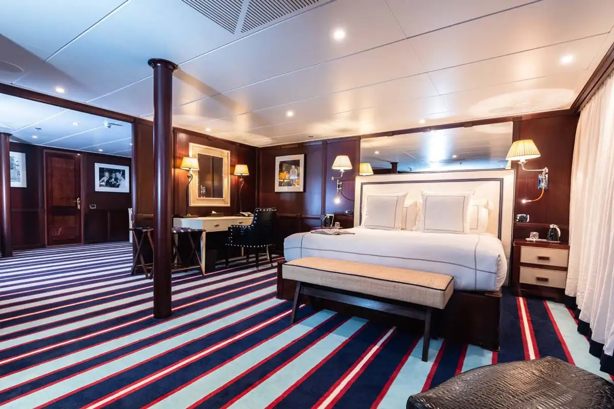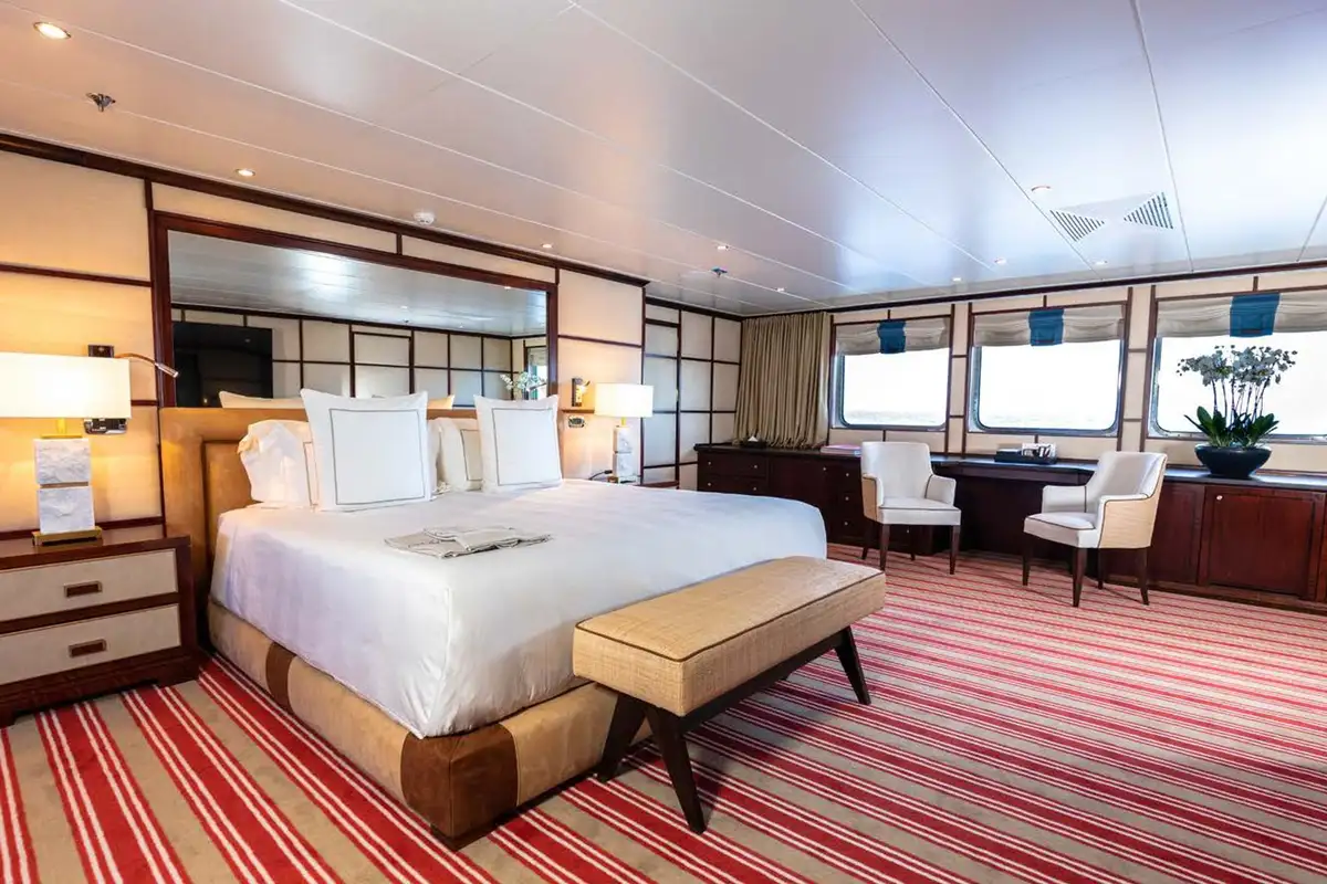 The full-beam VIP suite on the lower deck also has its own private lounge and a his-and-hers en suite bathroom with vanity and jacuzzi. The other four cabins are three large doubles with queen size beds and one twin that converts into a king size double, all with full en suite facilities.