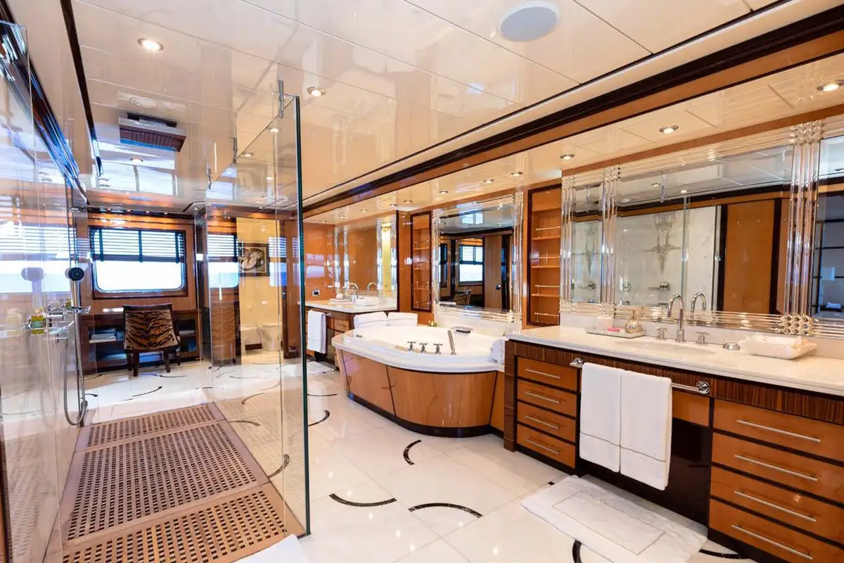 The master suite includes a huge skylounge with three separate seating areas including a cluster of sofas around a fireplace and full-beam glass doors leading out onto a private aft deck. The master cabin itself has a large dressing room en suite as well as a his-and-hers bathroom with a vanity area, a walk-through shower room and a jacuzzi tub.