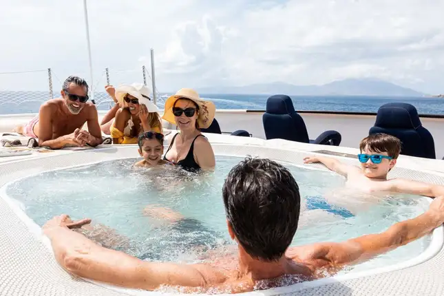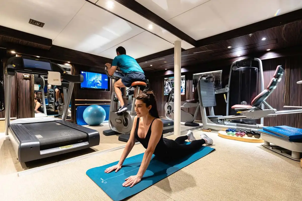 The spa, located on the lower deck, has multiple treatment rooms housing a hammam steam shower, mudbath, sauna, jacuzzi, hydro massage, massage room and hairdressing salon. The adjoining gymnasium has a full set of Technogym equipment.