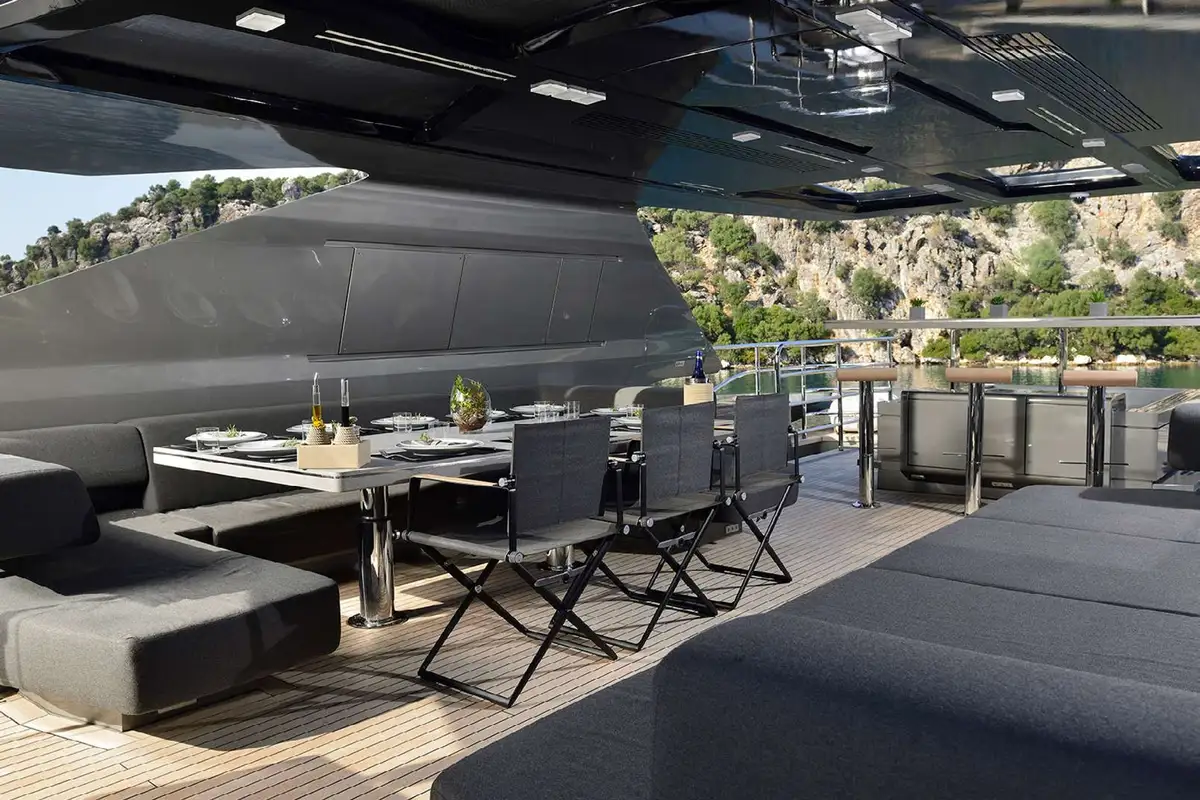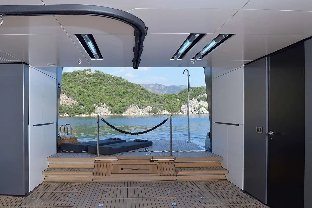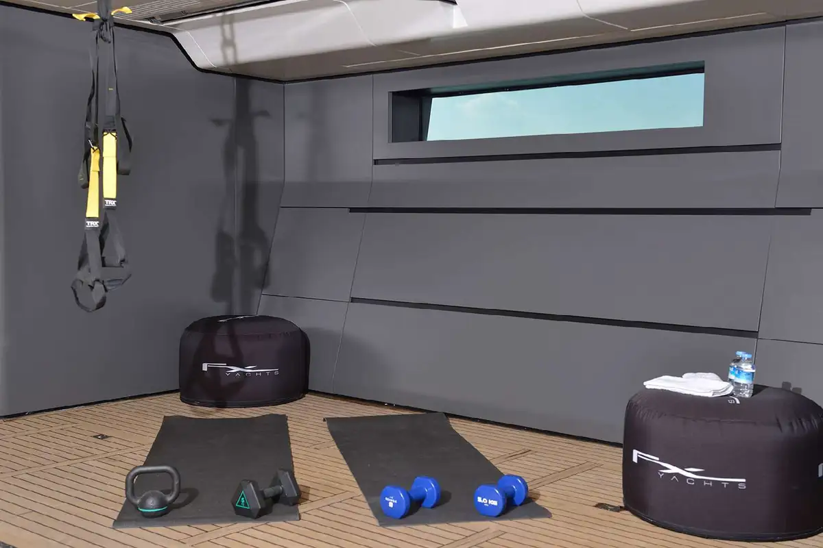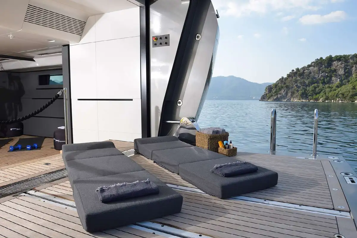 Down at the waterline, her transom folds down to provide a large bathing platform and open up the fitness studio/beach club in her stern. After working up a sweat with your daily exercise routine or completing a yoga session, you can plunge straight into the sea for a cooling dip.