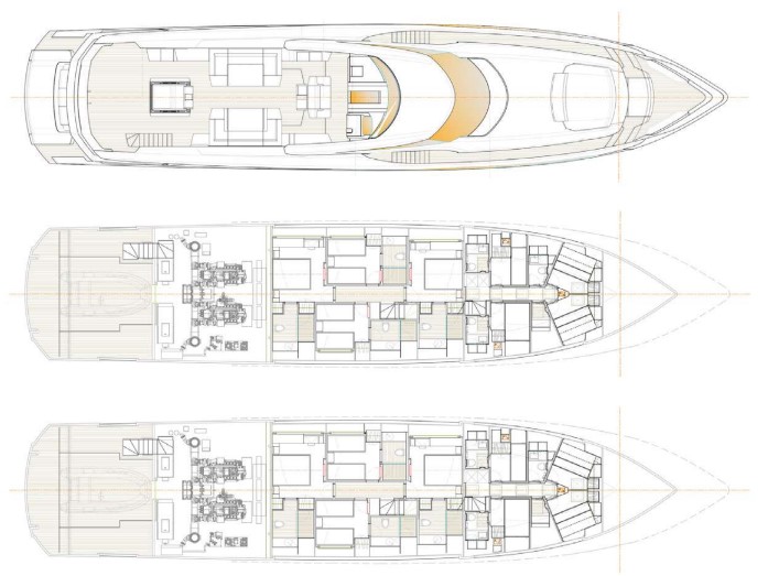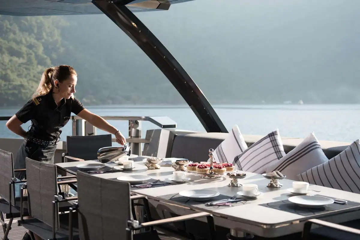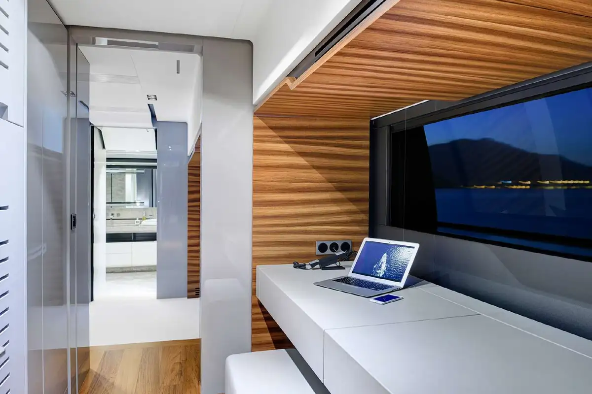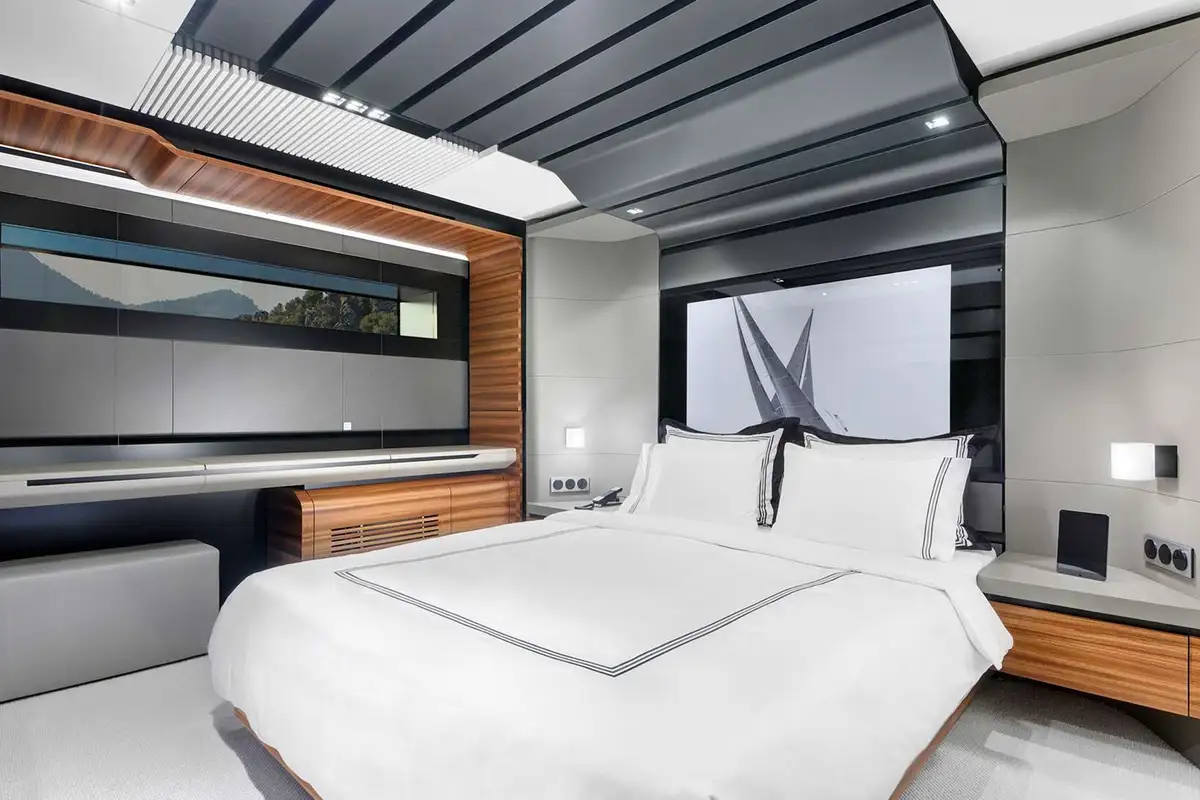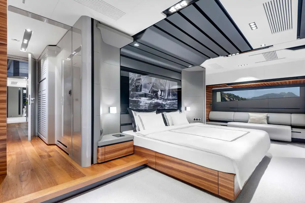Down at the waterline, her transom folds down to provide a large bathing platform and open up the fitness studio/beach club in her stern. After working up a sweat with your daily exercise routine or completing a yoga session, you can plunge straight into the sea for a cooling dip.