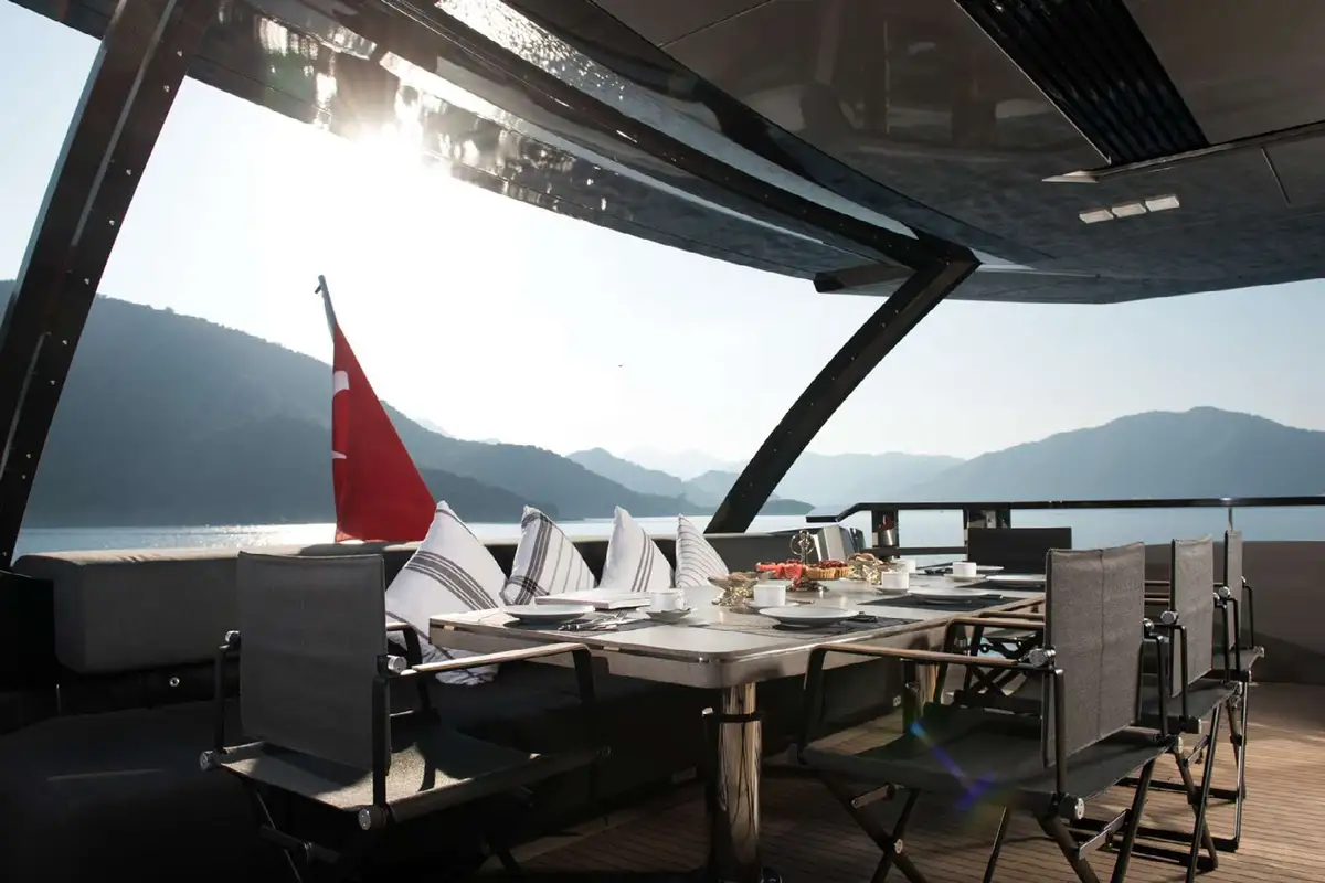 Key features on board include three separate dining areas, a notably spacious main deck lounge with plenty of natural light, and a large, comfortable and stylish sundeck with shade from a big convertible hardtop and ample space for guests to spread out and relax or gather together and party.