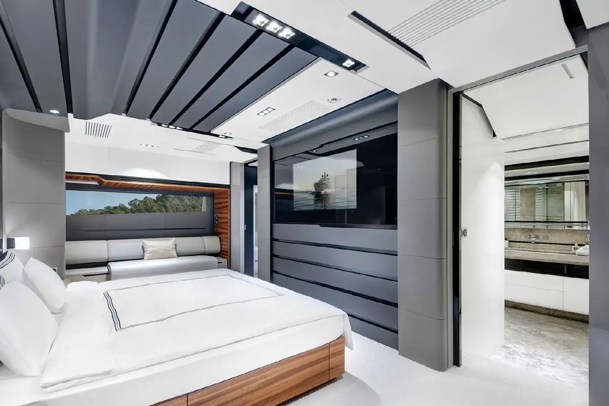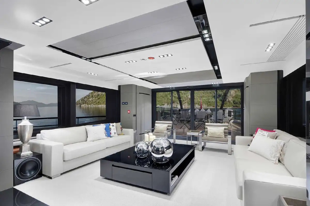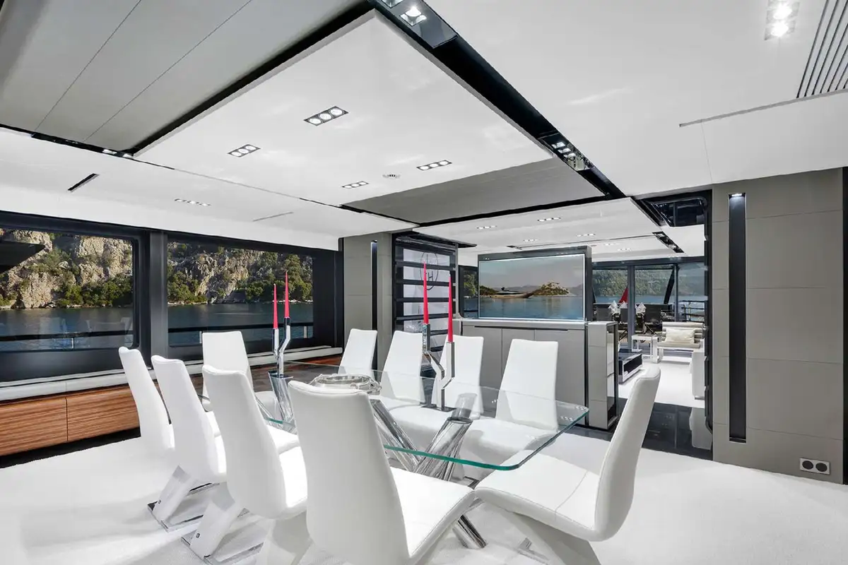 The main deck layout has an open cockpit aft with a large dining table in shade, and wide-opening glass doors leading into the lounge where you’ll find a sociable lounge with an impressive sound system and a modern minimalist dining space, with an open plan layout and a nice degree of separation between these two zones.
