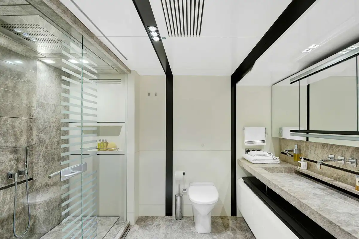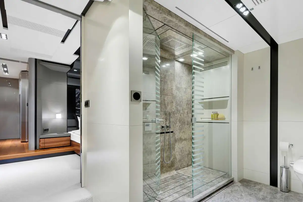 Up in the bow on the main deck level is the striking master suite. An entrance hall leads into the main cabin where a sofa flanks the king size bed and there’s a stylish en suite bathroom with a full marble shower. The other guest cabins, all on the lower deck, are two VIP doubles and two twins, each with its own private en suite bathroom.