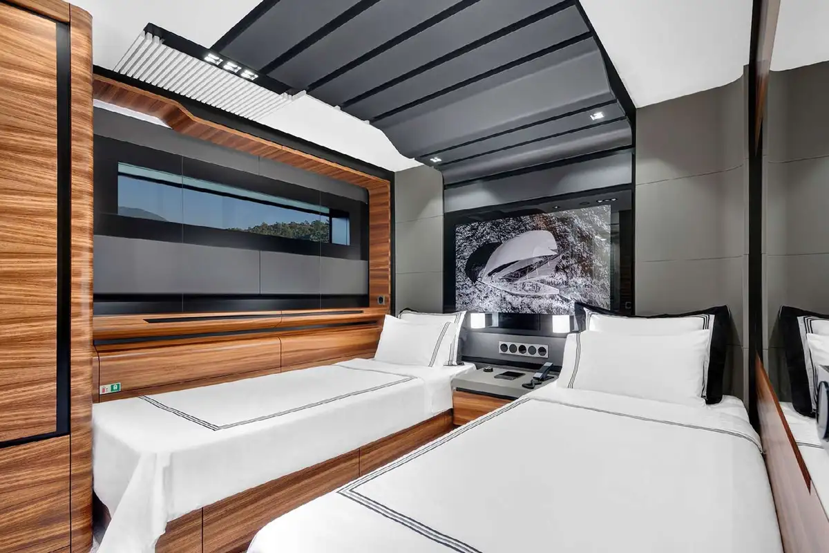 Those strong looks give a good hint of her performance – she cruises at 20 knots and can reach a top speed of 24 knots with her throttles wide open. But that doesn’t mean you’ll have a bumpy ride; on the contrary, she has stabilisers to smooth her motion both at anchor and at sea.